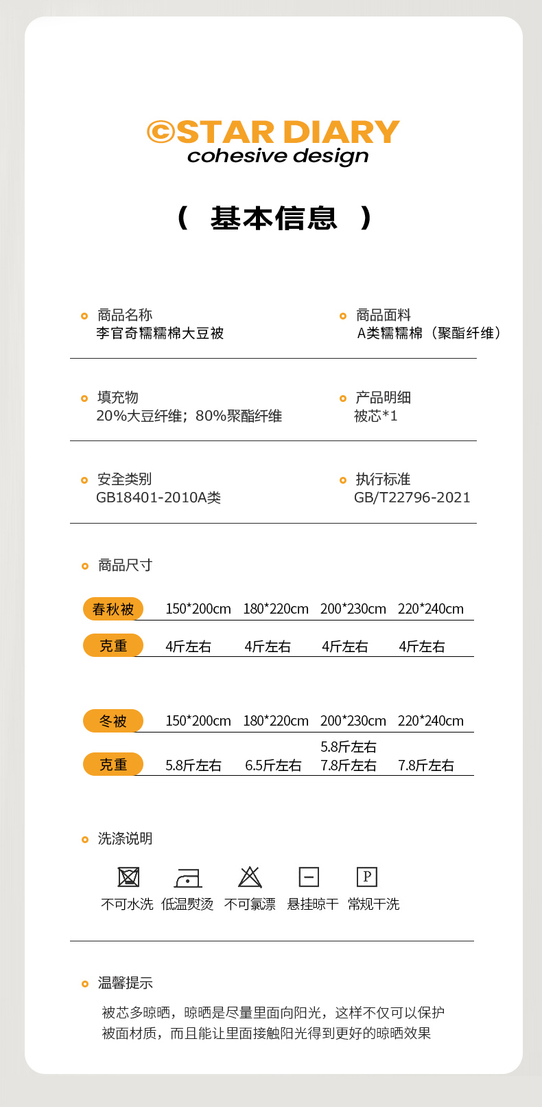 1、因为大豆被是整张大豆纤维填充,可能存在0.3斤左右误差,按国标是正常现象,介意者慎拍。