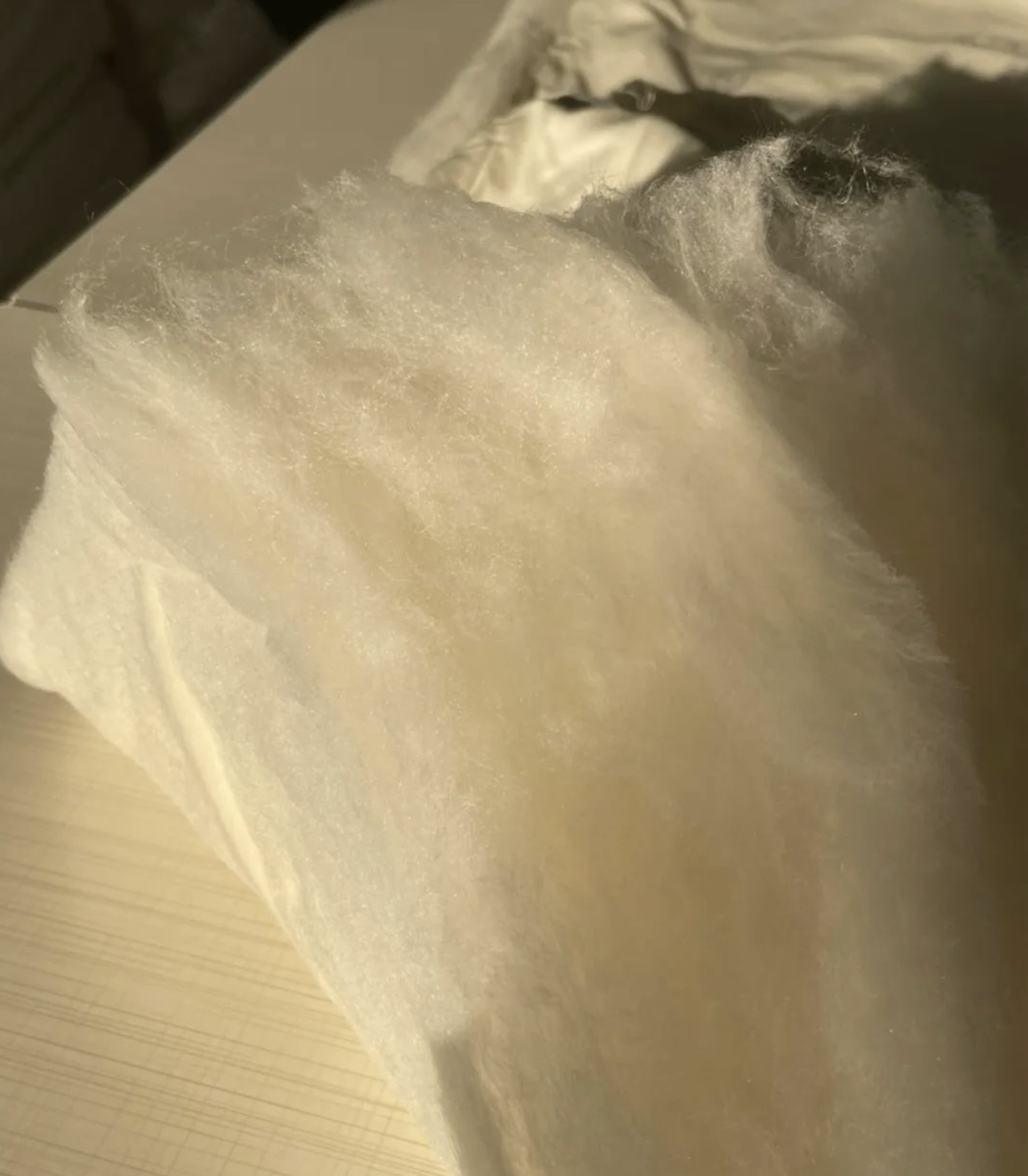 大豆被这两年很风靡,市场上产品❌质量混乱的情况不少,有很多仿冒材质,很容易出现被芯板结、散开的情况。