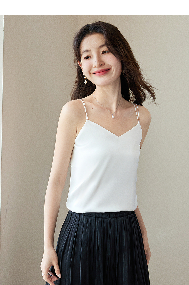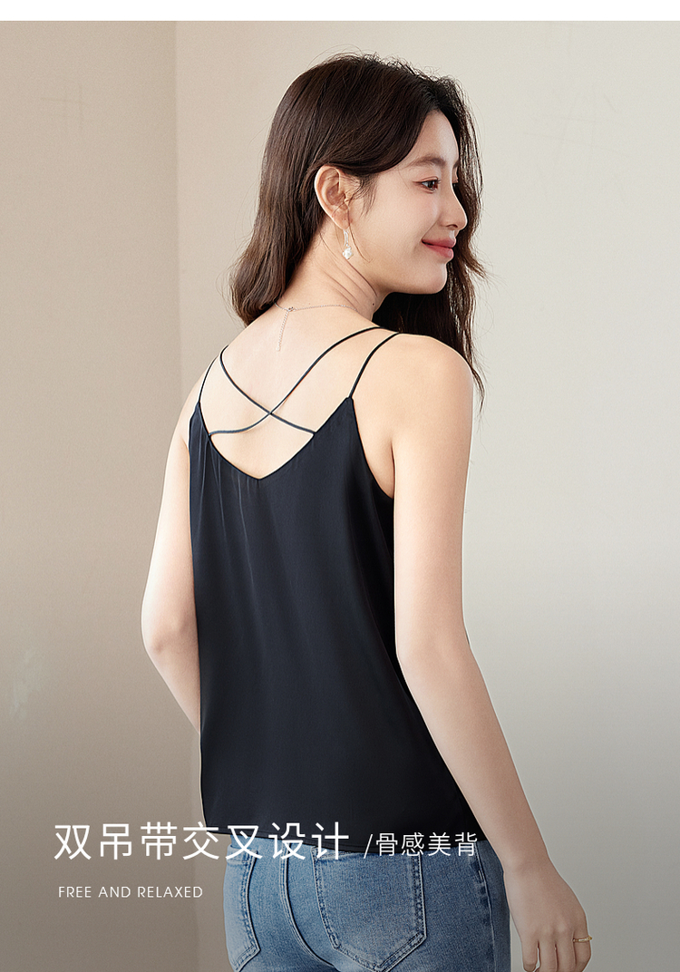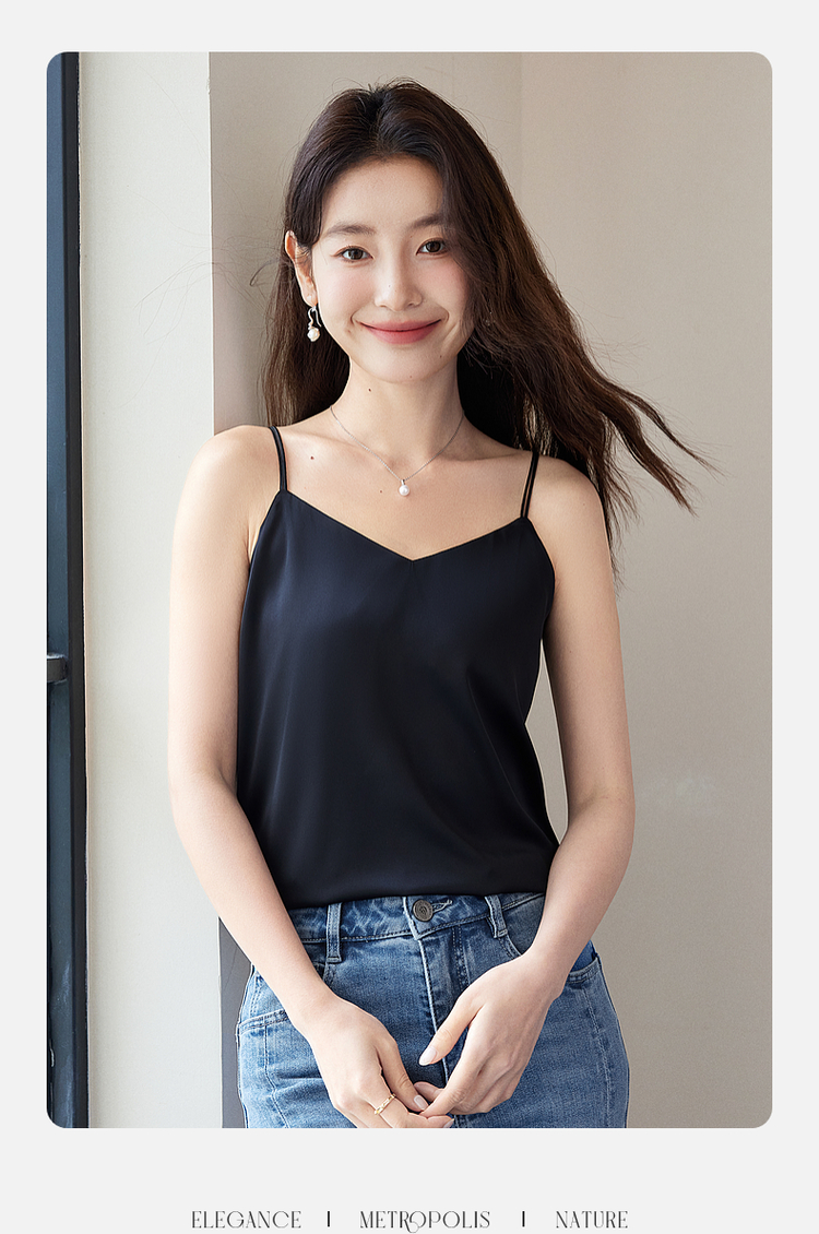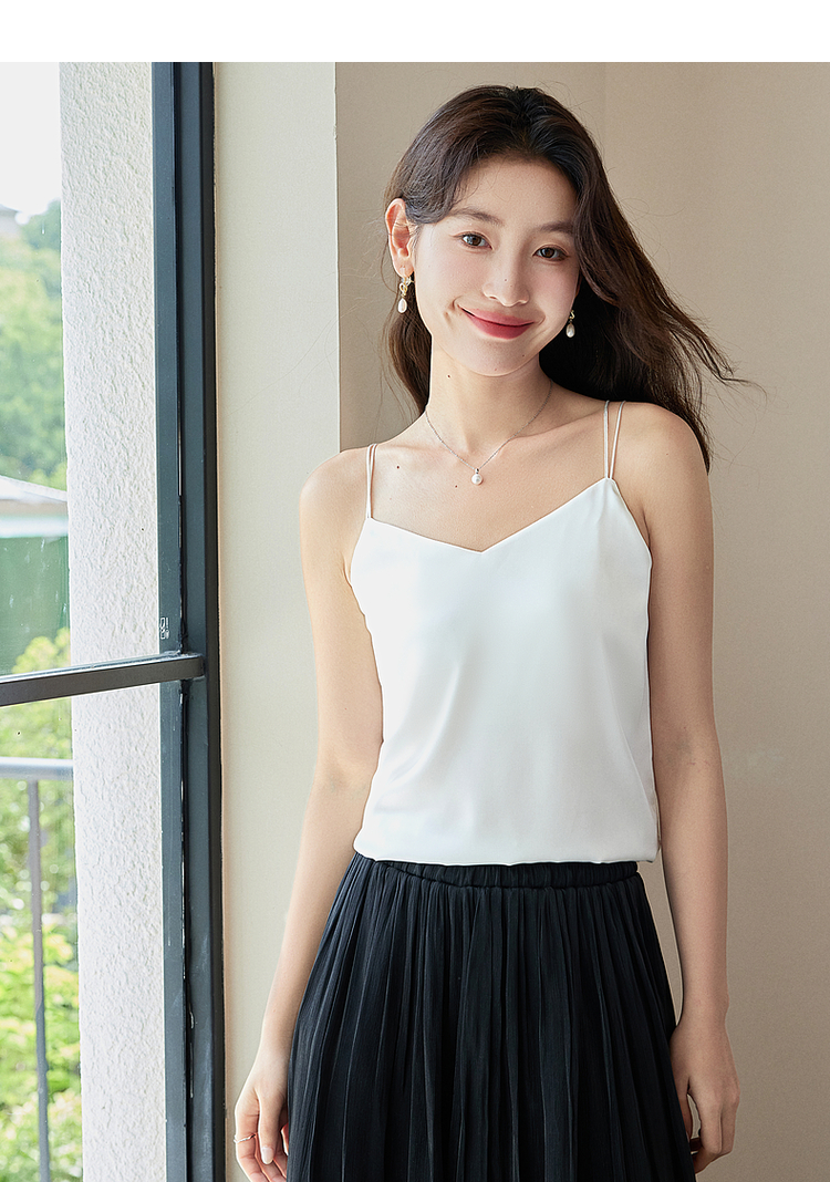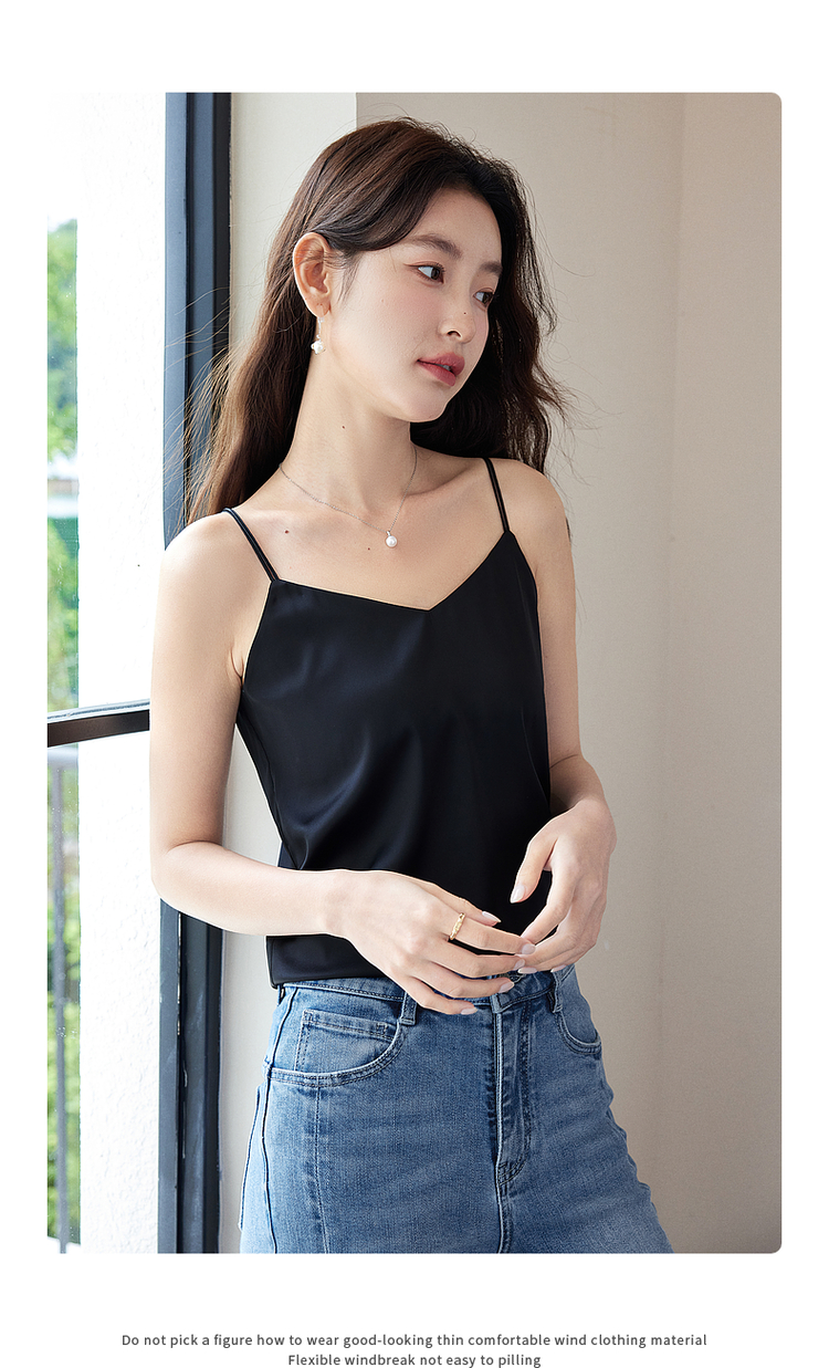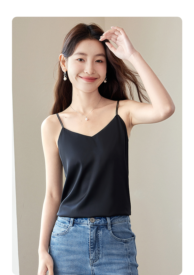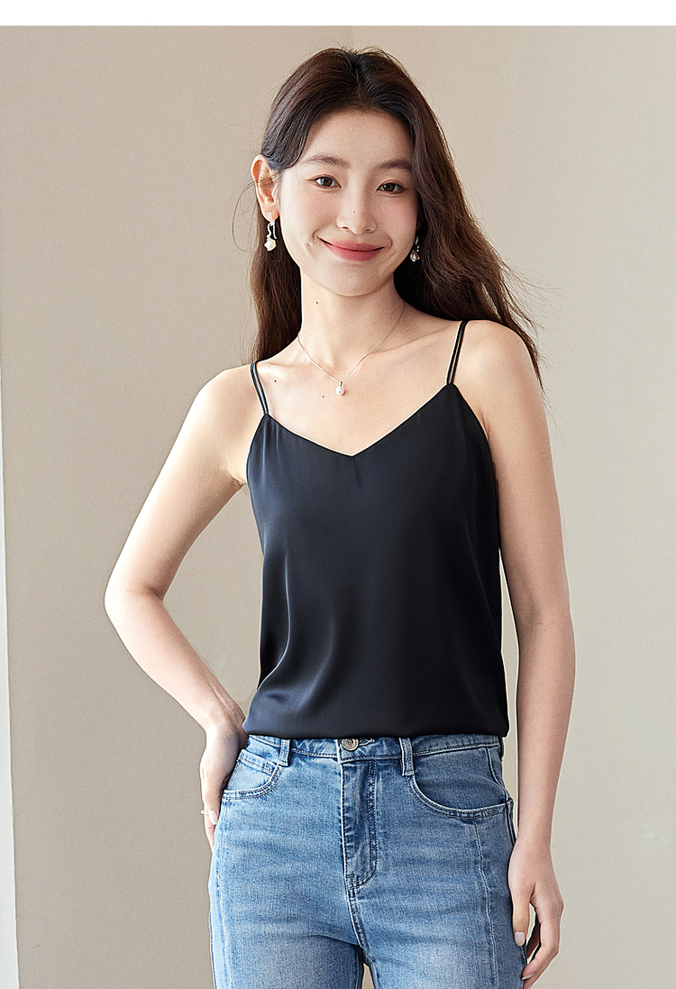 【专属特价】熙世界冰丝缎面吊带背心夏季美背外穿内搭黑白色V领打底衫上衣