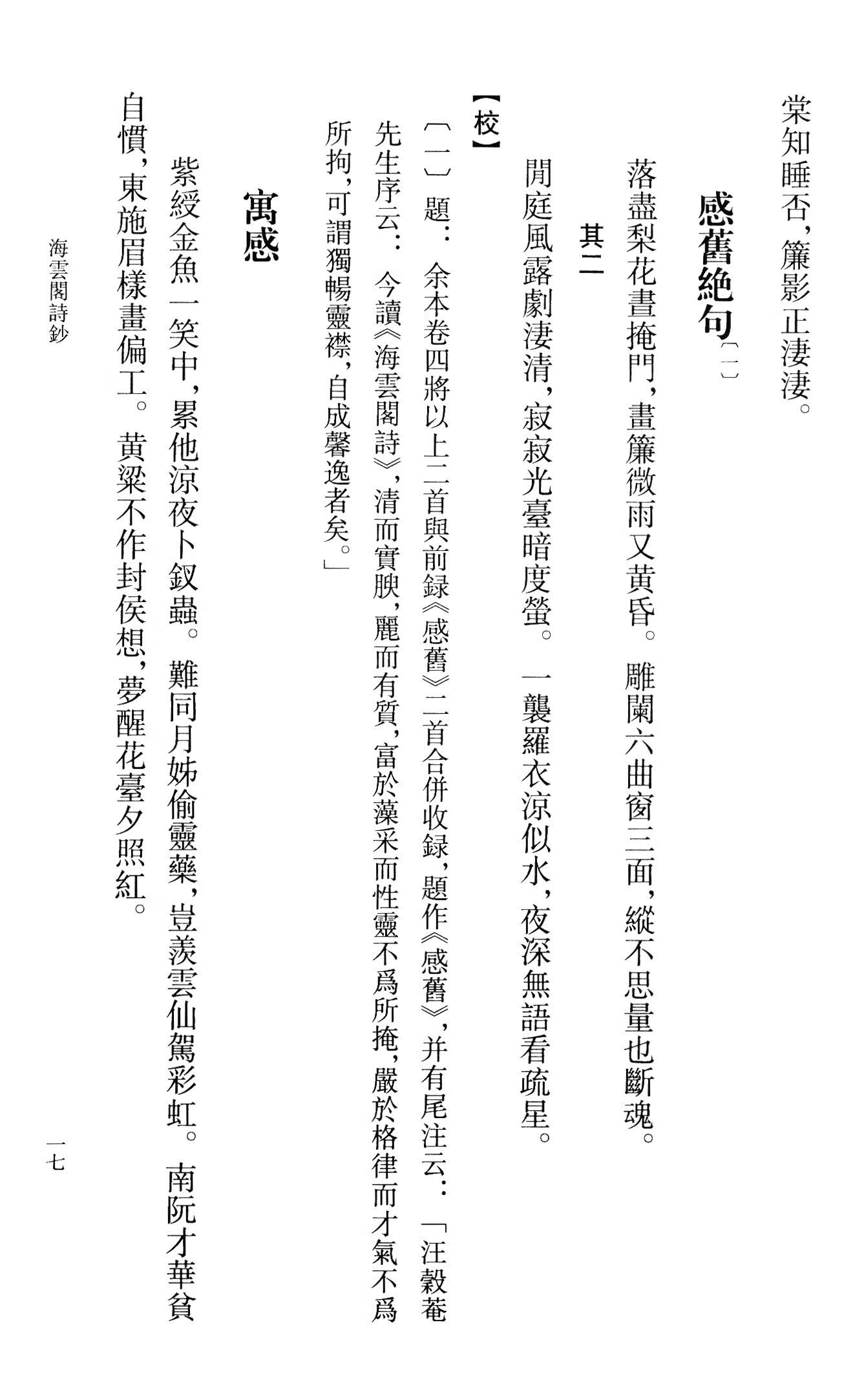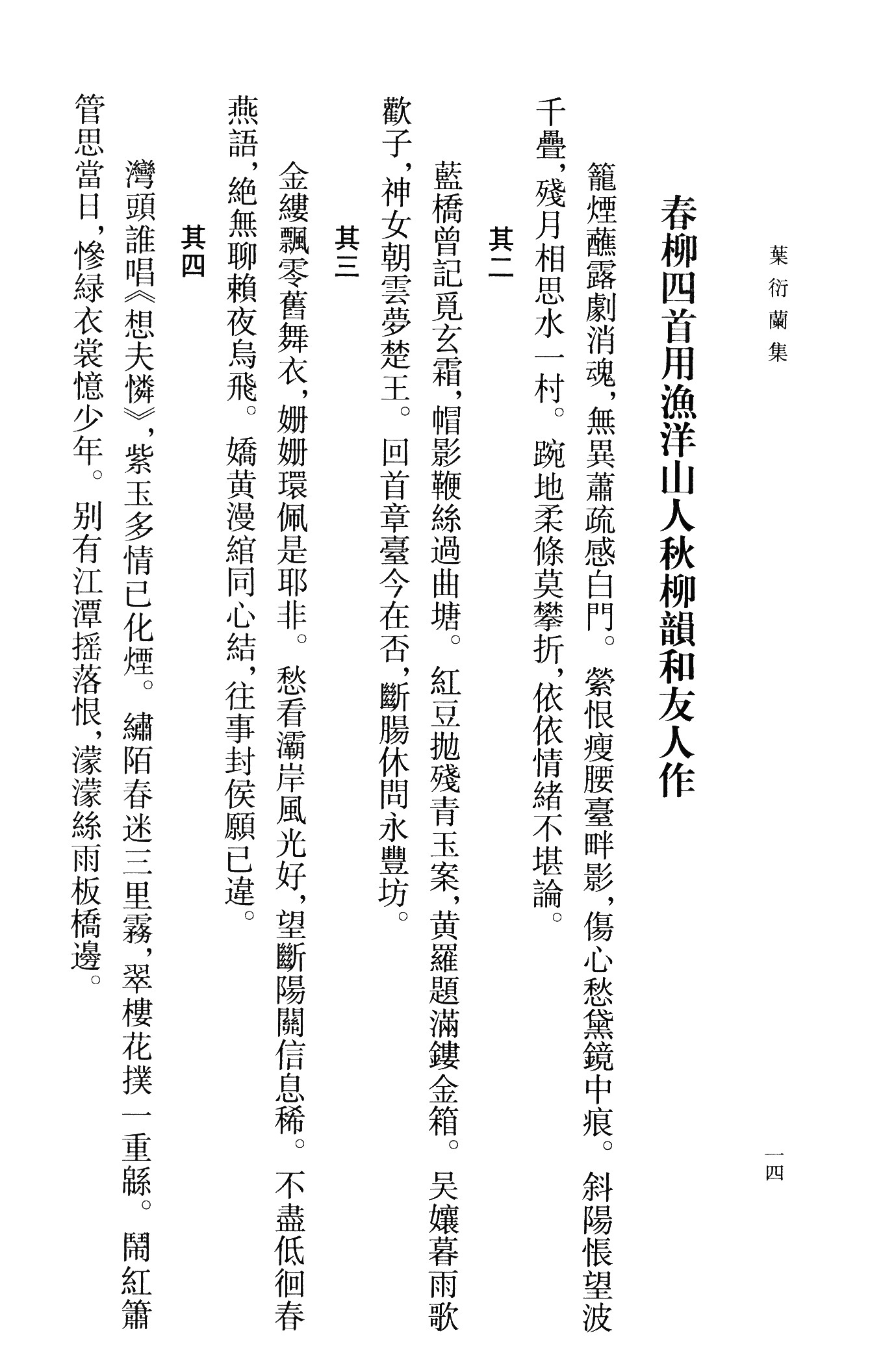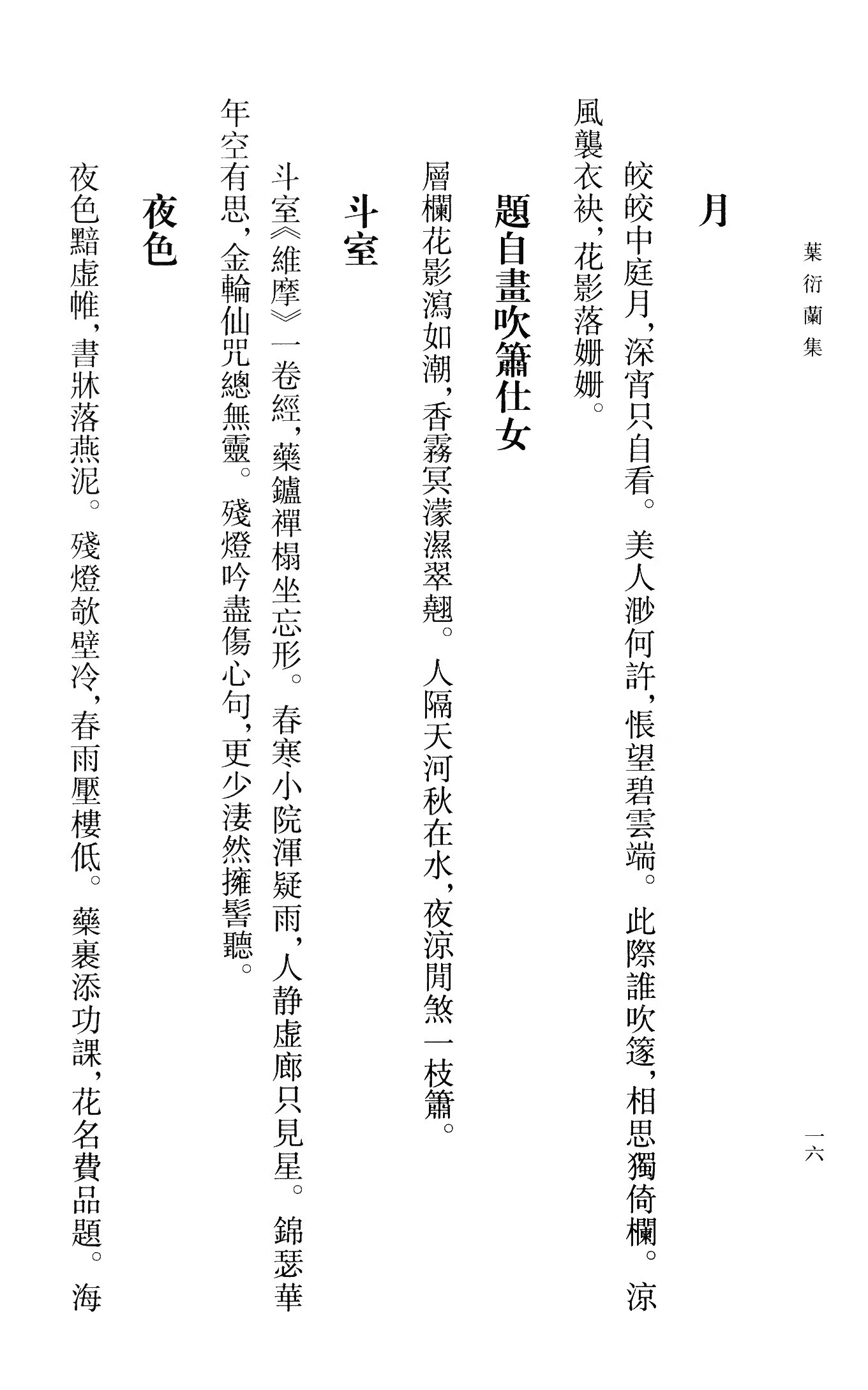 叶衍兰(一八二三-一八九七),字南雪,号兰台,剔署秋梦主人、曼伽。原籍浙江余姚,生于广东番禺(今属广州市)。咸丰二年(一八五二)中举,六年成进士,改翰林院庶吉士。散馆,授主事,分户部,考取军机章京,“儤直枢垣二十余年”。后“以忤某邸遂告归”(梁鼎芬等《番禺县续志》卷一一十),主讲越华书院。着有《海云阁诗钞》,《秋梦盒词钞》二卷、《绩》一卷、《再续》一卷,《清代学者象传》,编有《秦淮八艳图咏》、《粤东三家词钞》、《旧雨联吟》,写刻有《李长吉集》、《返生香》等。