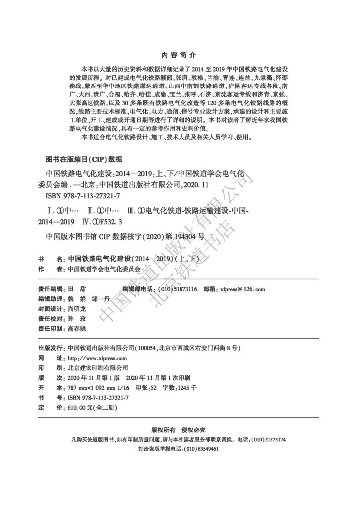 本书以大量的历史资料和数据详细记录了2014至2019年中国铁路电气化建设的发展历程,记载了已建电气化铁路赣韶、张唐、敦格、兰渝、青连、连盐、九景衢、怀邵衡线,蒙西至华中地区铁路煤运通道、山西中南部铁路通道,沪昆客运专线各段、南广、大西、贵广、合福、哈齐、哈佳、成渝、宝兰、张呼、石济、京沈客运专线和济青、京张、大张高速铁路,以及30多条既有铁路电气化改造等120多电气化铁路线路的概况,线路主要技术标准,电气化、电力、通信、信号专业设计方案,承建的设计和主要施工单位,开工、建成或开通日期等。对读者了解2014年以来我国铁路电气化建设情况具有较高的参考作用和史料价值。ꎮ