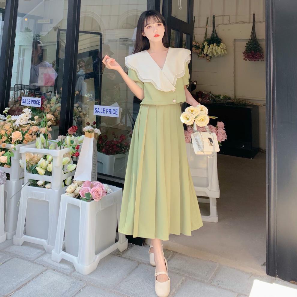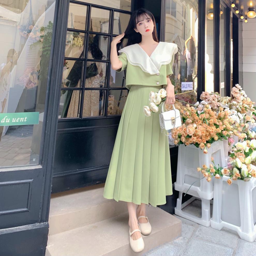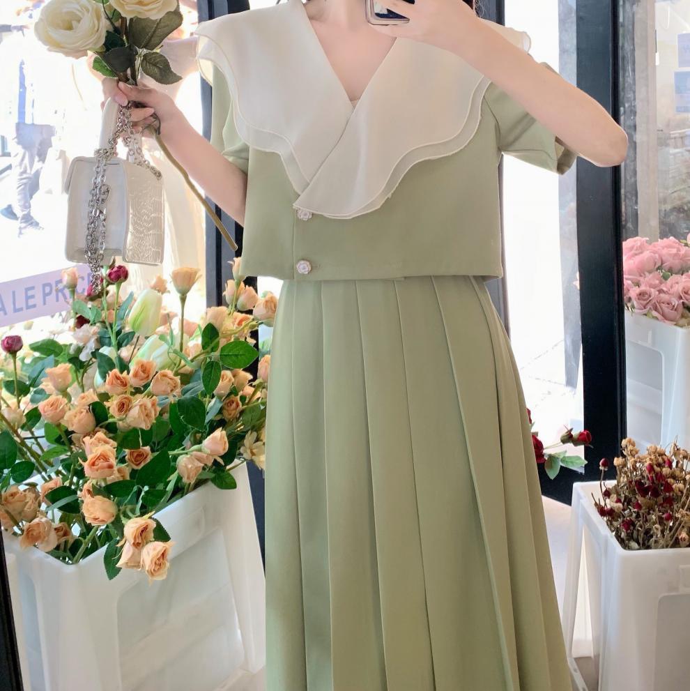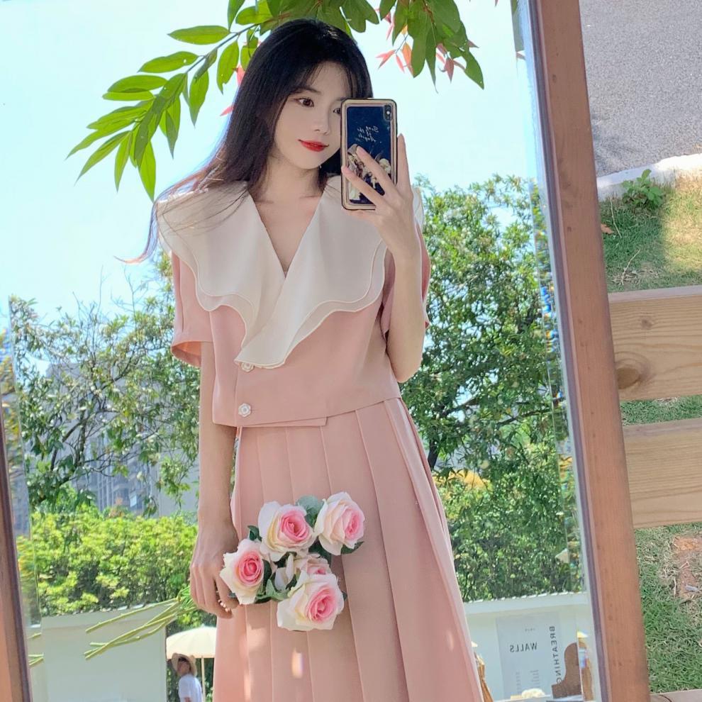 (清仓现货)【社群供G】V领荷叶边纽扣氧气短外套+高腰显瘦百褶半身裙