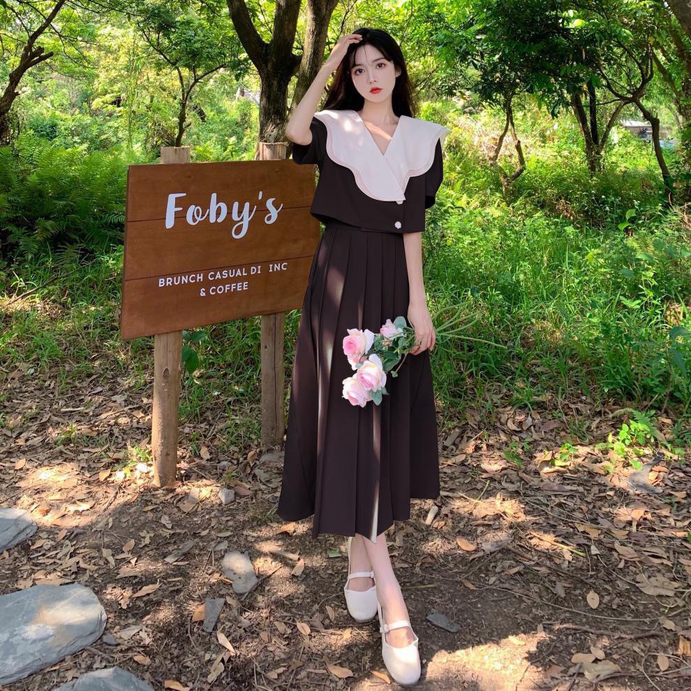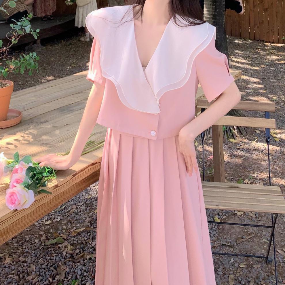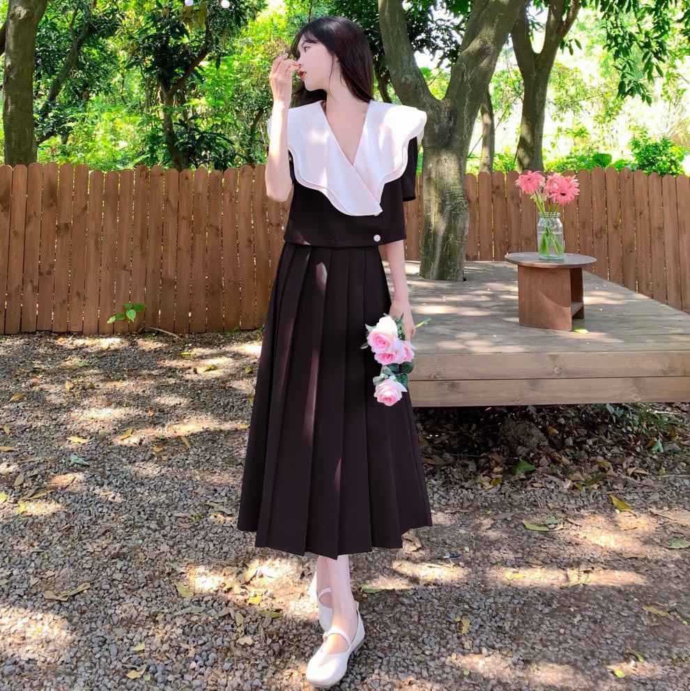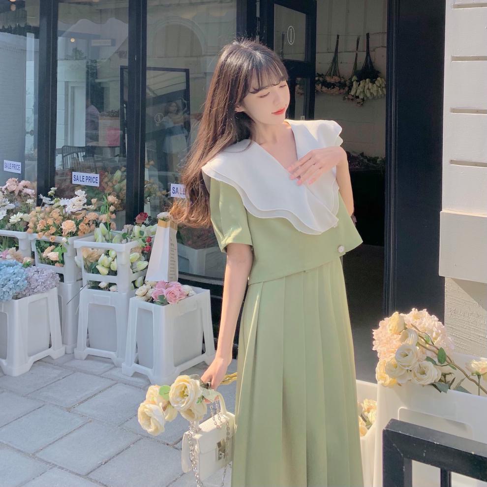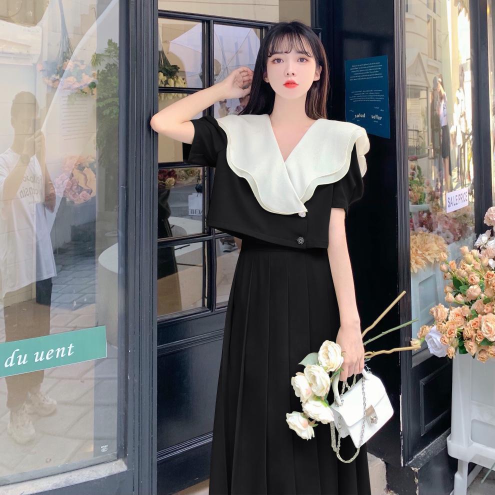 (清仓现货)【社群供G】V领荷叶边纽扣氧气短外套+高腰显瘦百褶半身裙