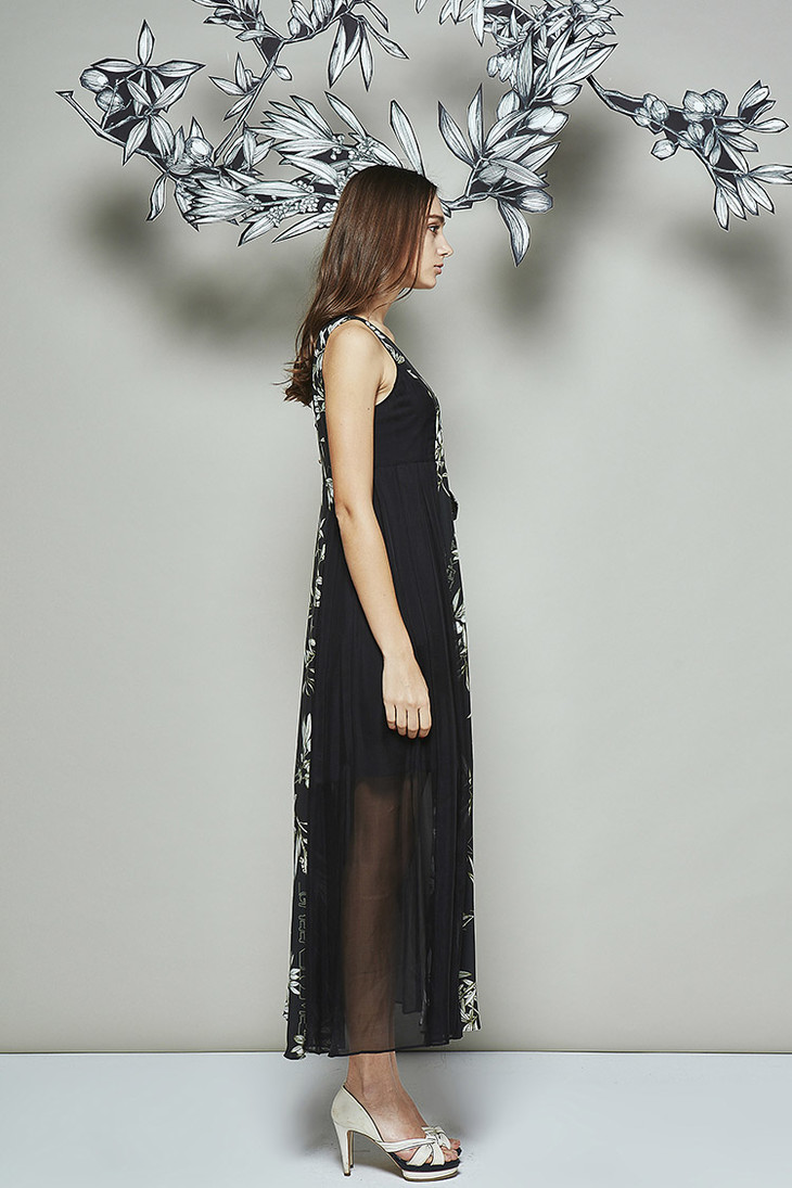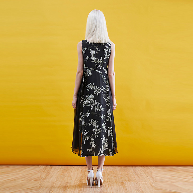 黑橄榄枝印花雪纺大摆长连衣裙