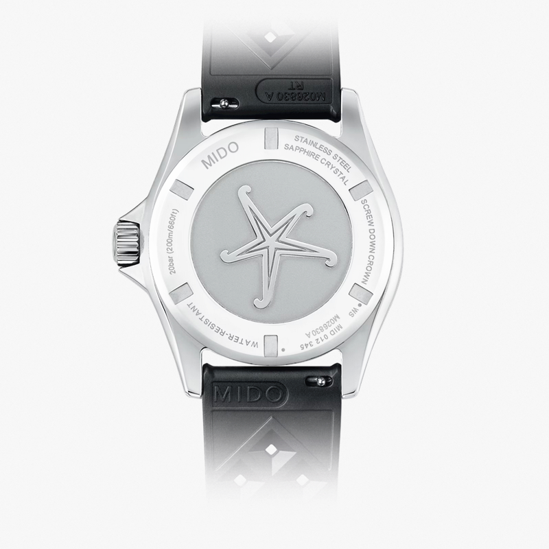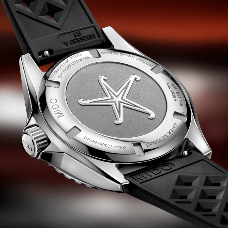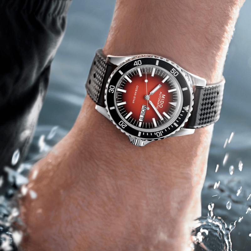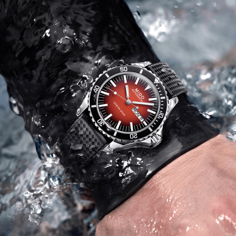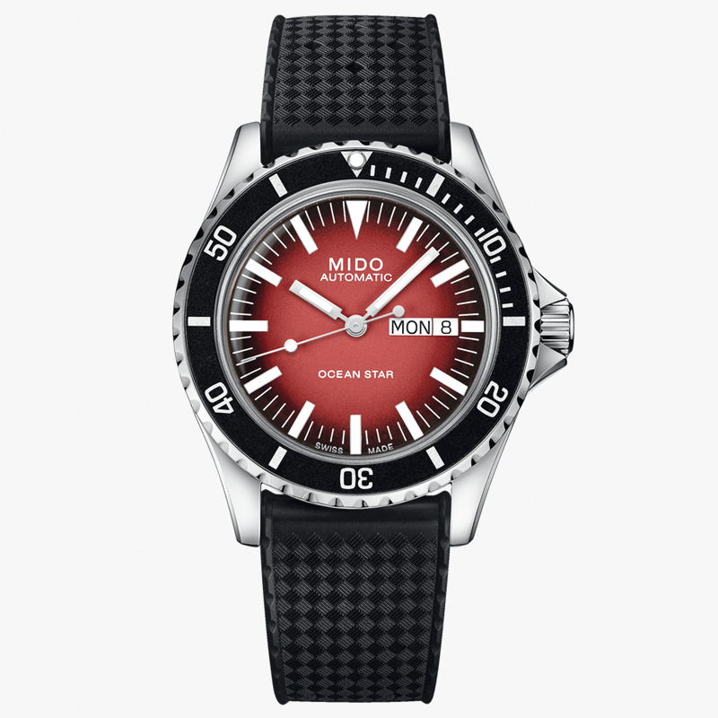 镜面 材质 | 盒型蓝宝石玻璃表镜 | 表盘 | 丝光打磨不锈钢表壳,由红至黑向外渐变表盘,立体镶嵌刻度经过Super-LumiNova®白色夜光涂层处理,日期星期窗位于3点钟位置。时针和分针为水平钻石切割,采用Super-LumiNova®白色夜光涂层处理。秒针为水平钻石切割,其上的点状装饰经Super-LumiNova®白色夜光涂层处理。 黑色铝环和银色标记的单向旋转表圈,12点钟位置饰有Super-LumiNova®白色夜光涂层处理的点状装饰 表底饰有抛光海星图案,镌刻序列号 |