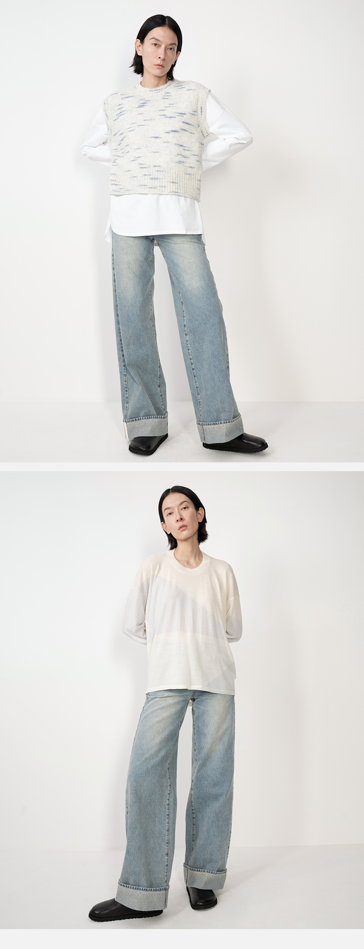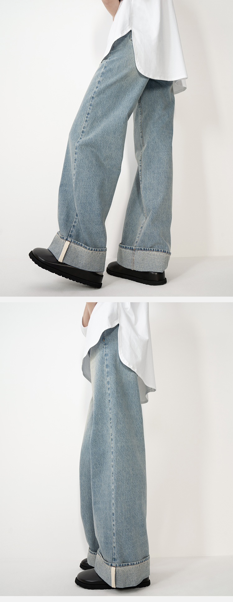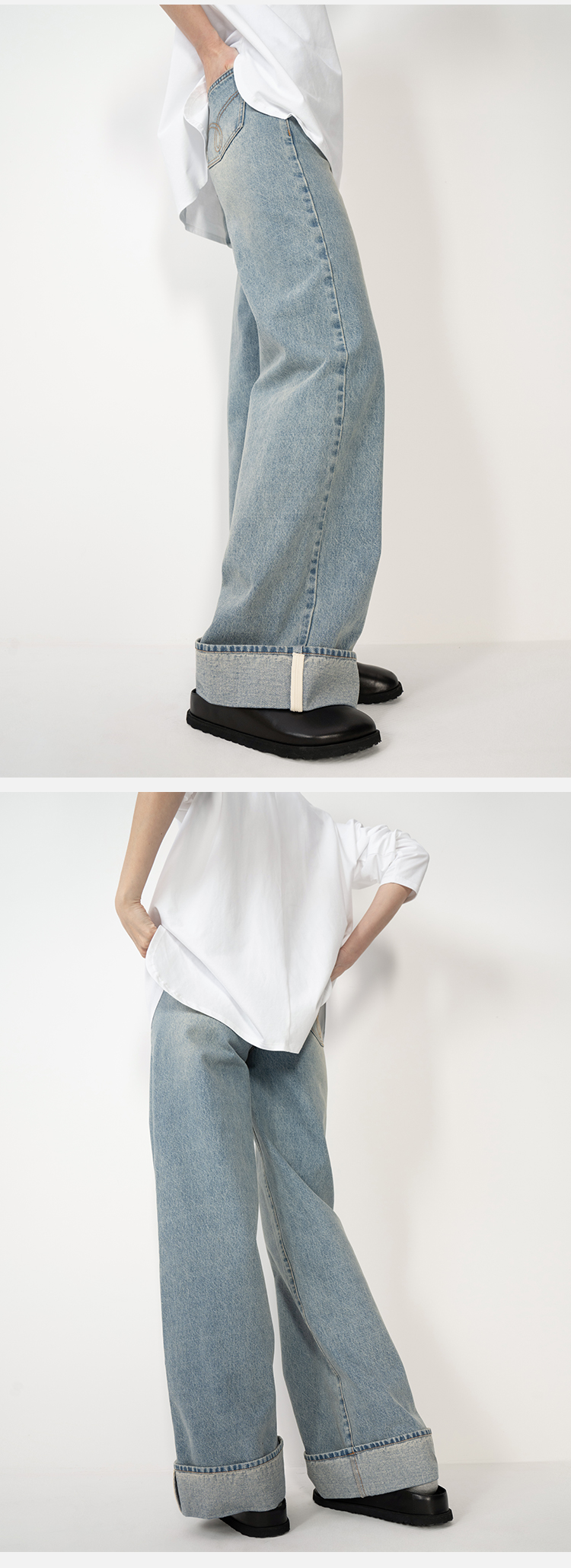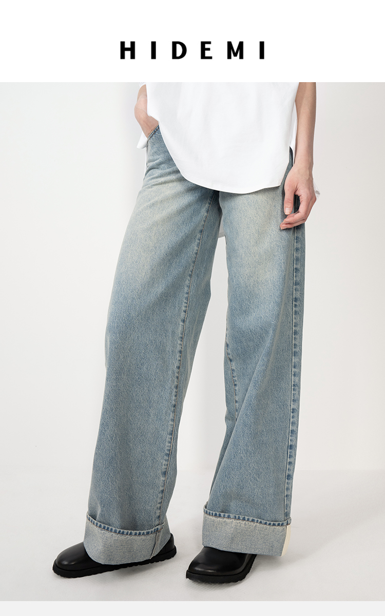 HIDEMI 灰蓝多重水洗做旧感中低腰卷边牛仔裤阔腿裤