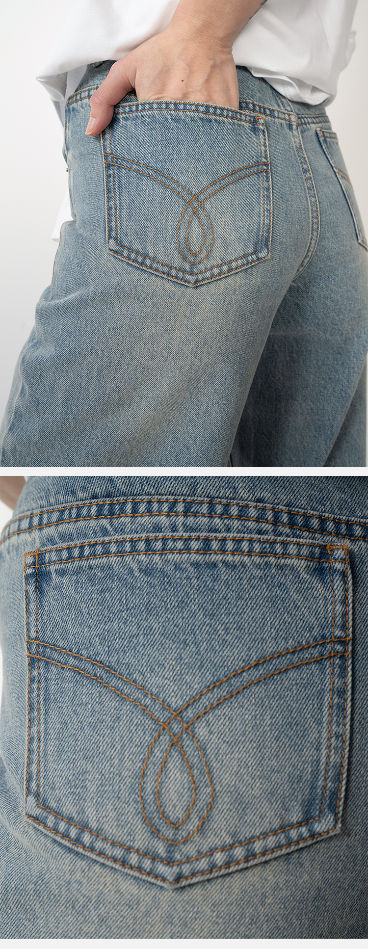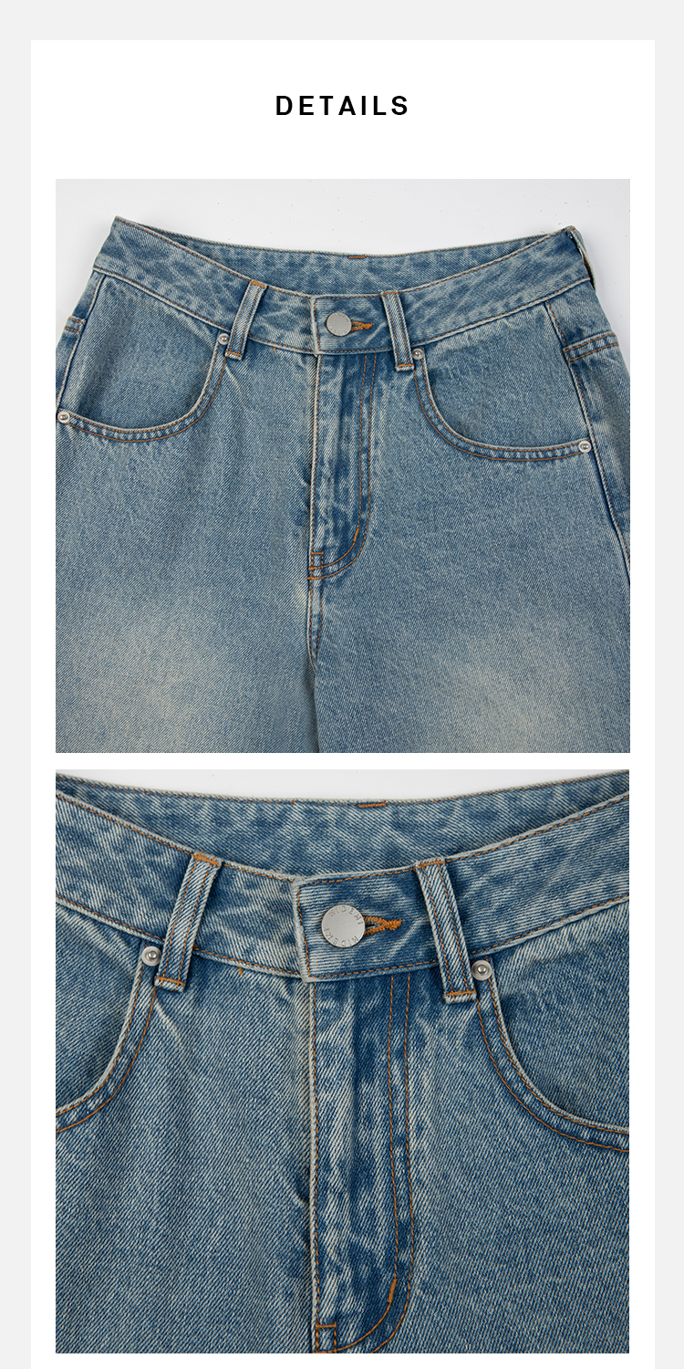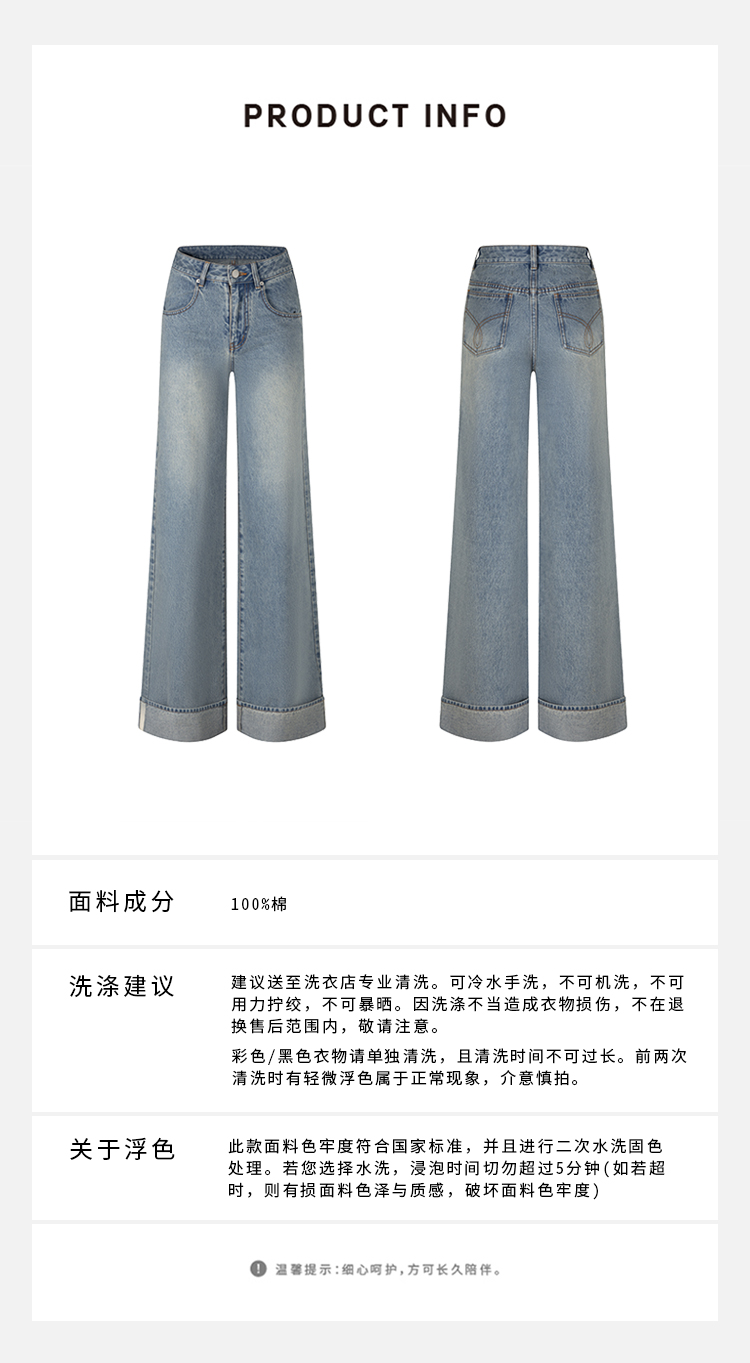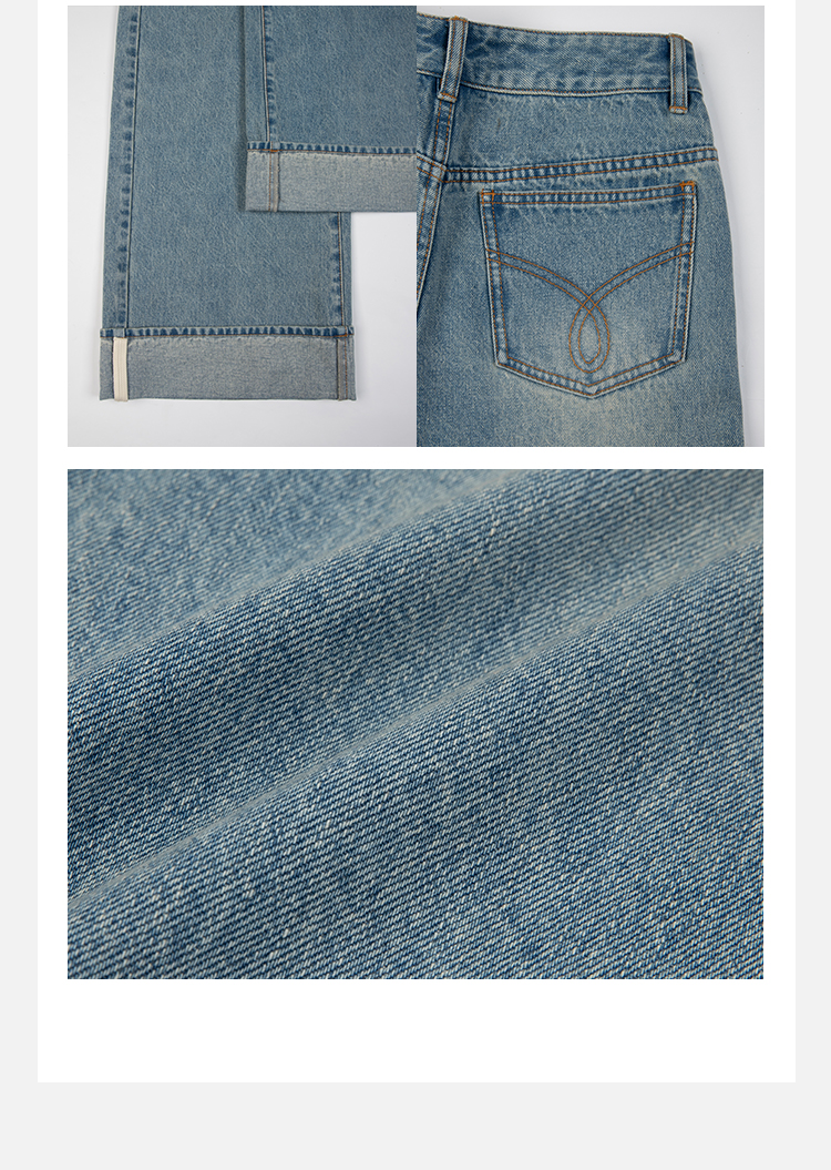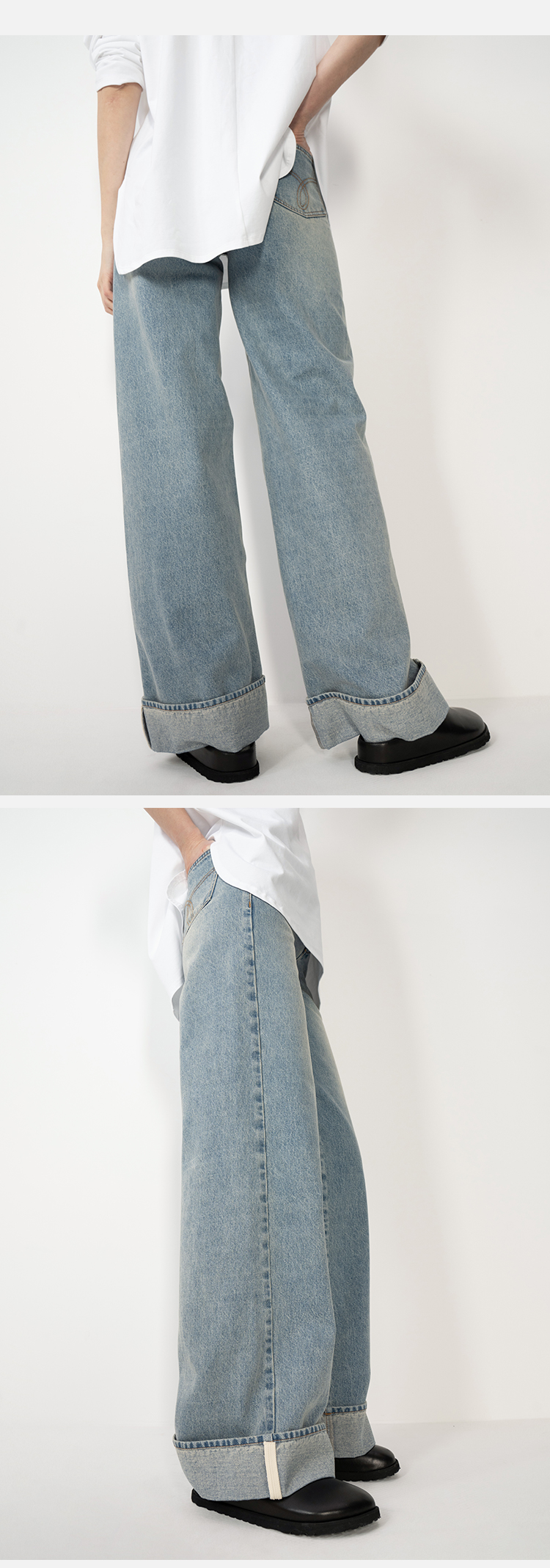 HIDEMI 灰蓝多重水洗做旧感中低腰卷边牛仔裤阔腿裤