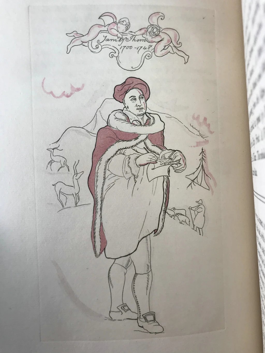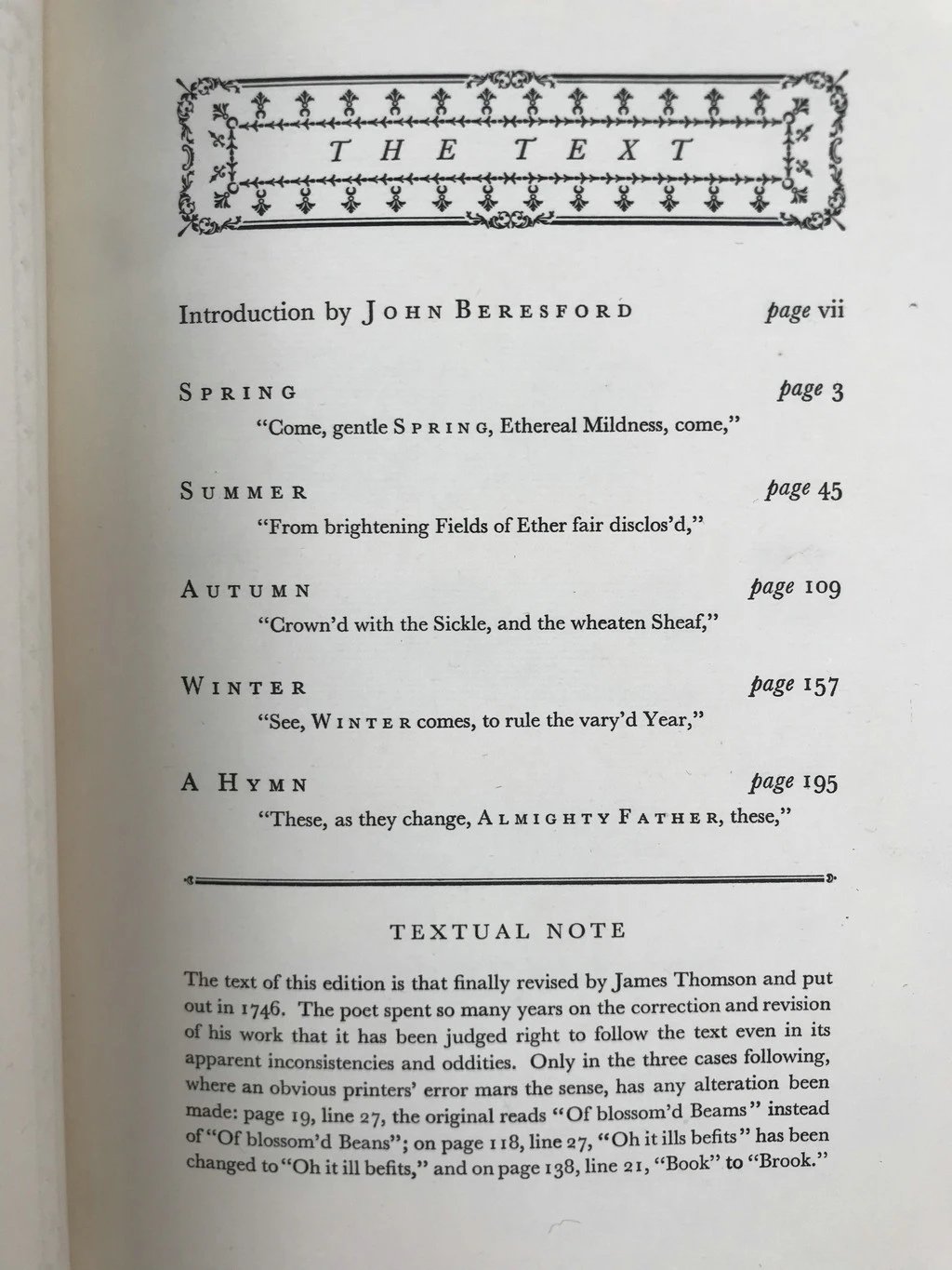 本书为仅发行1500册的限量版图书,编号1114,卷首有限量标示。这个版本整体制作非常精良,书中5幅插图来自法国画家Henri Jacquier的设计,由版画家 C. Sigrist制作后,又交由另一个版画公司单独做了水彩上色。詹姆斯·汤姆森(James Thomson 1700-1748)苏格兰诗人和剧作家,以他的诗歌《四季》闻名。
