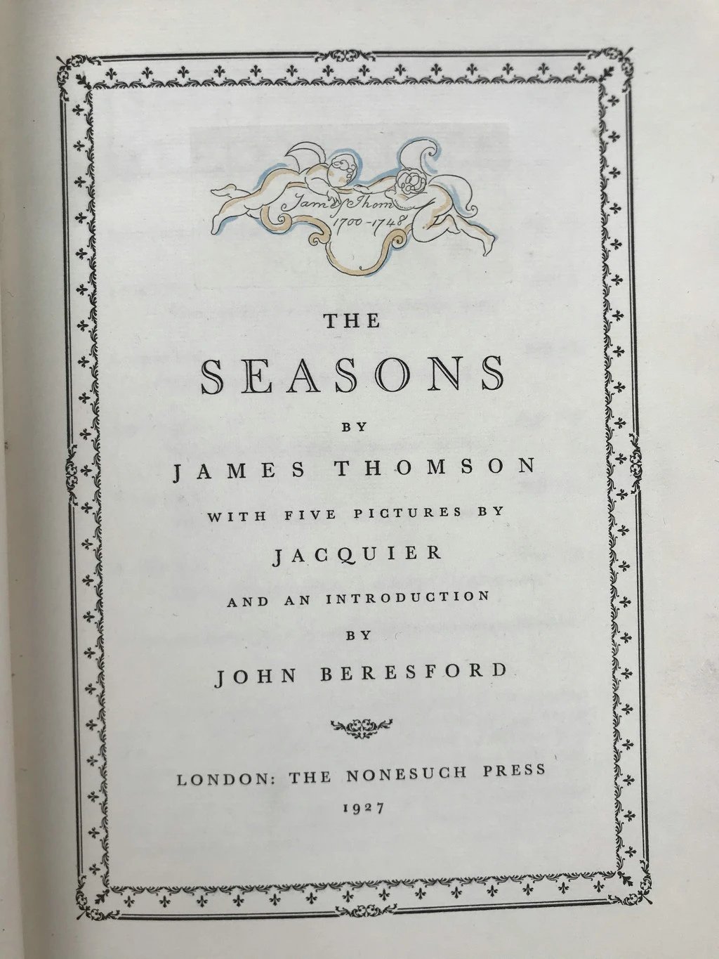 The Nonesuch Press私人出版社限量1500册 原品铜版画手工上彩插图 1927年 詹姆斯·汤姆森《四季》 亨利·雅基耶5幅插图 布面精装16开