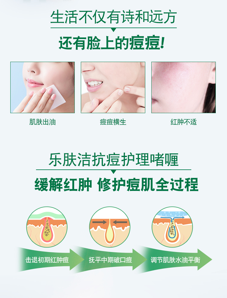 请拍:净痘四件套:乐肤洁控油清爽洁面乳100g+乐肤洁抗痘护理爽肤液150ml+乐肤洁抗痘护理啫喱18g+乐肤洁隐形净痘贴26片