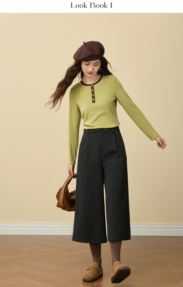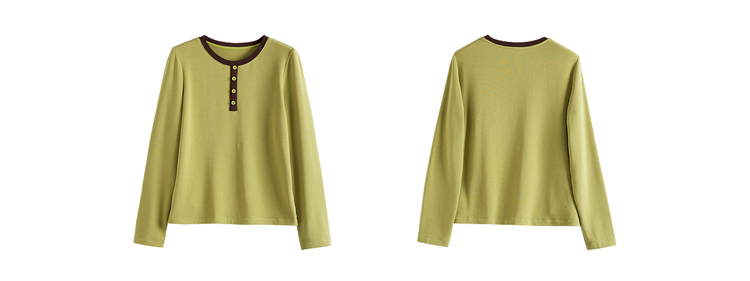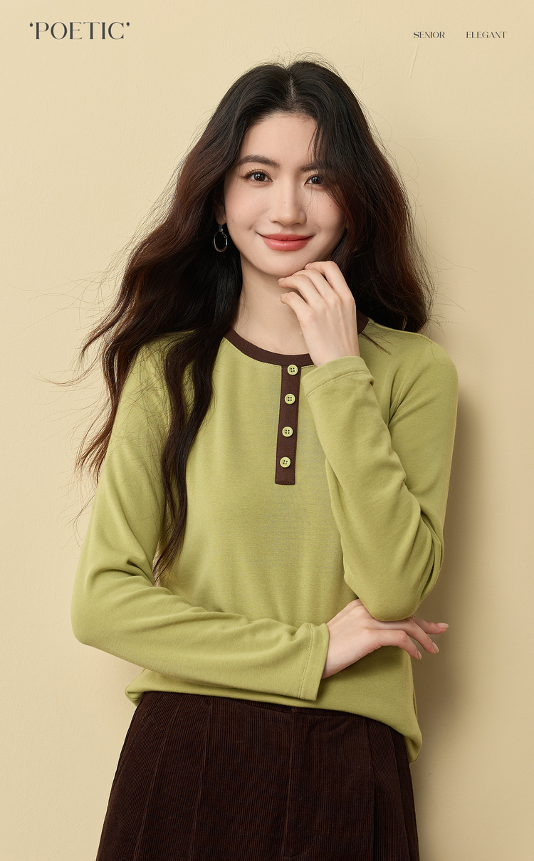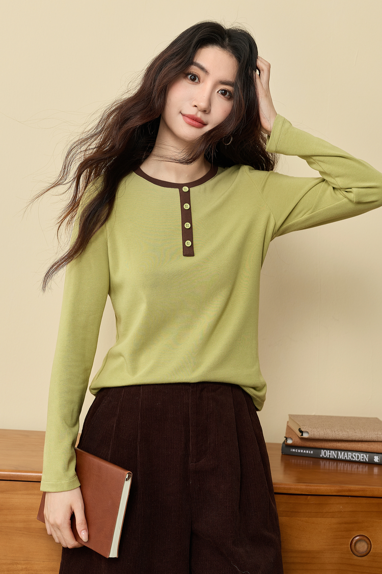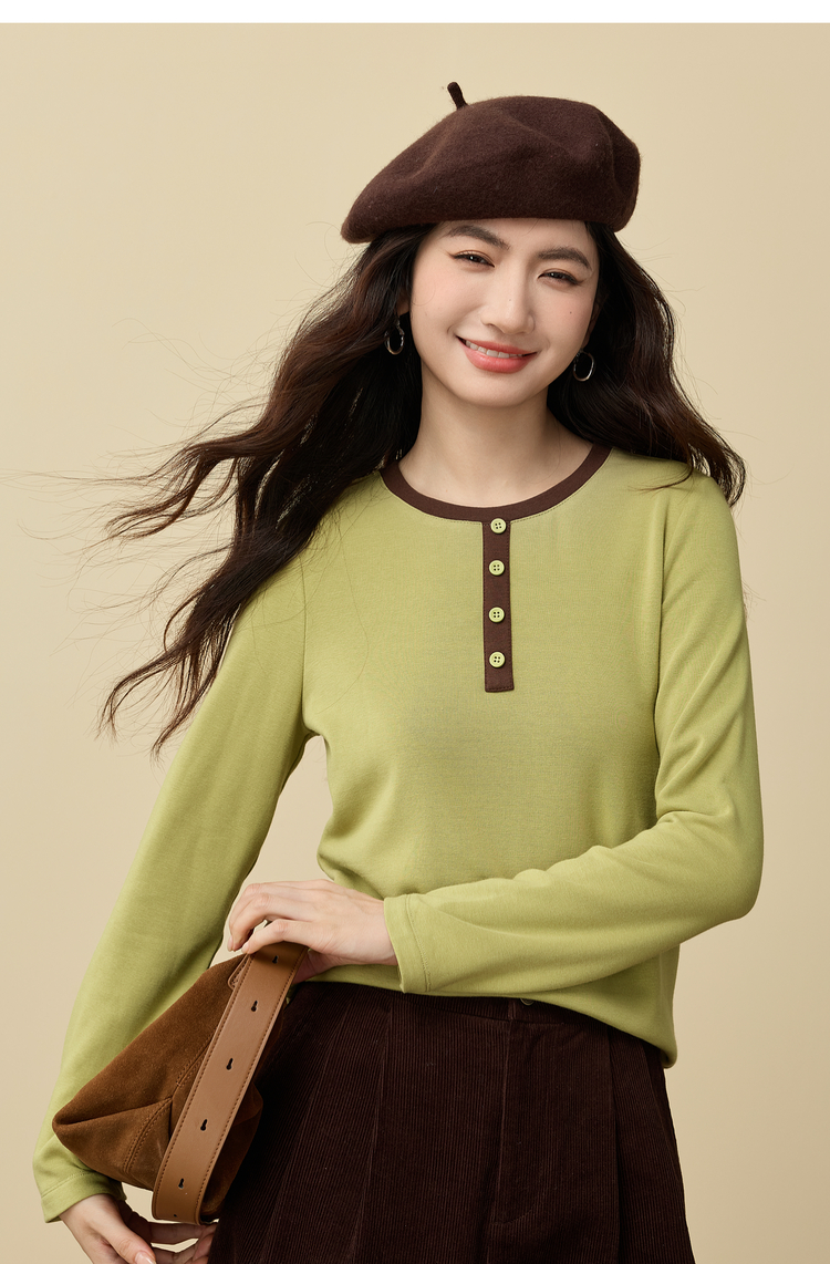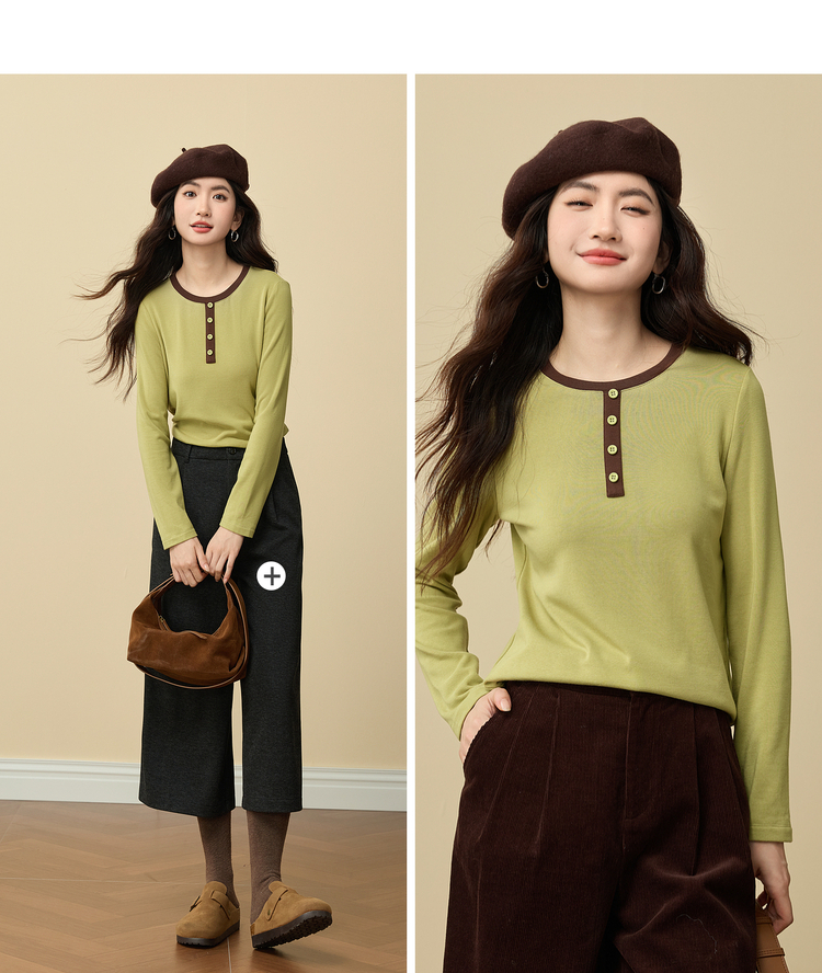 【12/03新品】熙世界牛油果绿正肩T恤女长袖休闲风撞色圆领打底衫2025秋冬新款