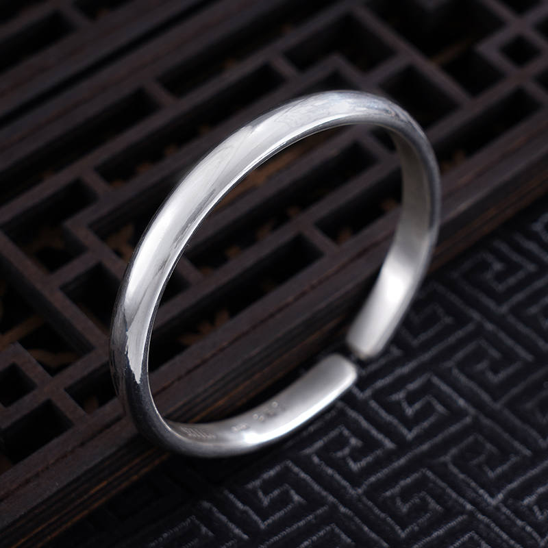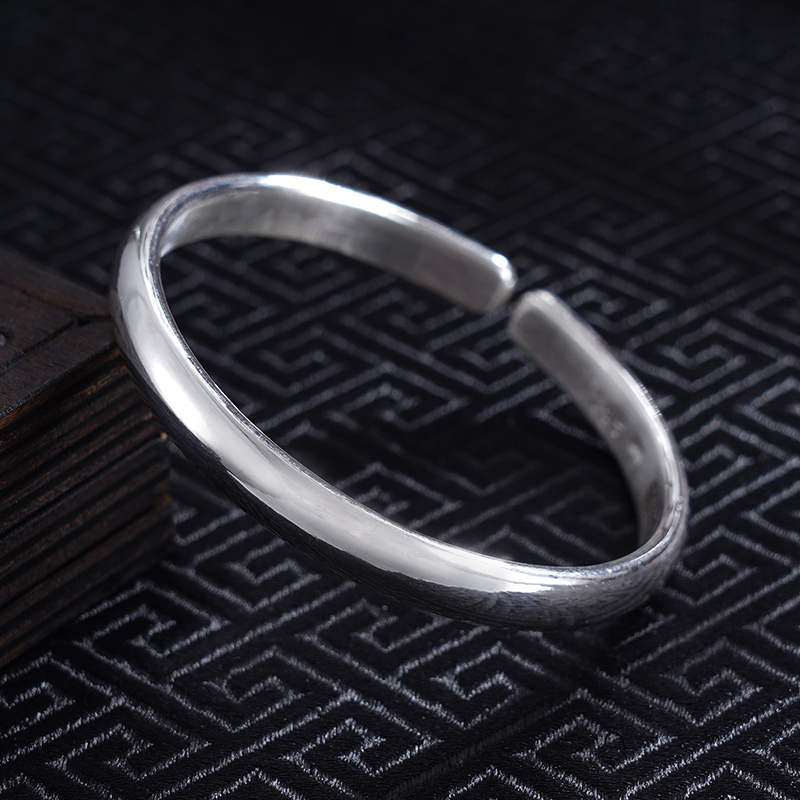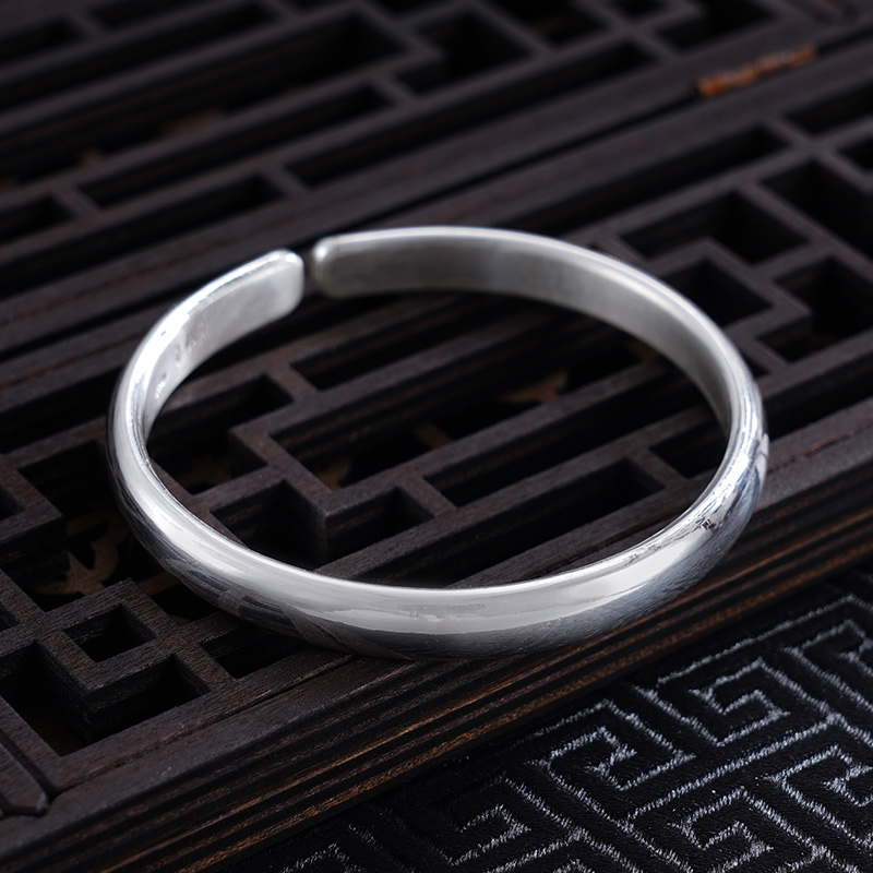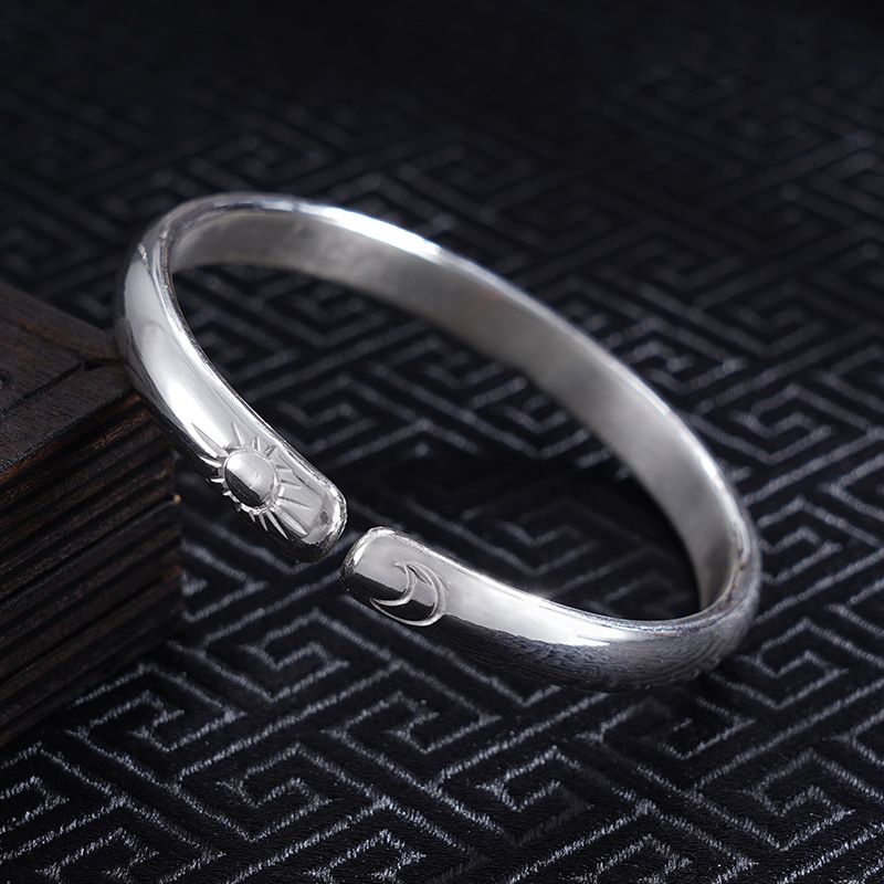 【寓意】:纯银开口手镯,镯面錾刻日月纹样,辅以抛光工艺,象征日月同辉,寓意事事周全,前程光明。