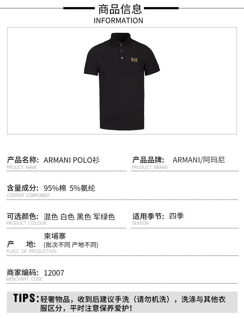 Armani EA7 男士运动休闲弹棉Polo T恤 12007