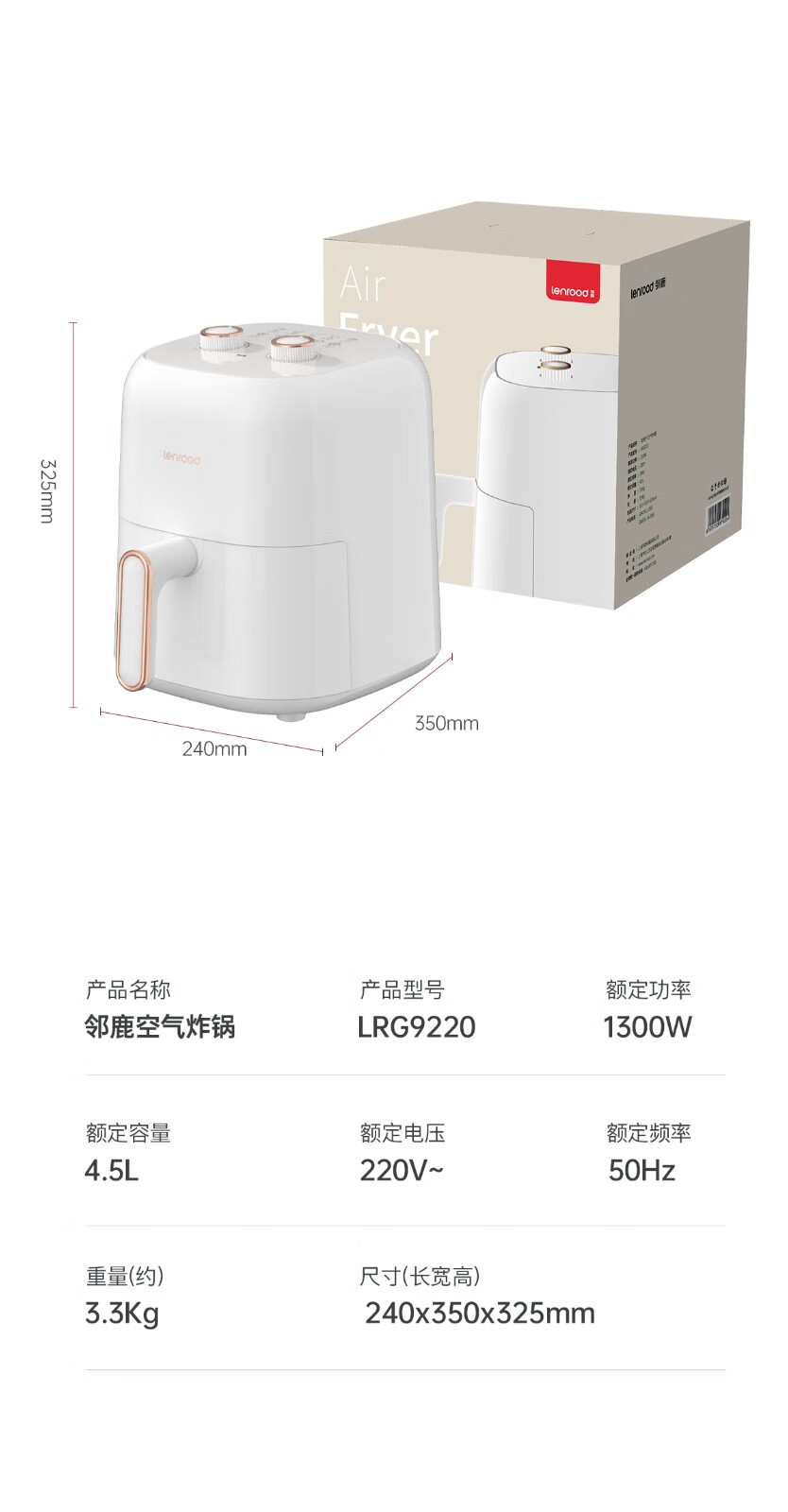 邻鹿 空气炸锅家用大容量智能电炸锅无油低脂煎炸锅多功能烤箱薯条机机械经典空气炸锅LRG-9220 官方标配