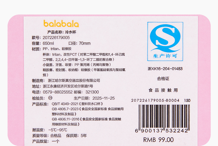 【商场同款】巴拉巴拉儿童冷水杯女童大容量吸管水杯便携清新外出