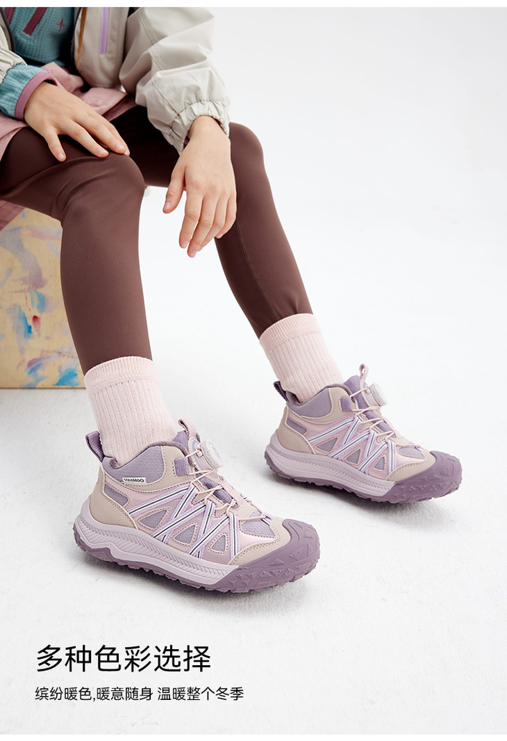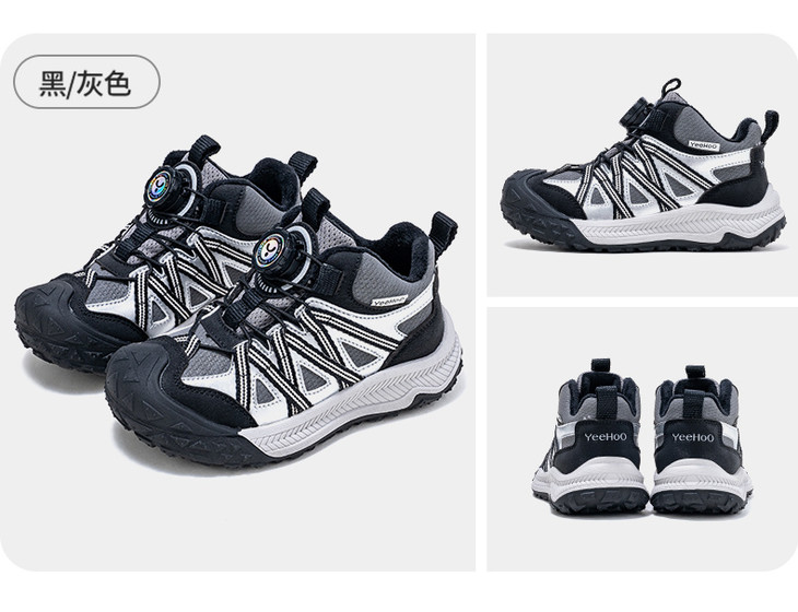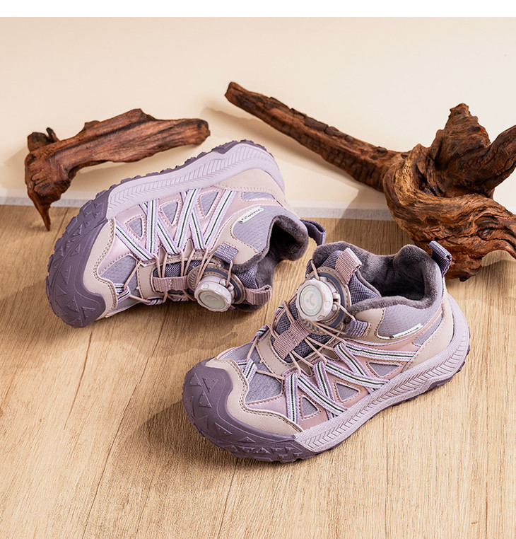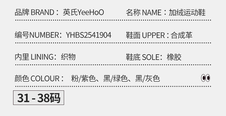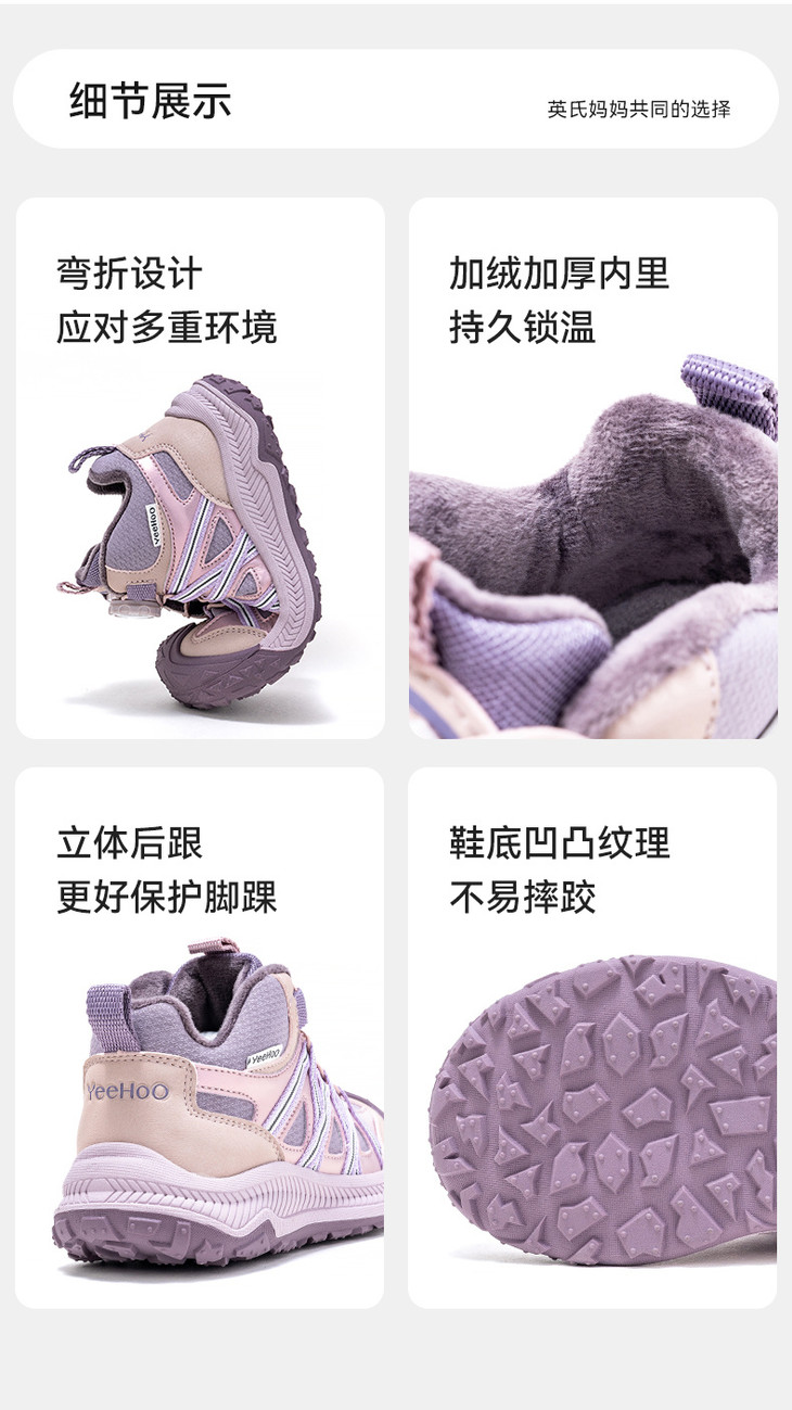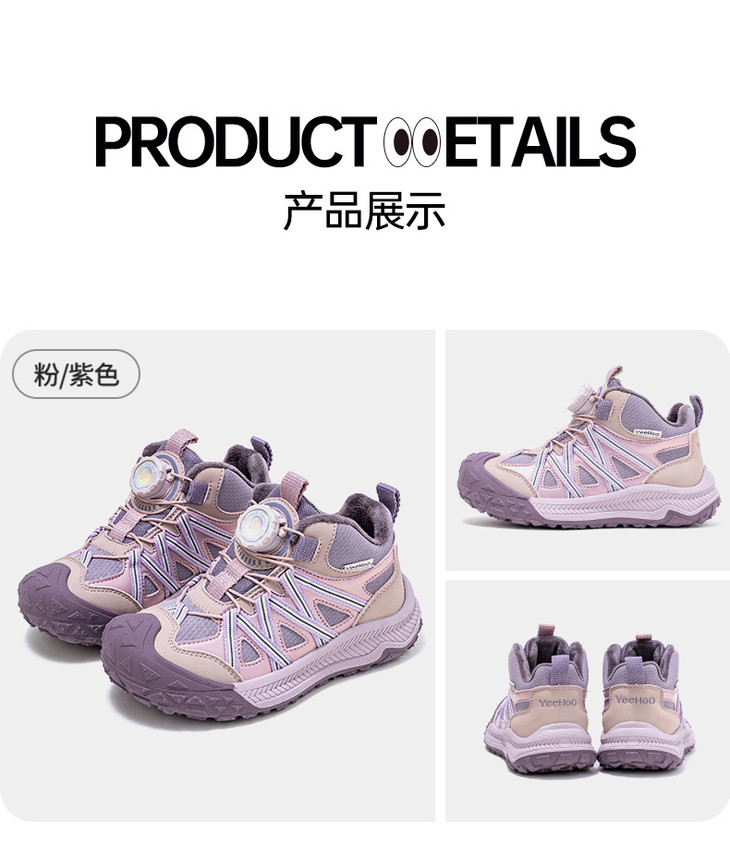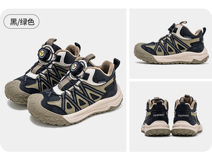 英氏YeeHo0童鞋冬季保暖加绒旋转纽扣运动鞋YHBS2541904 货号:YHBS2541904 颜色:黑绿色、黑灰色、粉紫色 尺码:31-38 材质:鞋面 合成革;鞋底 橡胶 外观时尚百搭,有多种颜色可供选择,无论是上学还是户外活动,都能让孩子展现出活力与时尚感。 这款鞋有冬季加绒款,适合在寒冷天气穿着。内里的绒毛柔软舒适,能够有效锁住热量,为孩子的双脚提供温暖的呵护,让孩子在户外活动时也不会感到寒冷。 鞋底采用了柔软的详见材质,中底部分则使用高弹力材料,能够有效缓解地面带来的冲击,减少孩子行走时的疲劳感,同时提供良好的脚感,让孩子行走更加轻松。 鞋头部分做了加固处理,能够防止鞋子在受到碰撞时轻易变形,保护孩子的脚趾。 后跟处也有加固设计,有助于稳定孩子的脚部,让脚型得到更好的保护,同时也增加了鞋子的耐用性。 鞋子采用旋钮纽扣设计,替代了传统的鞋带,孩子自己可以轻松调节鞋子的松紧度,方便穿脱,同时也避免了鞋带散开的问题,让家长更加省心。