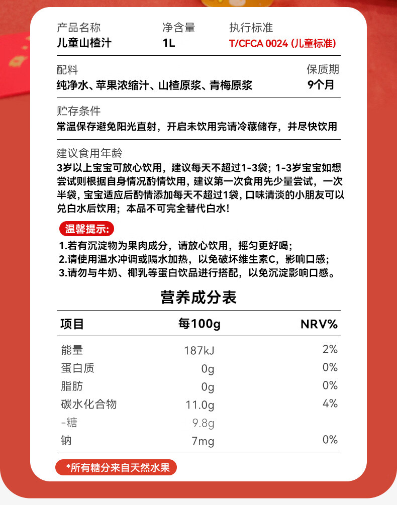 金豆芽儿童山楂汁1L