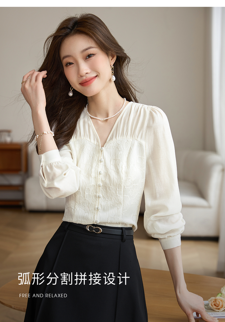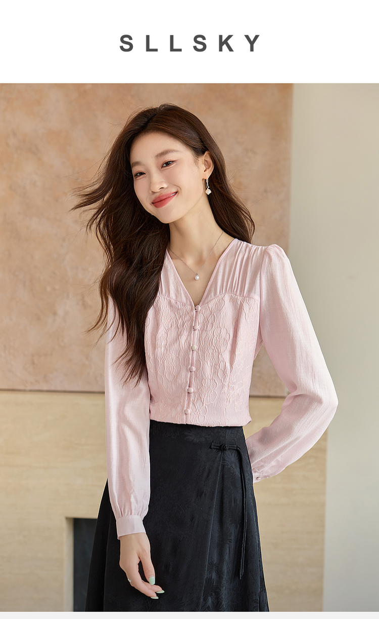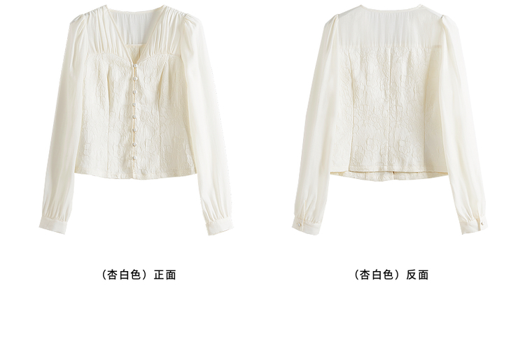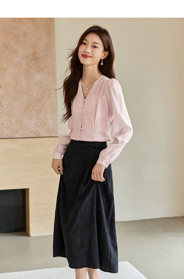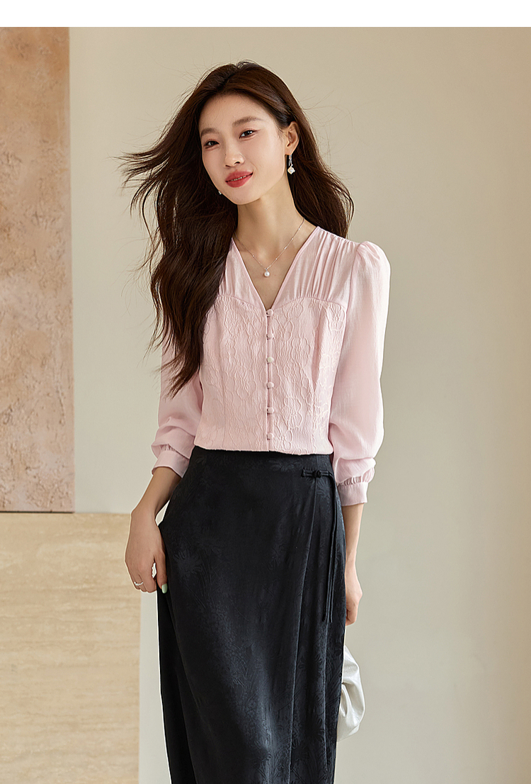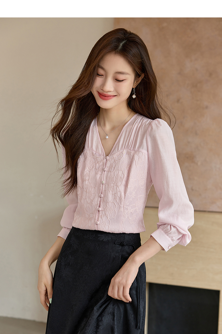 【129选3件,不退换】熙世界轻国风提花雪纺衬衫2025初秋收腰显瘦浮雕感长袖V领上衣