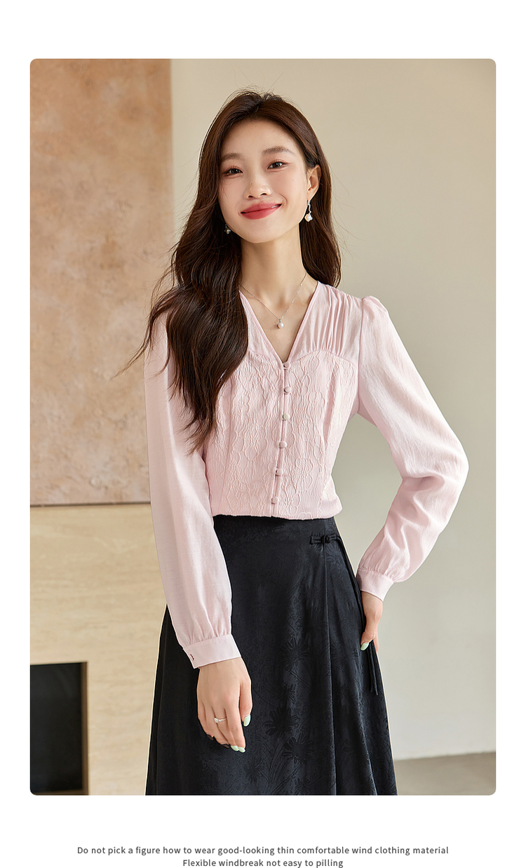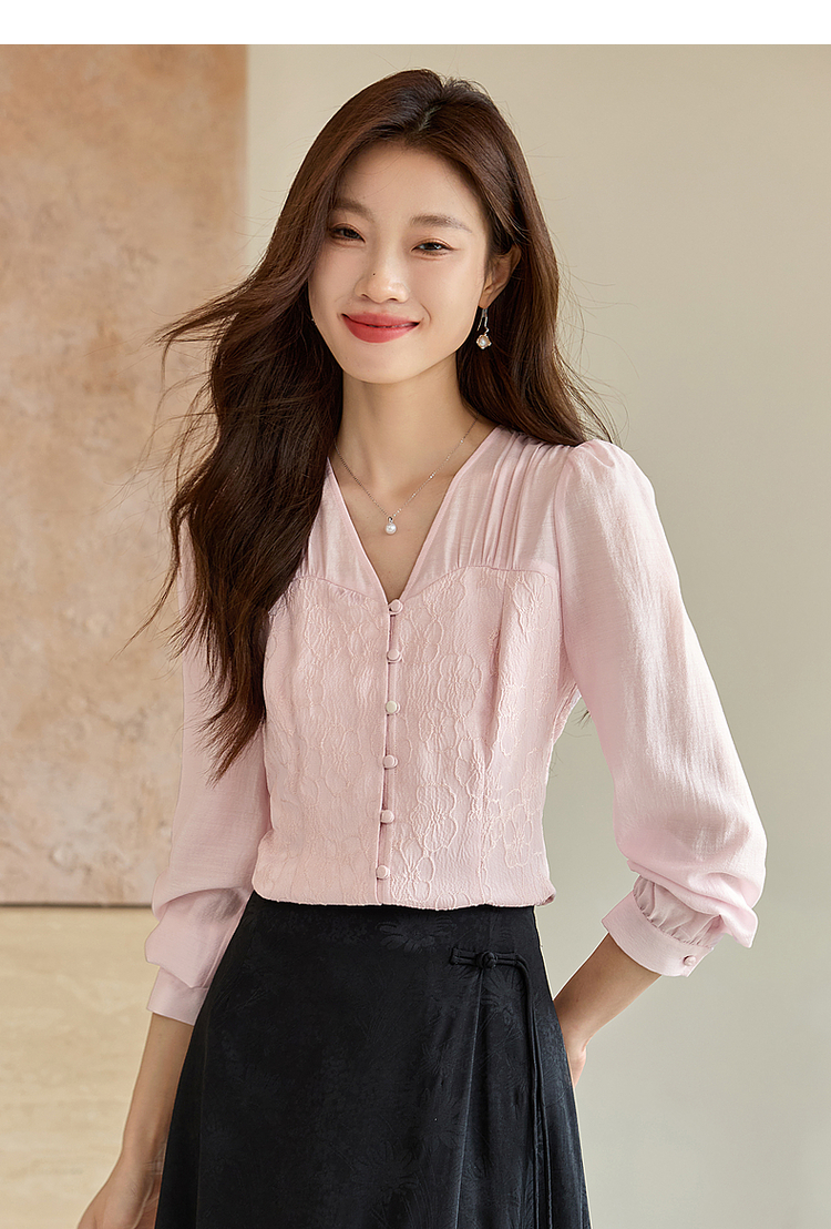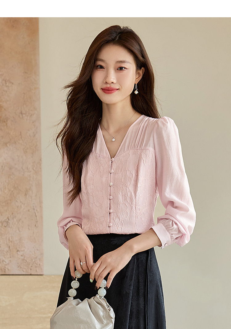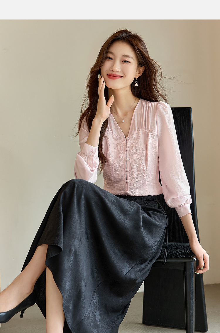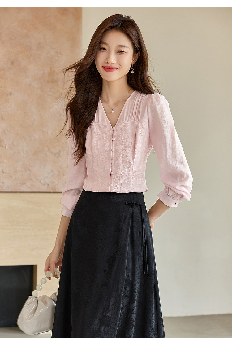 【129选3件,不退换】熙世界轻国风提花雪纺衬衫2025初秋收腰显瘦浮雕感长袖V领上衣