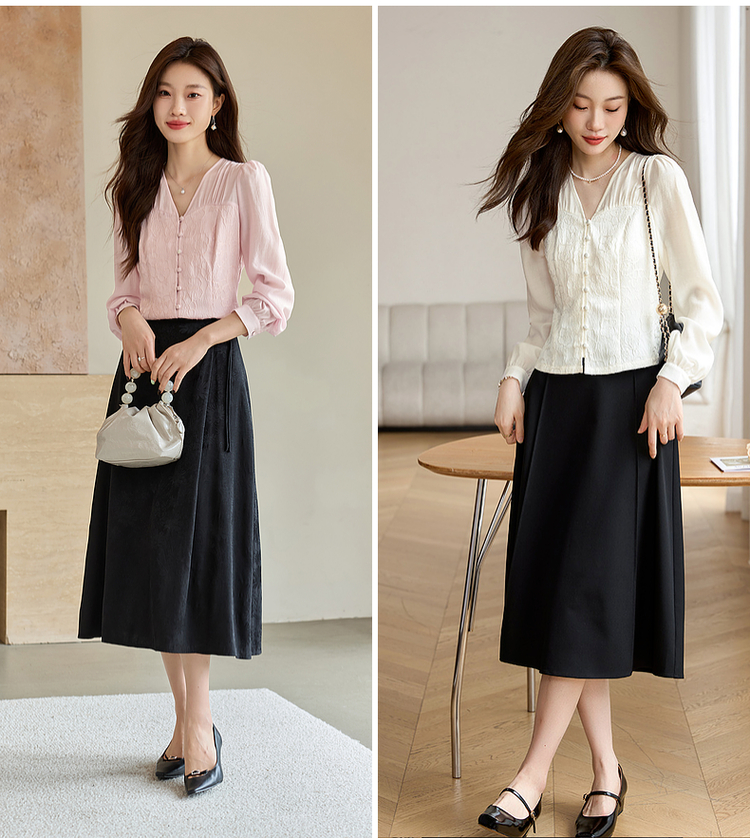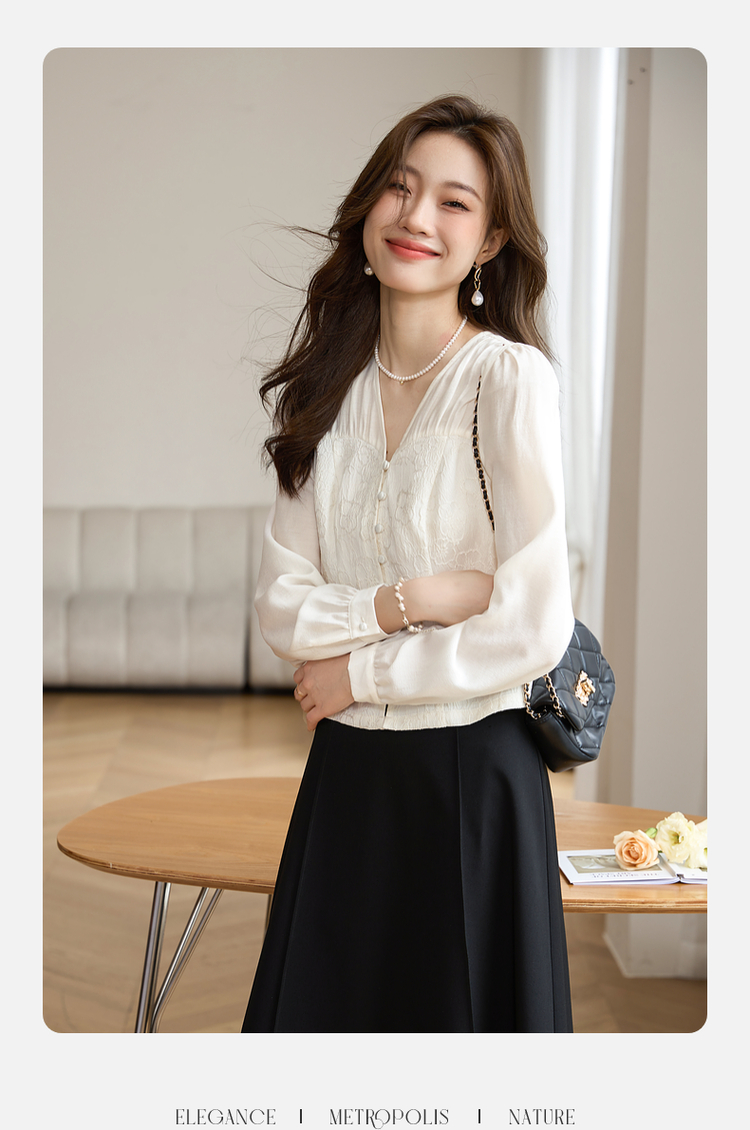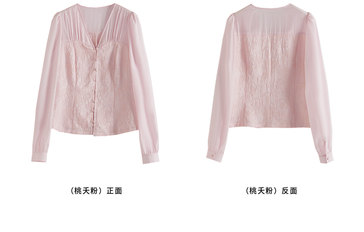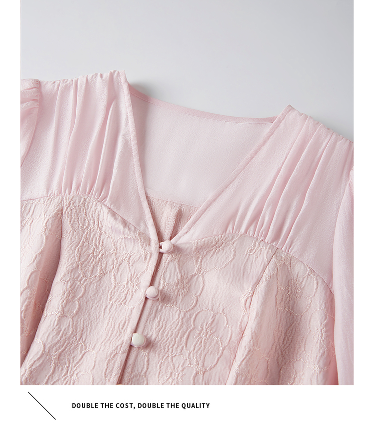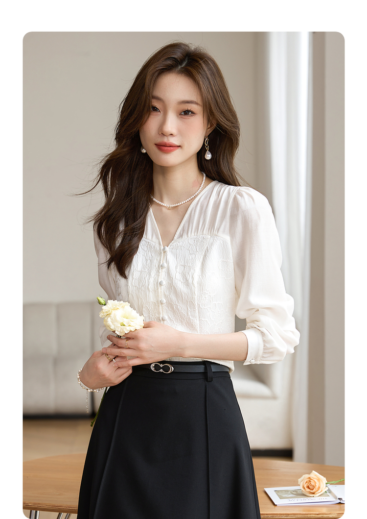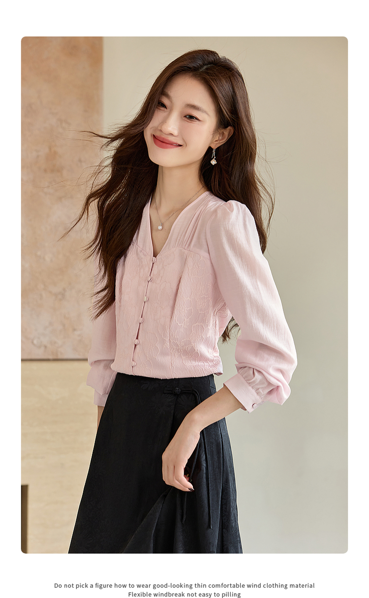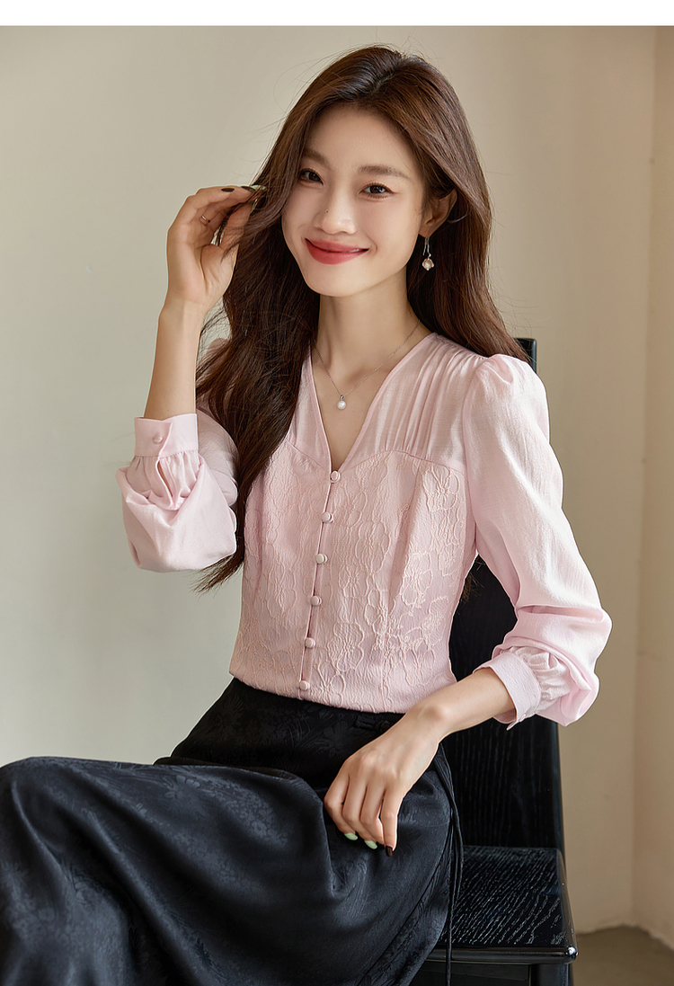【129选3件,不退换】熙世界轻国风提花雪纺衬衫2025初秋收腰显瘦浮雕感长袖V领上衣