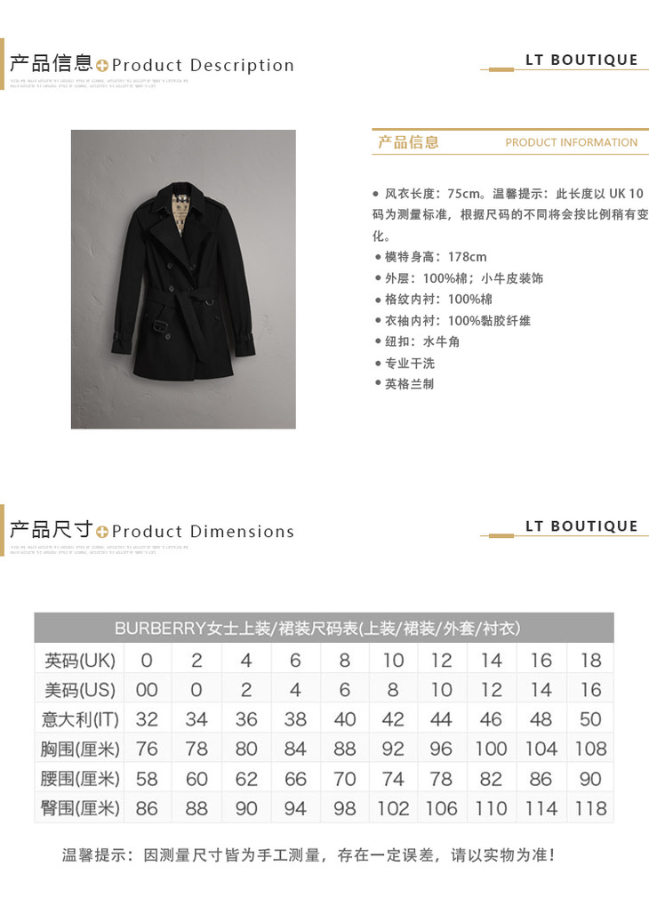 BURBERRY 博柏利 女士桑德林汉姆版型瘦版短款风衣 黑色 3900450 00100