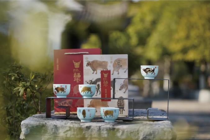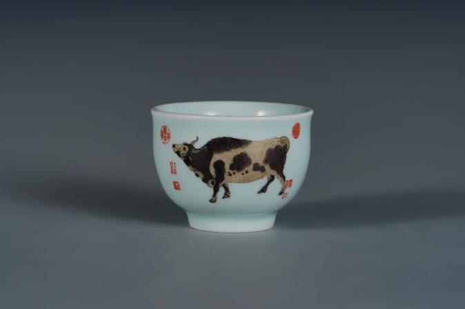 杯身拓刻的黄牛像,以较粗和略有顿挫的线条来描写,以表现牛皮的厚实和韧性;牛角和蹄则很坚硬,所以用上浓墨和坚挺的笔法。五头牛整体造型准确,形态生动,恰当地表现出筋骨和皮毛的质感。