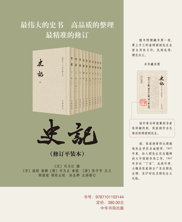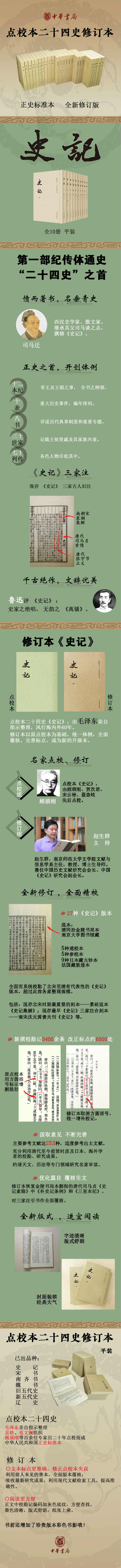 2013年10月,《史记》(修订精装本)出版后,受到广大读者和学术界的热烈关注,掀起新的一轮“《史记》热”。2014年8月,在吸纳读者意见和自我完善的基础上,推出《史记》(修订平装本),以飨读者。