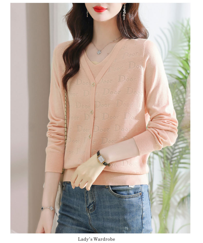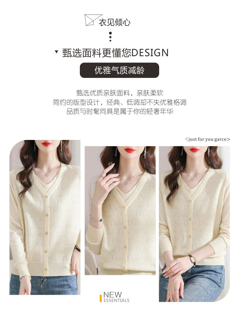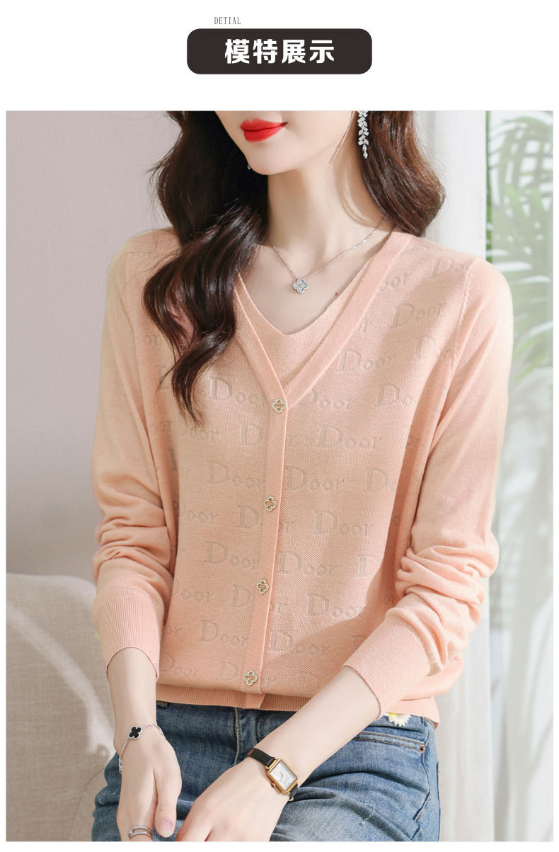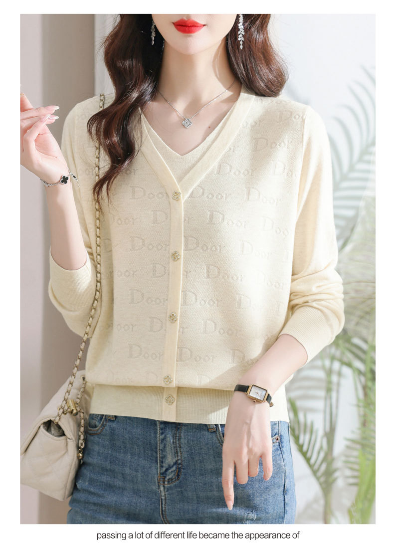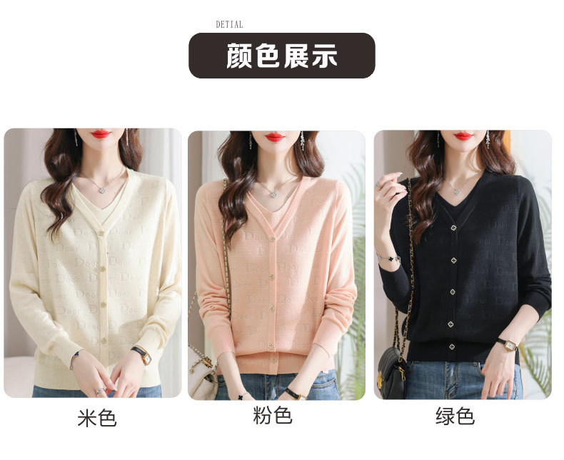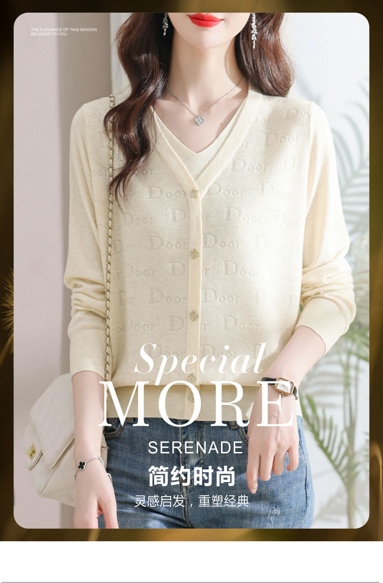 秋装新款,薄款V领假两件宽松年轻妈妈装长袖套头针织女装CC-9222