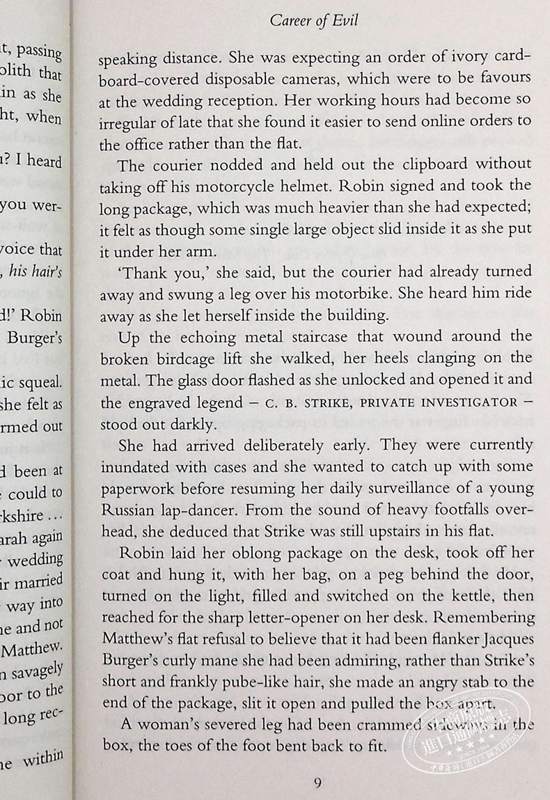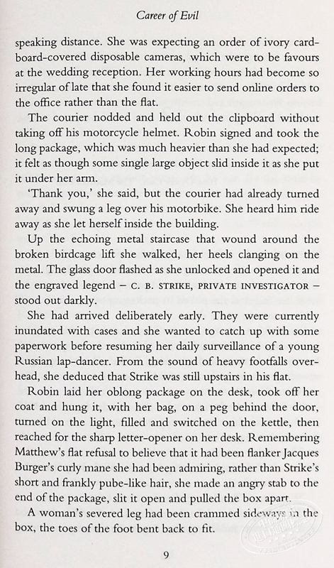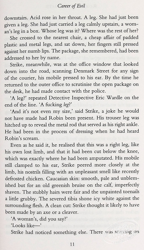When Robin Ellacott opens an unexpected delivery, she is horrified to discover that it contains a woman's severed leg.