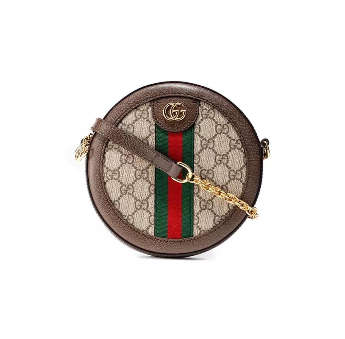 GUCCl古驰 Ophidia 老花Logo条纹织带 帆布拼皮圆饼包链条包单肩斜挎包 迷你女款 乌木色/棕色