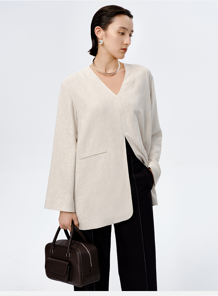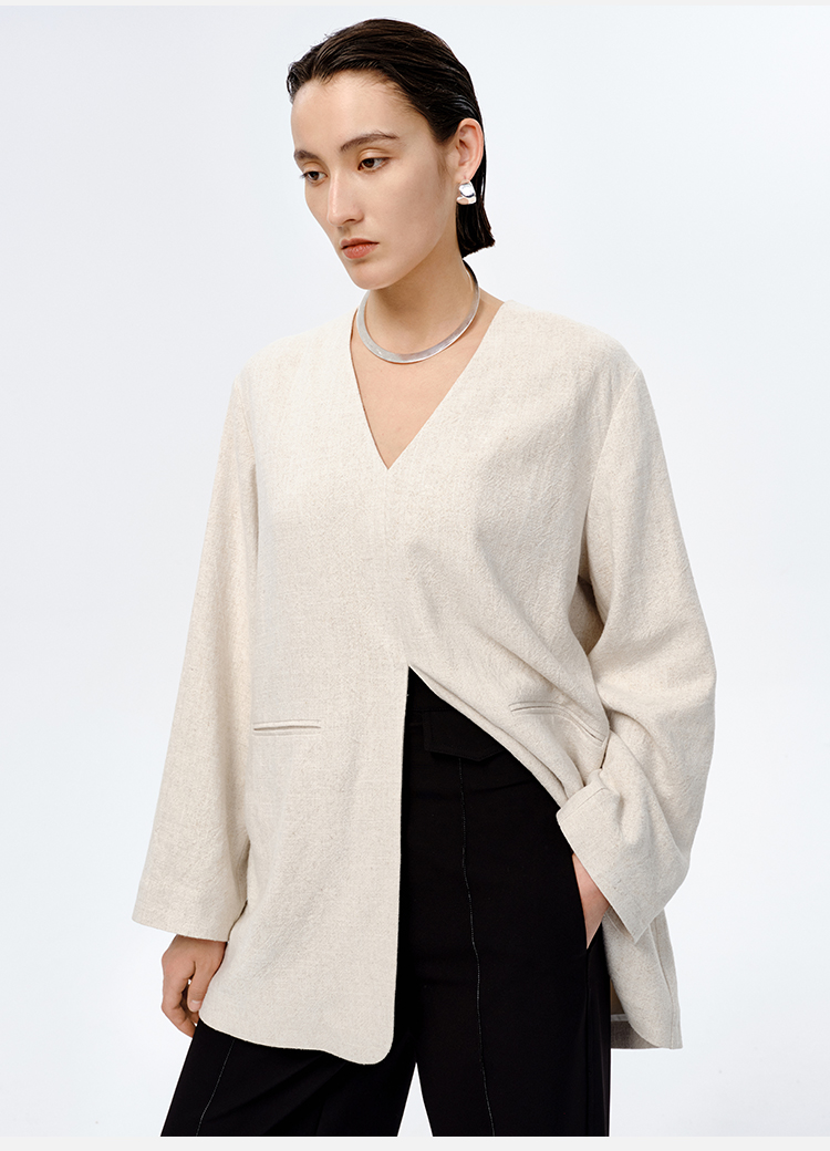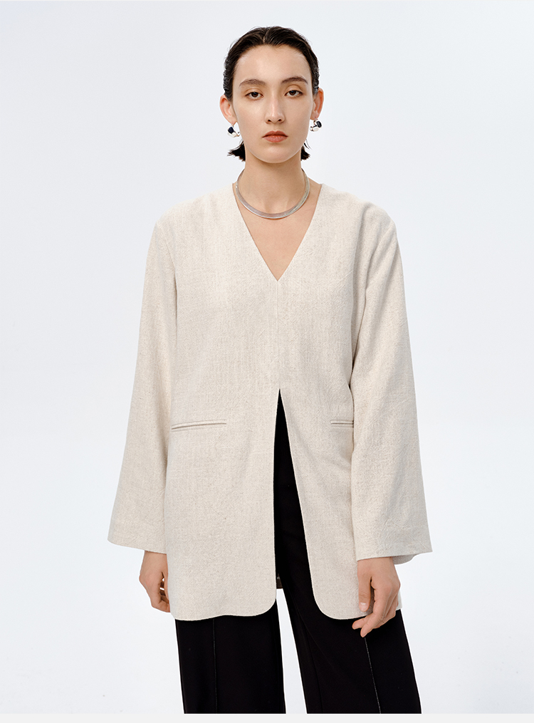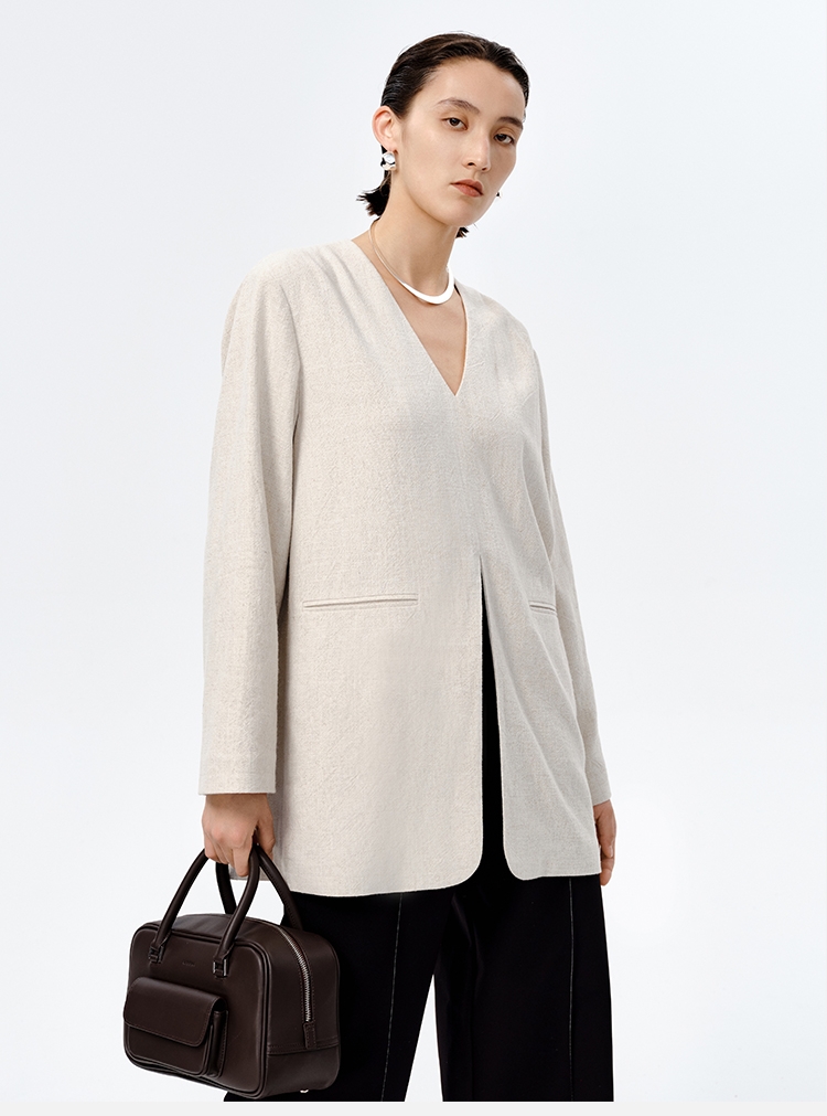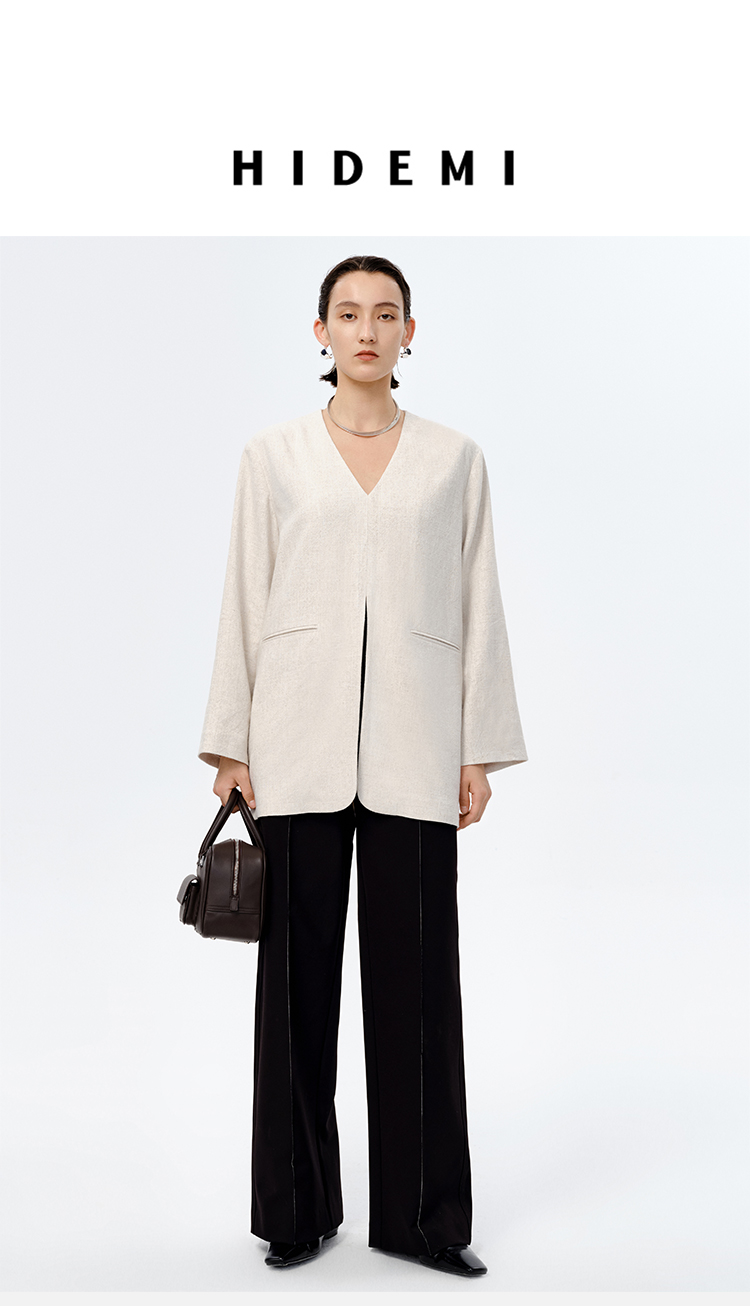 HIDEMI 水洗亚麻自然原色V领西装极简口袋开衩设计感西装式上衣