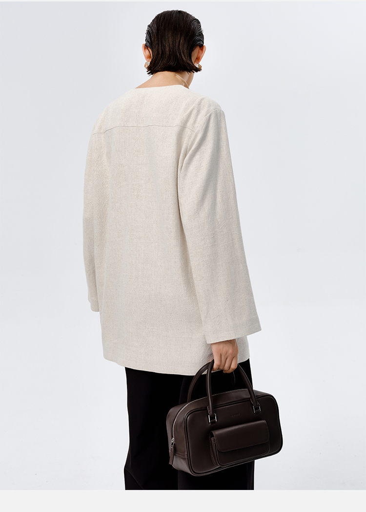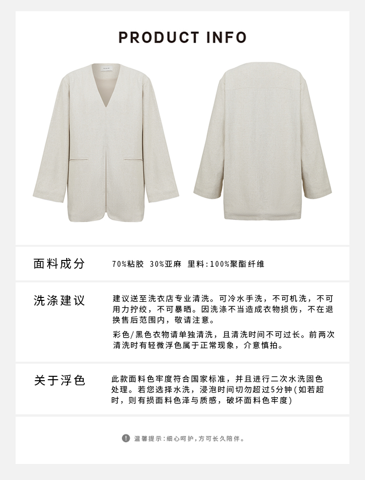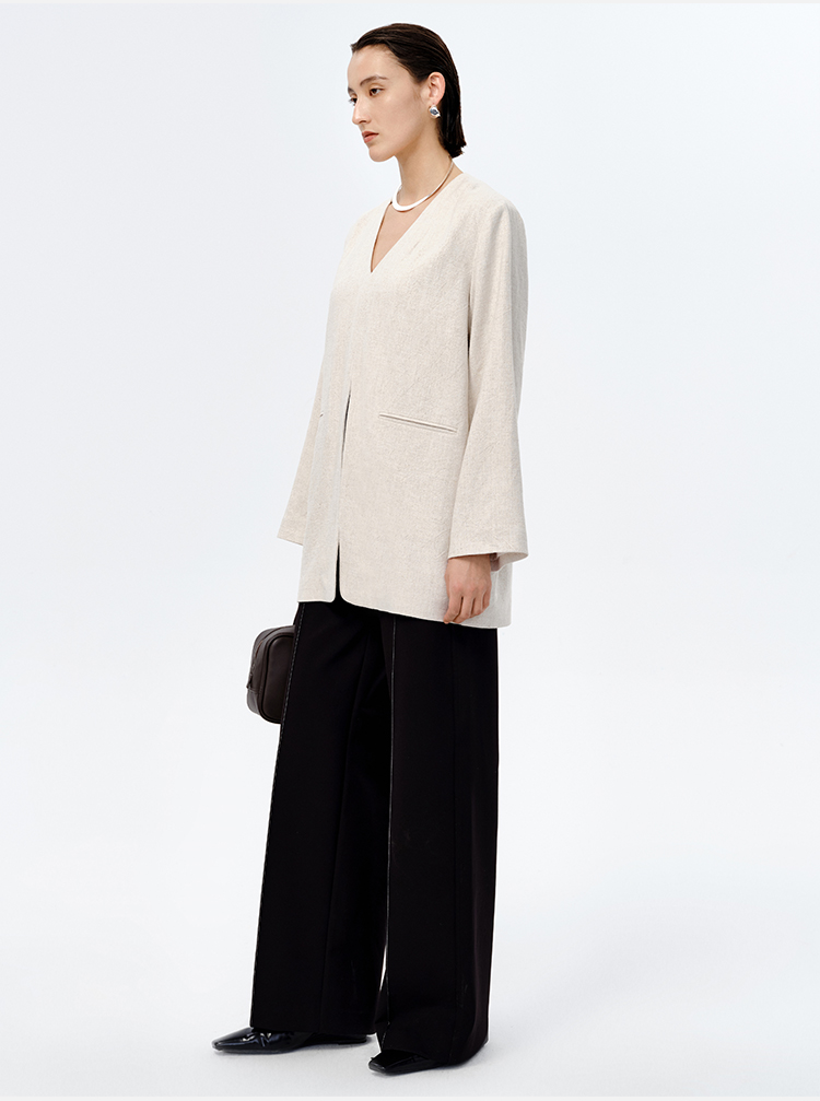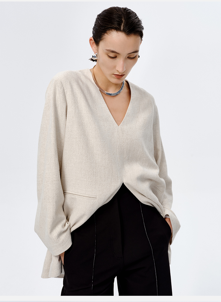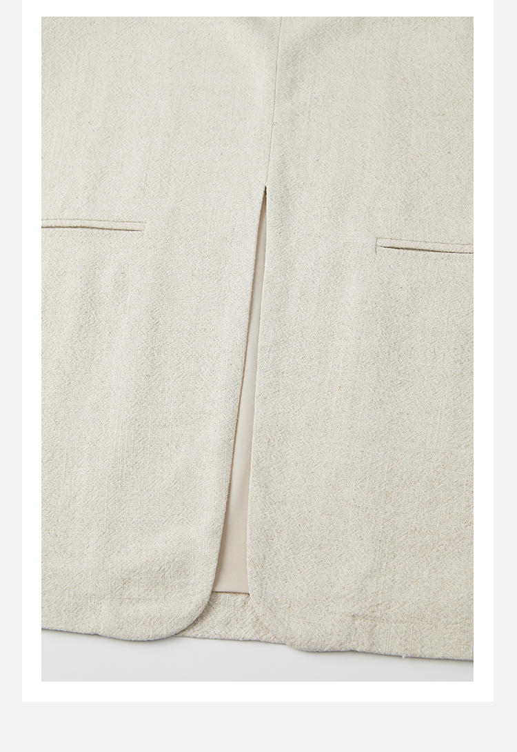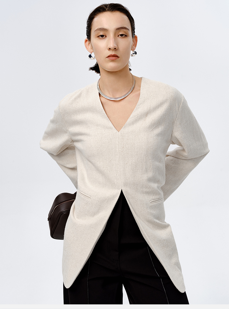 HIDEMI 水洗亚麻自然原色V领西装极简口袋开衩设计感西装式上衣