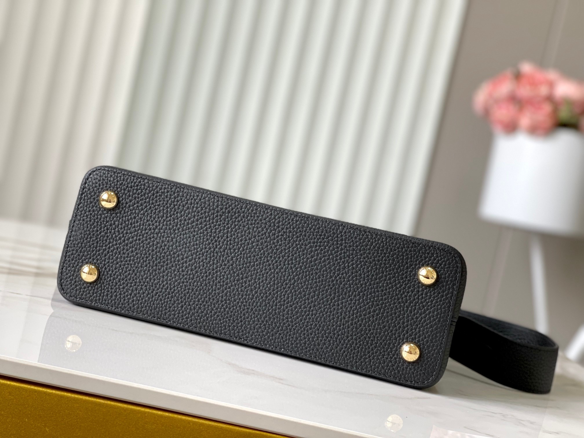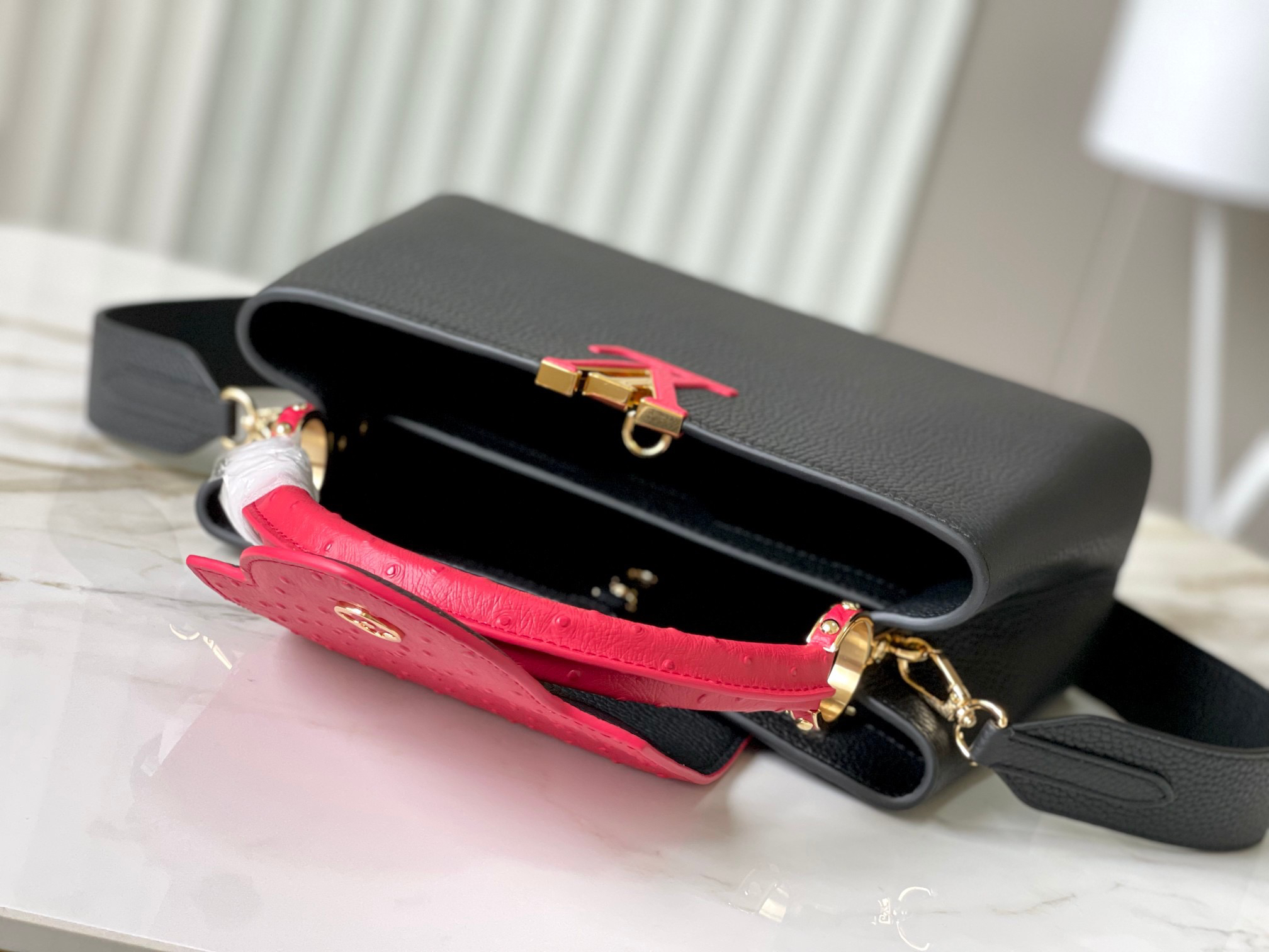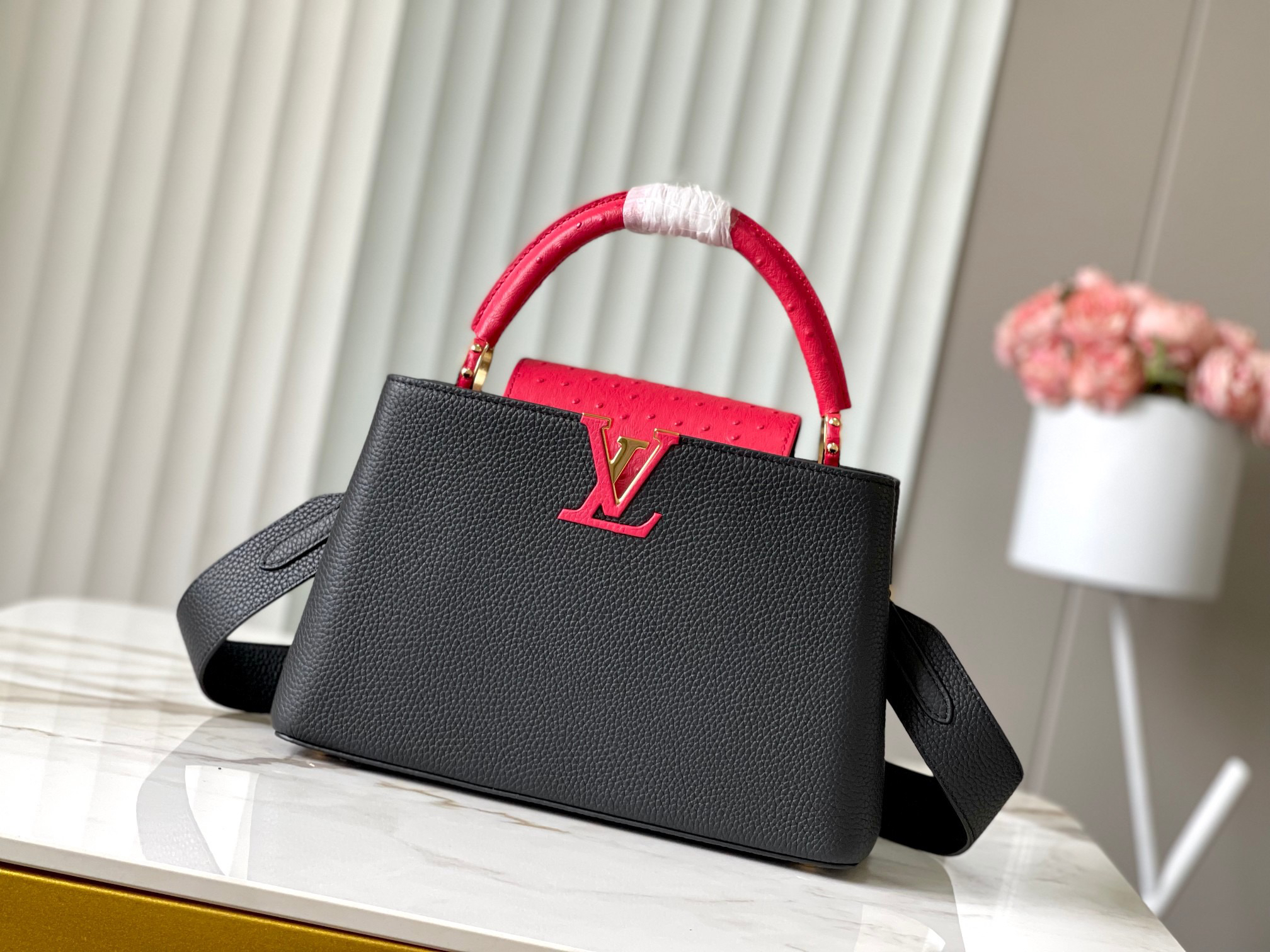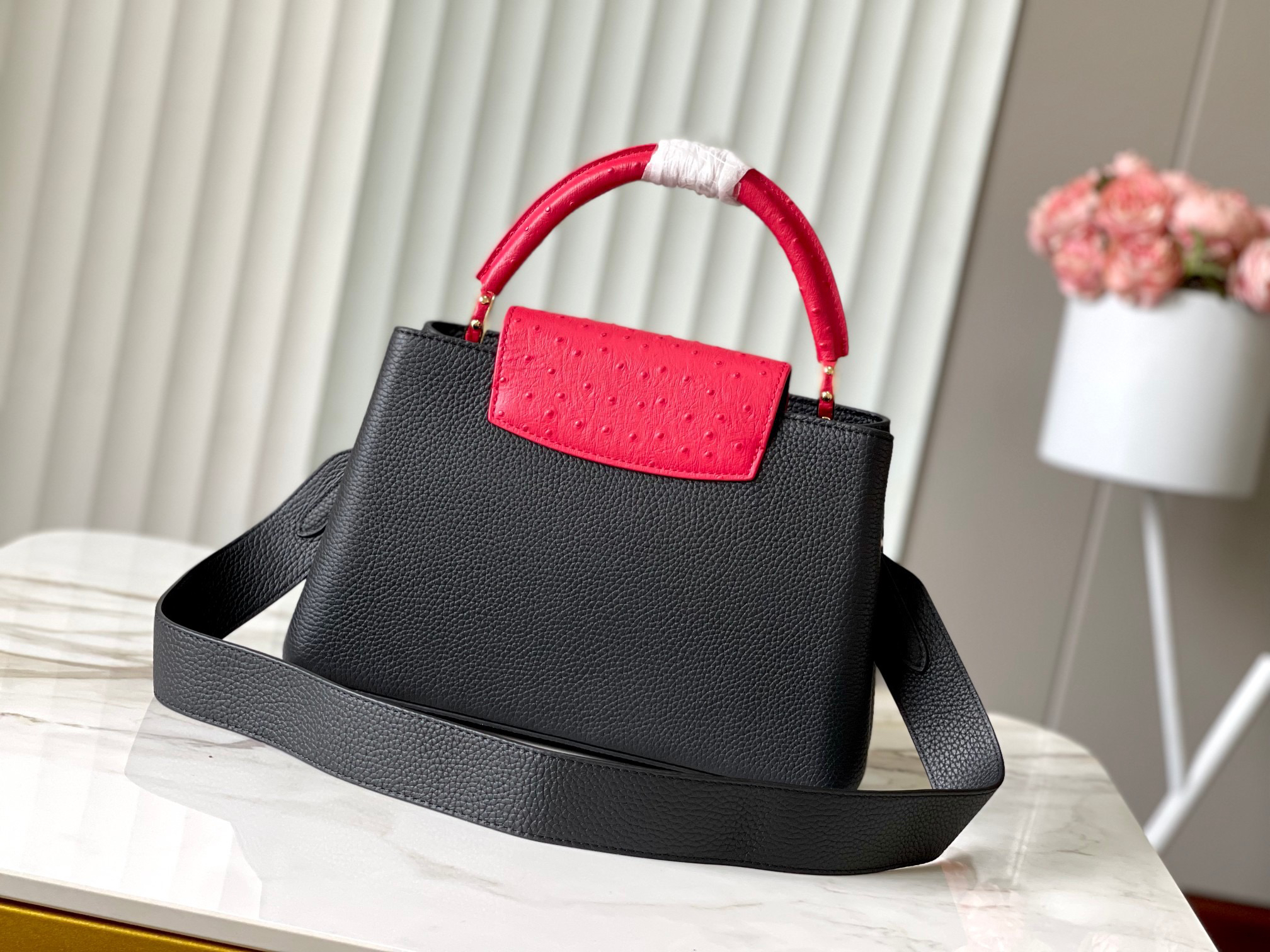 秋冬特惠💰1650 渠道级LV 新品 te级LV 全套包装 N82904/M48865黑拼红鸵鸟 本款 Capucines 手袋采用 Taurillon 皮革塑造玲珑构型 以鸵鸟皮革包裹翻盖、手柄和 LV 字母 翻盖可外置或内收以读取 LV 标识 可拆卸宽幅皮革肩带洋溢摩登风尚 Size:31.5 * 20 * 11 cm