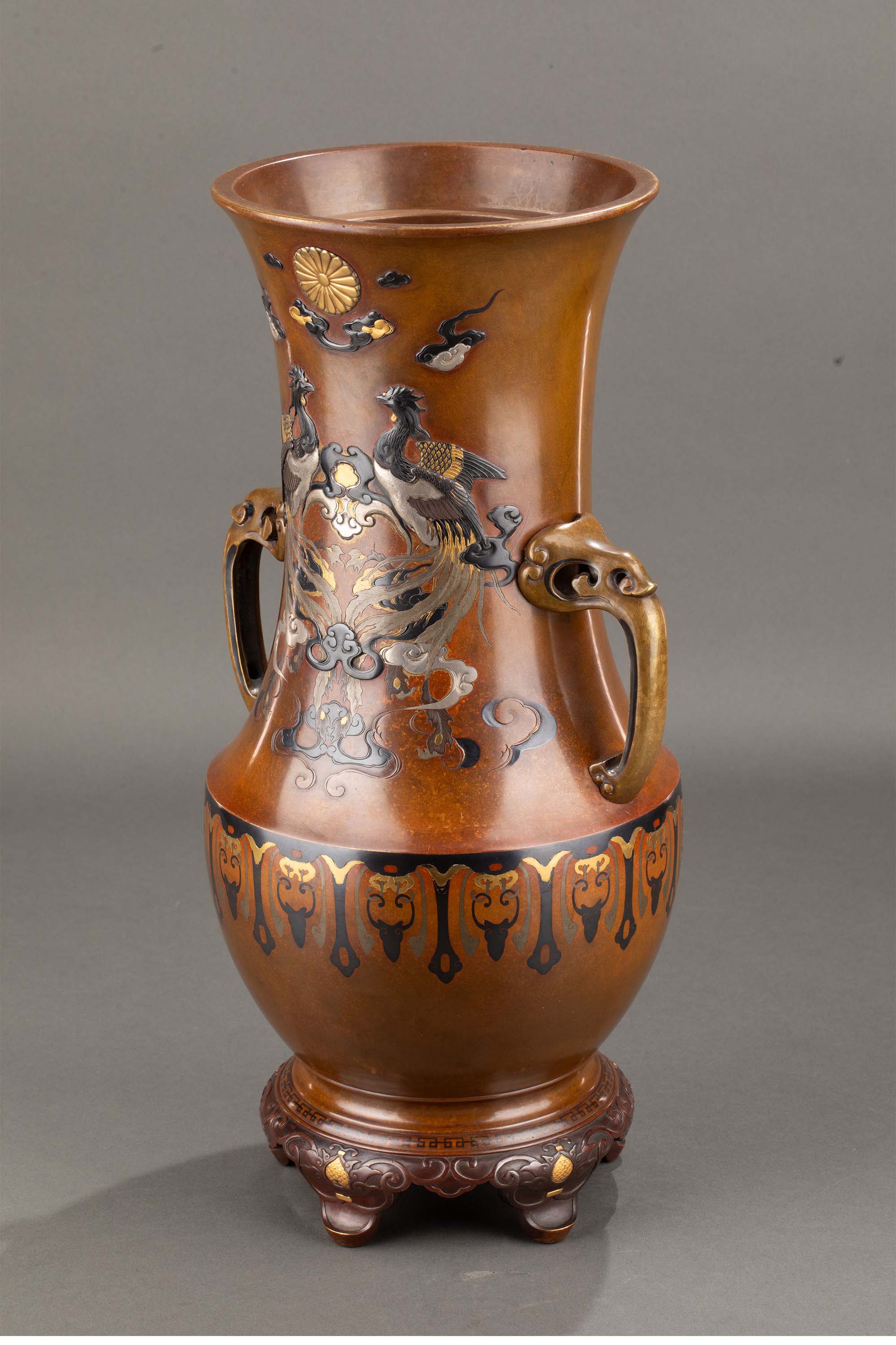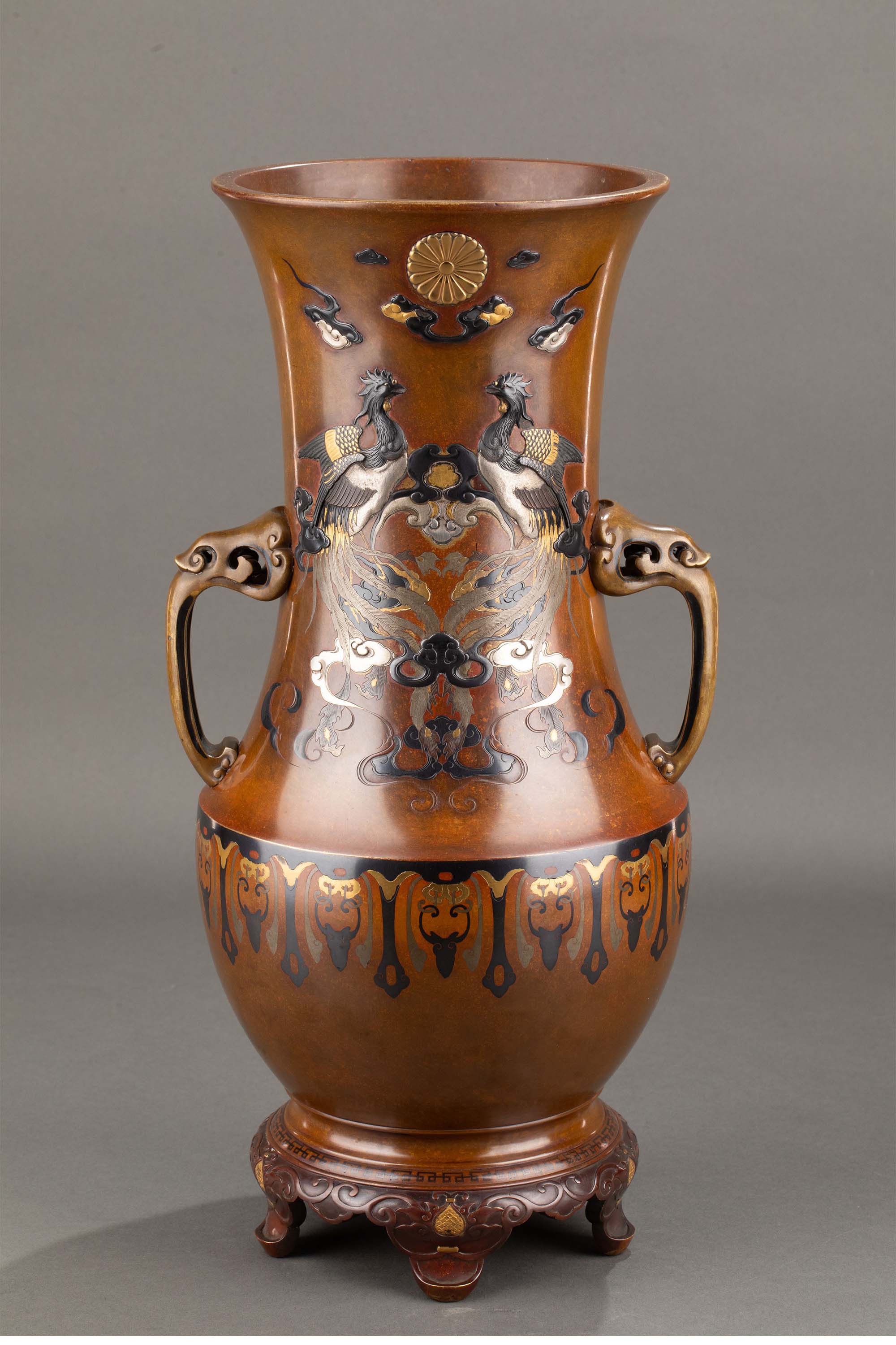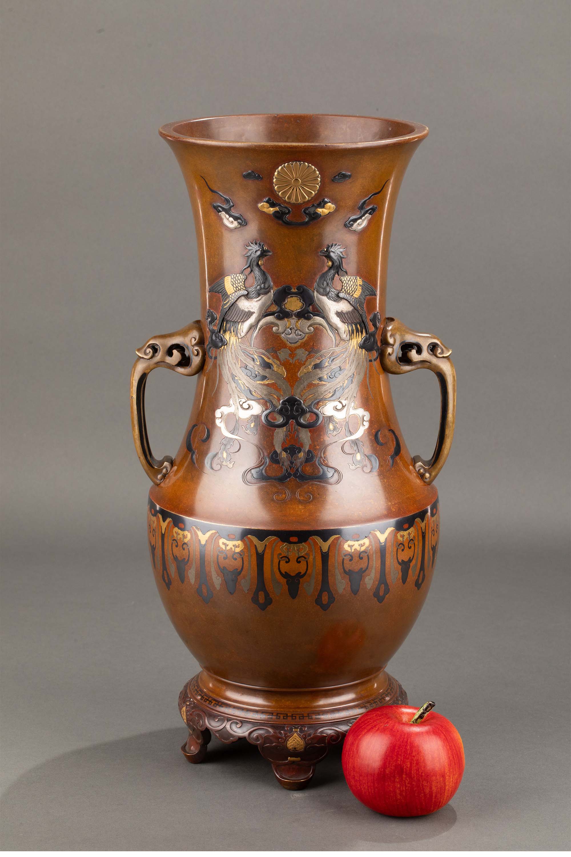 1880年代日本明治时期出品凤凰菊纹主题镀金银精雕装饰赤铜双耳花瓶 附原木盒