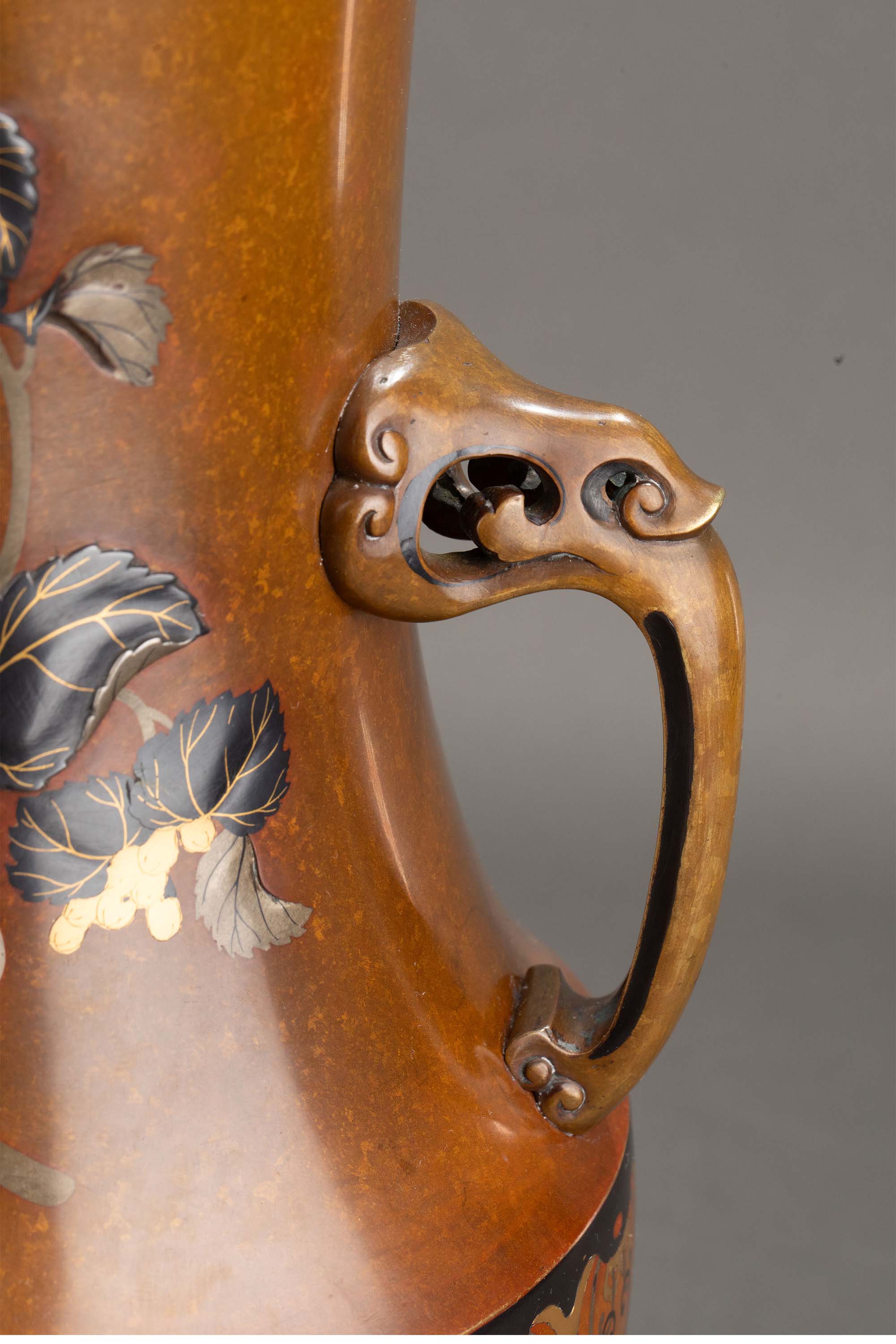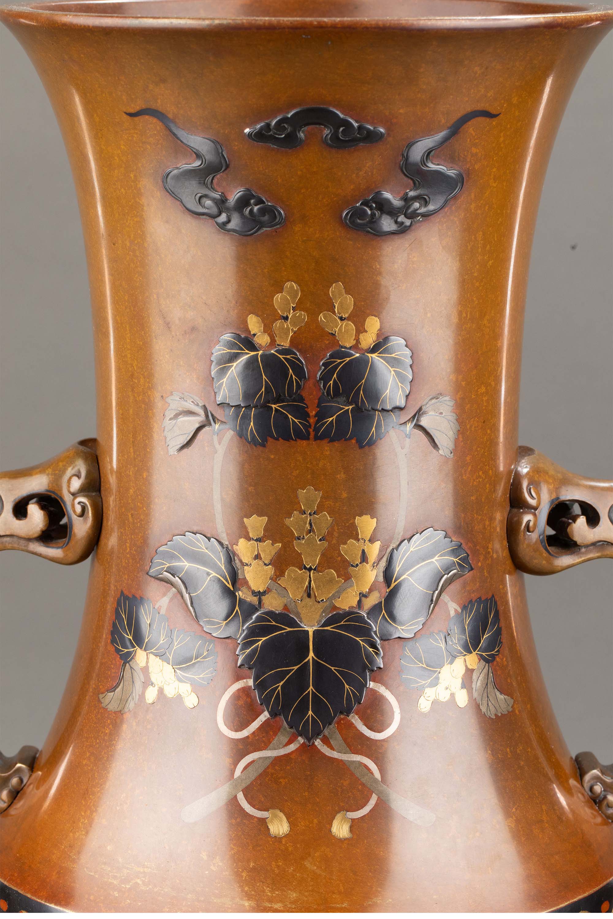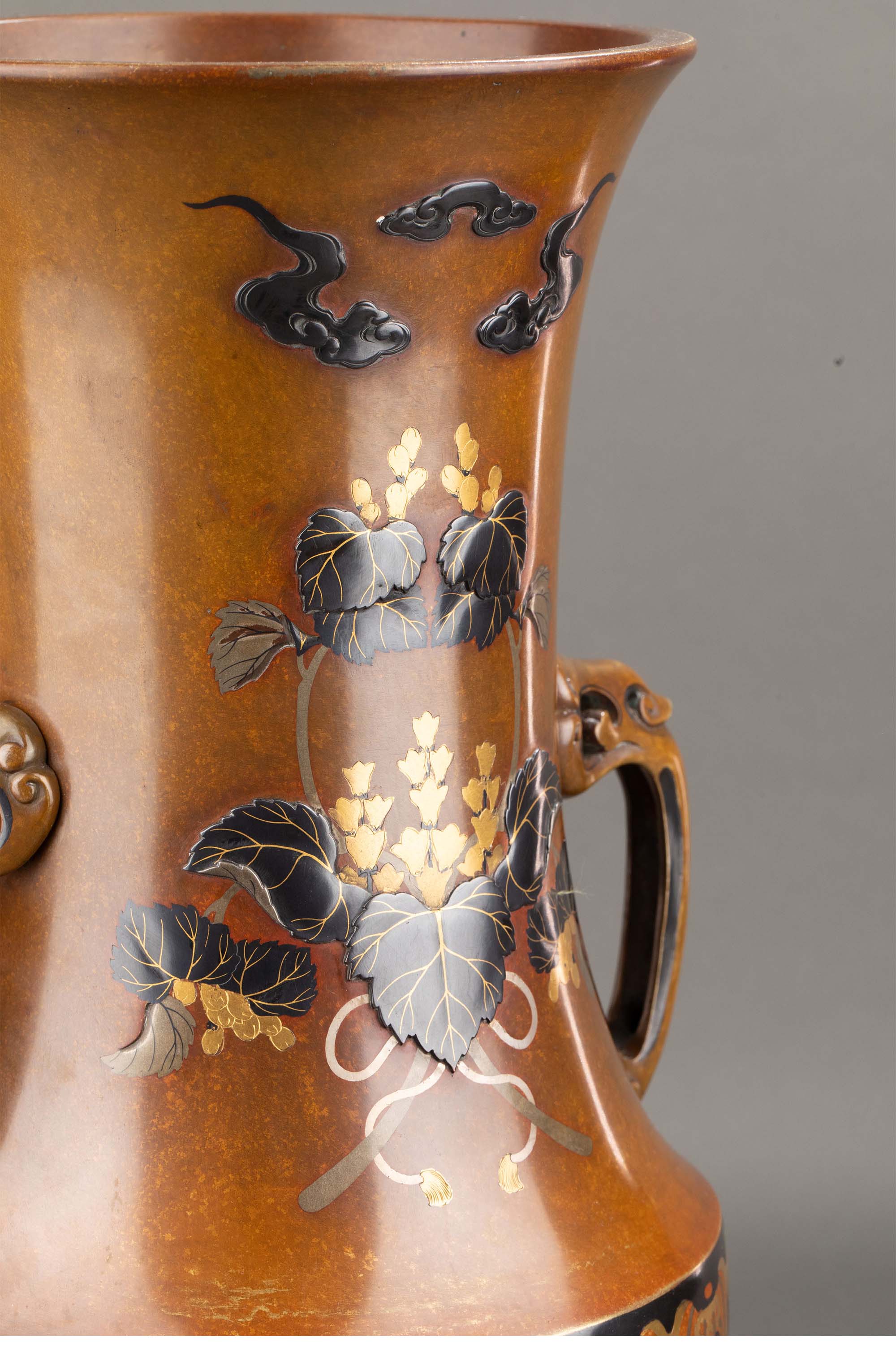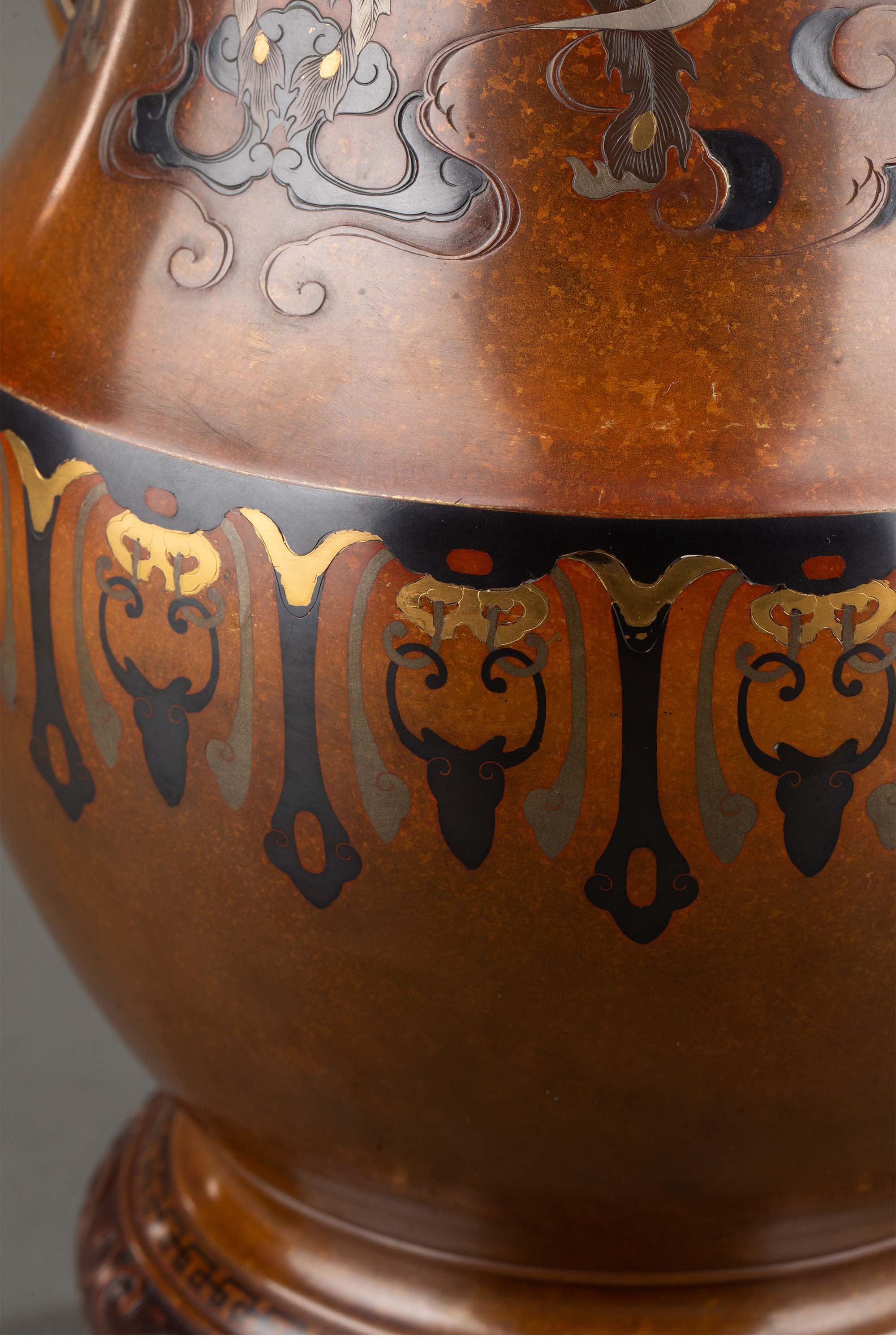 1880年代日本明治时期出品凤凰菊纹主题镀金银精雕装饰赤铜双耳花瓶 附原木盒