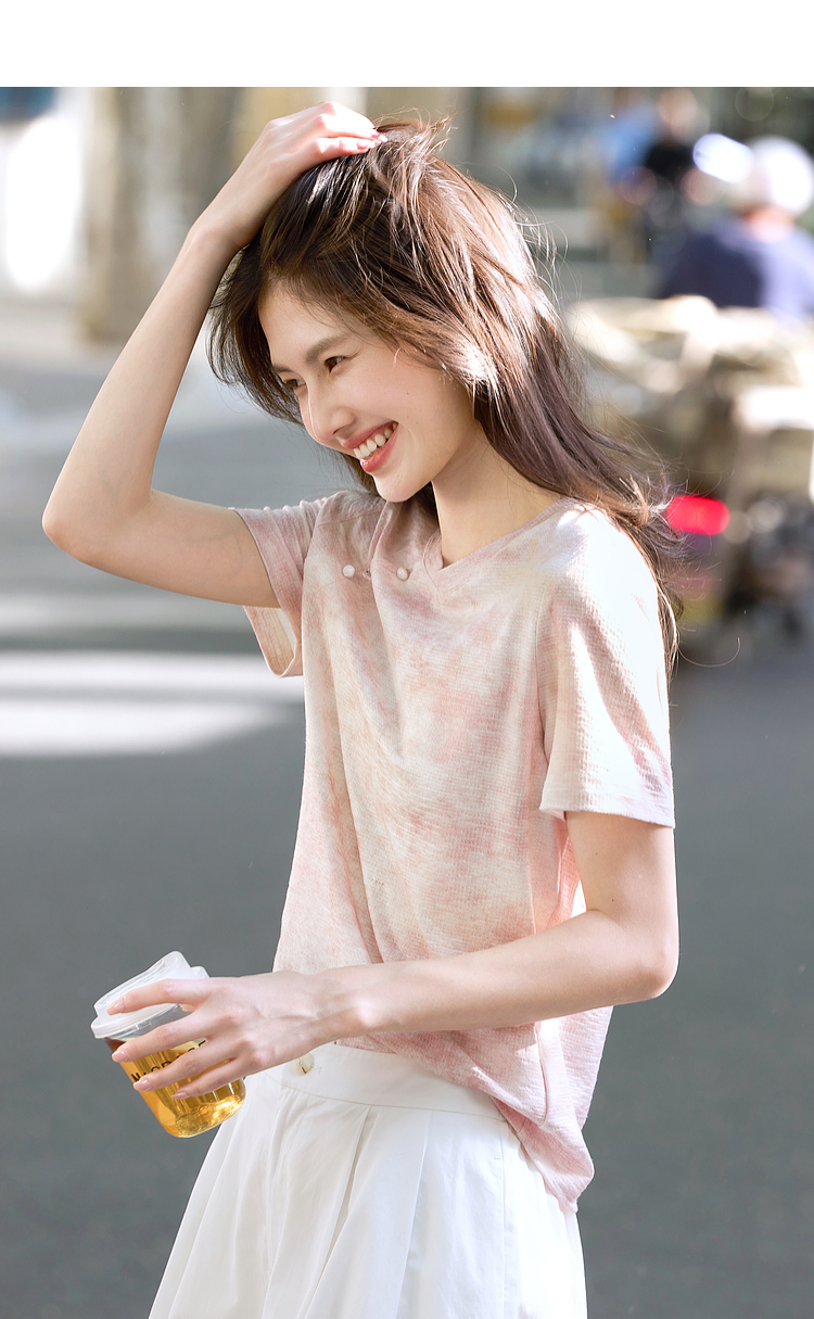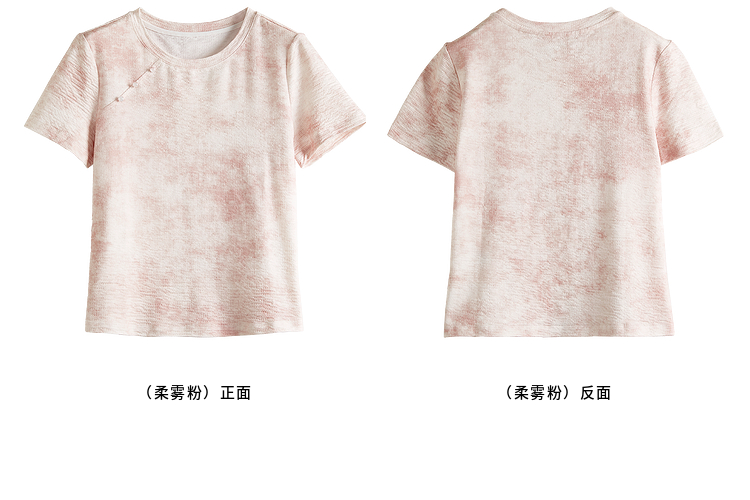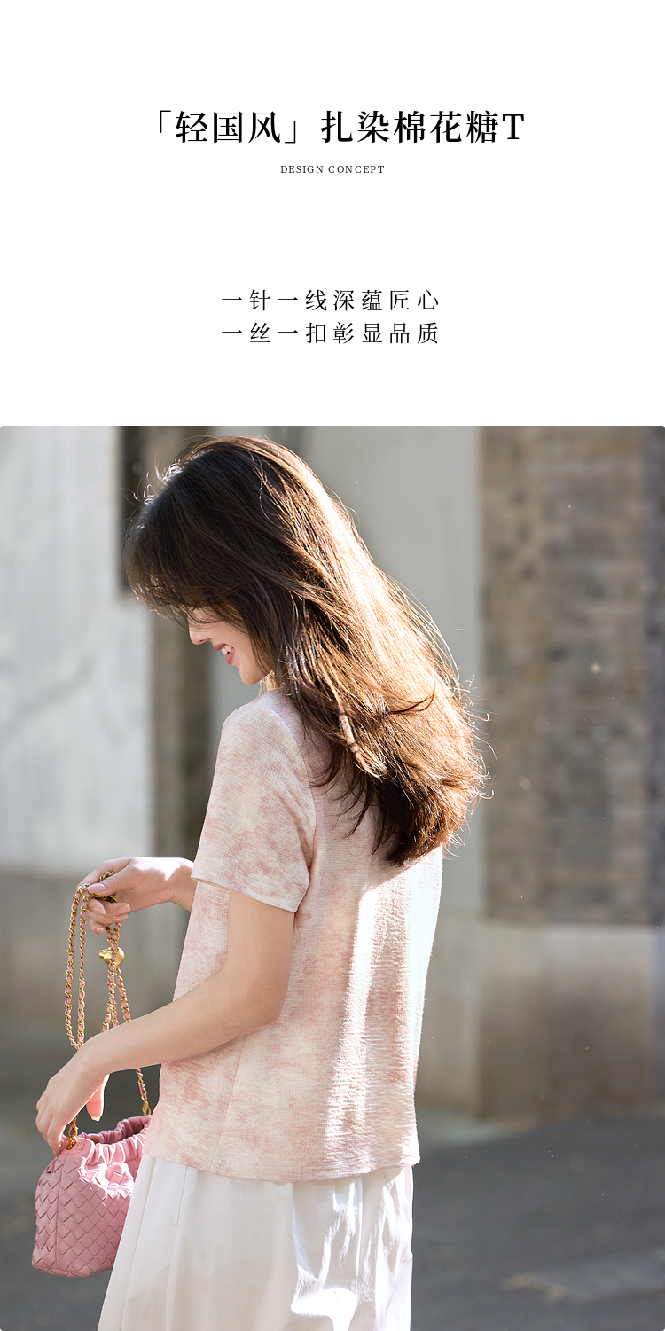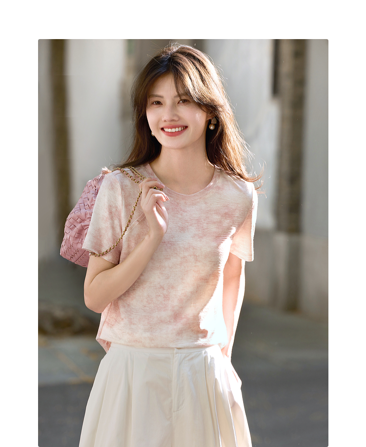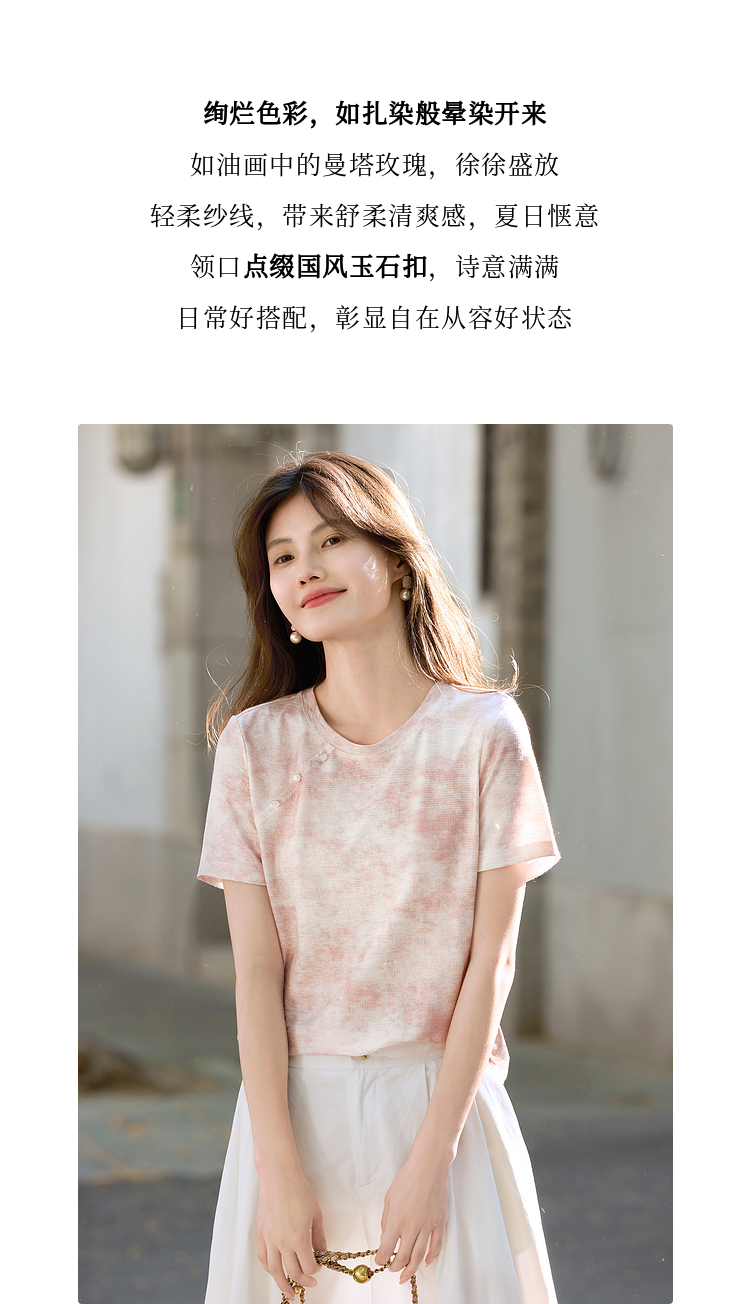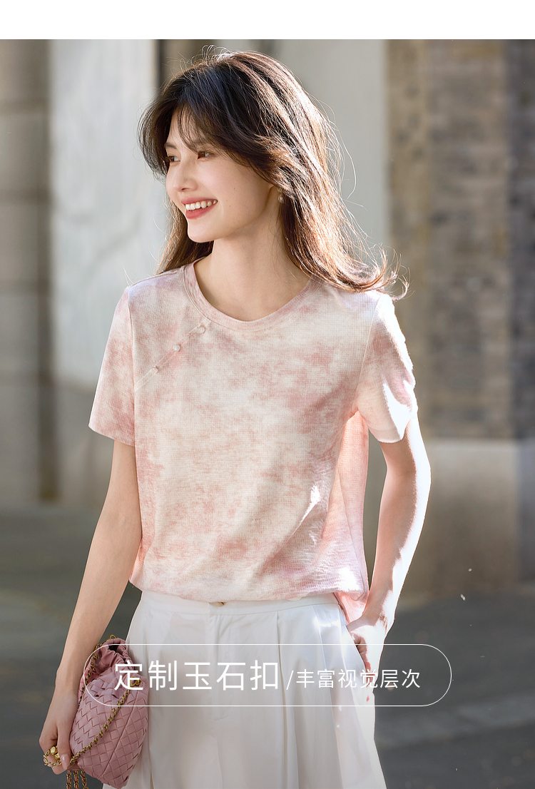 【专属特价】熙世界轻国风扎染晕染T恤女短袖2025夏新款宽松圆领独特粉色上衣