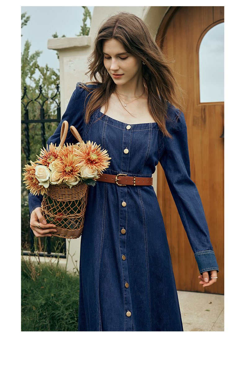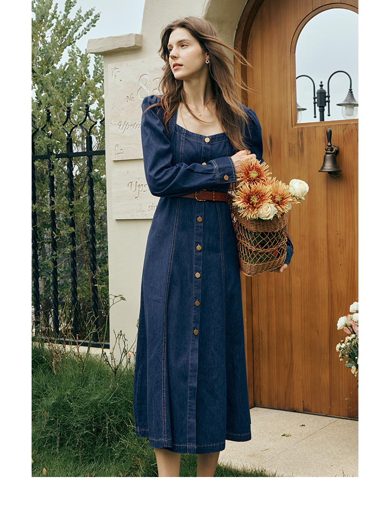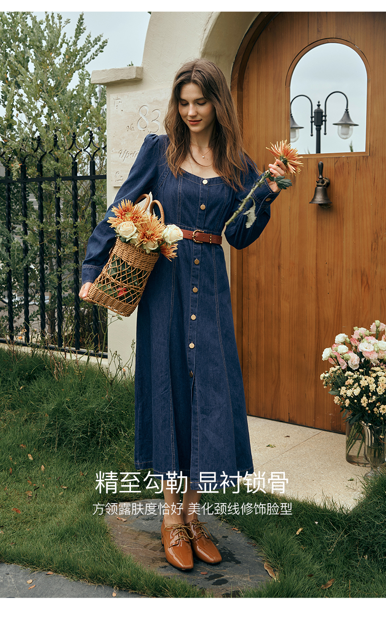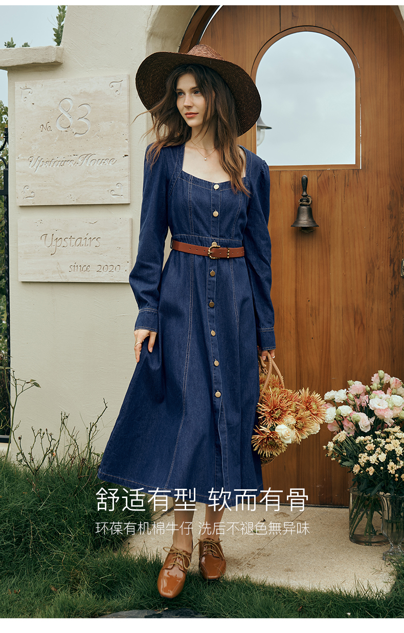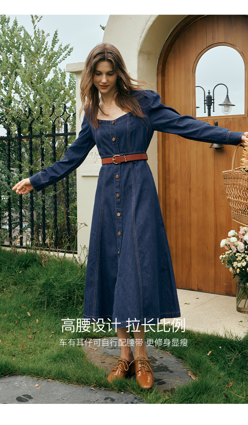 OLrain欧芮儿方领牛仔连衣裙女初秋2023年新款收腰复古一字肩裙子