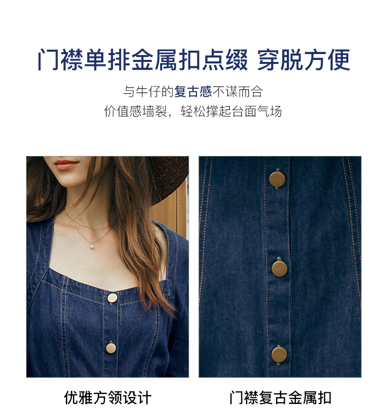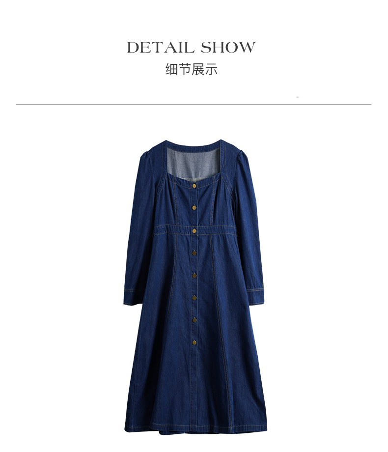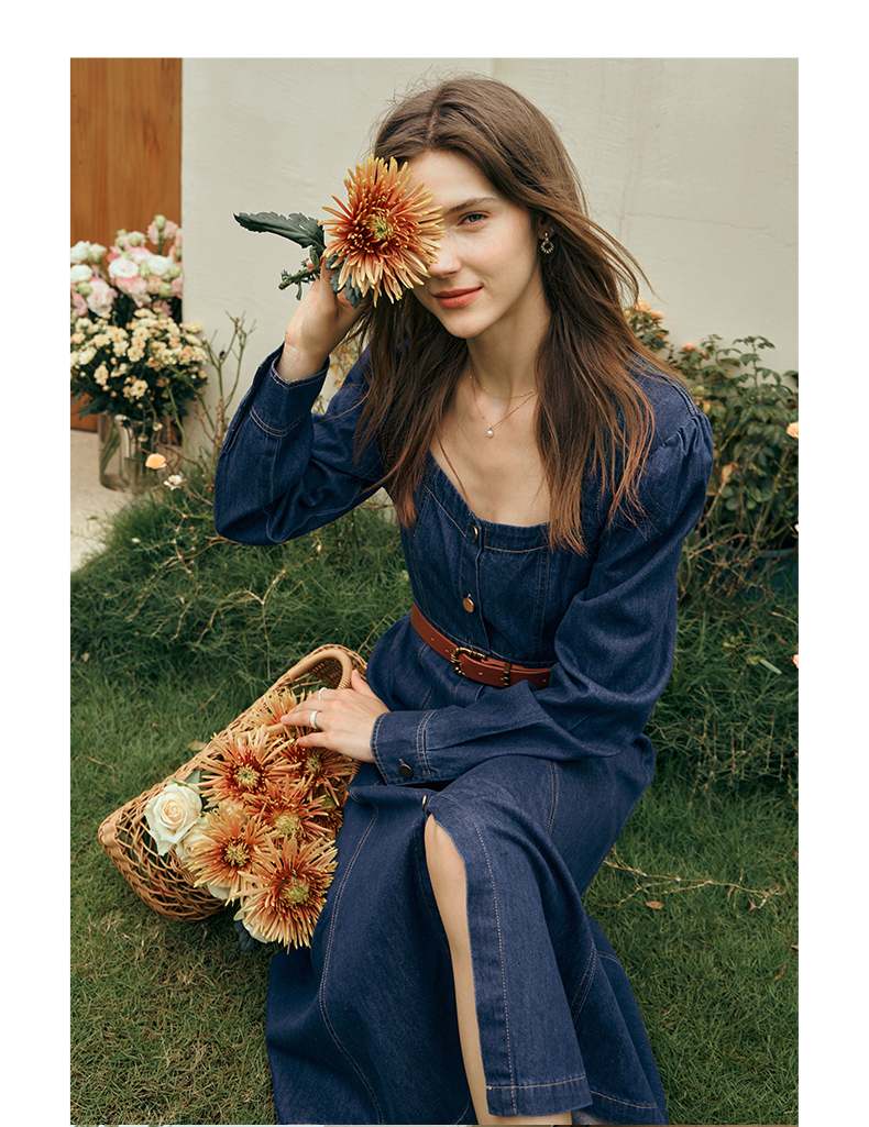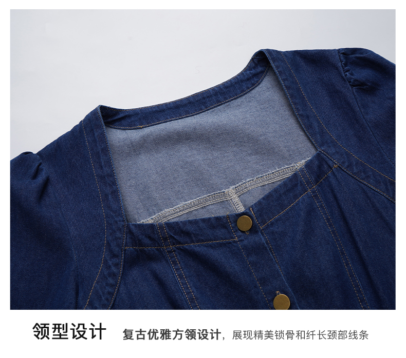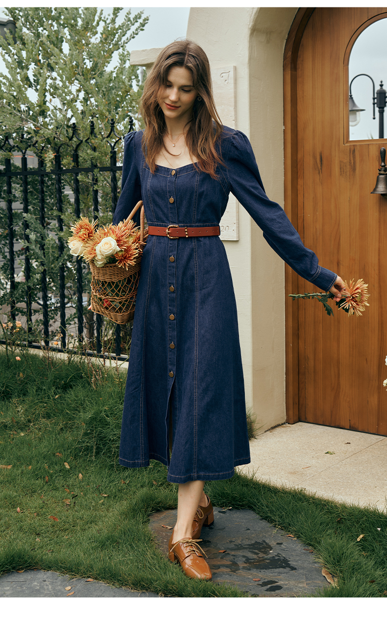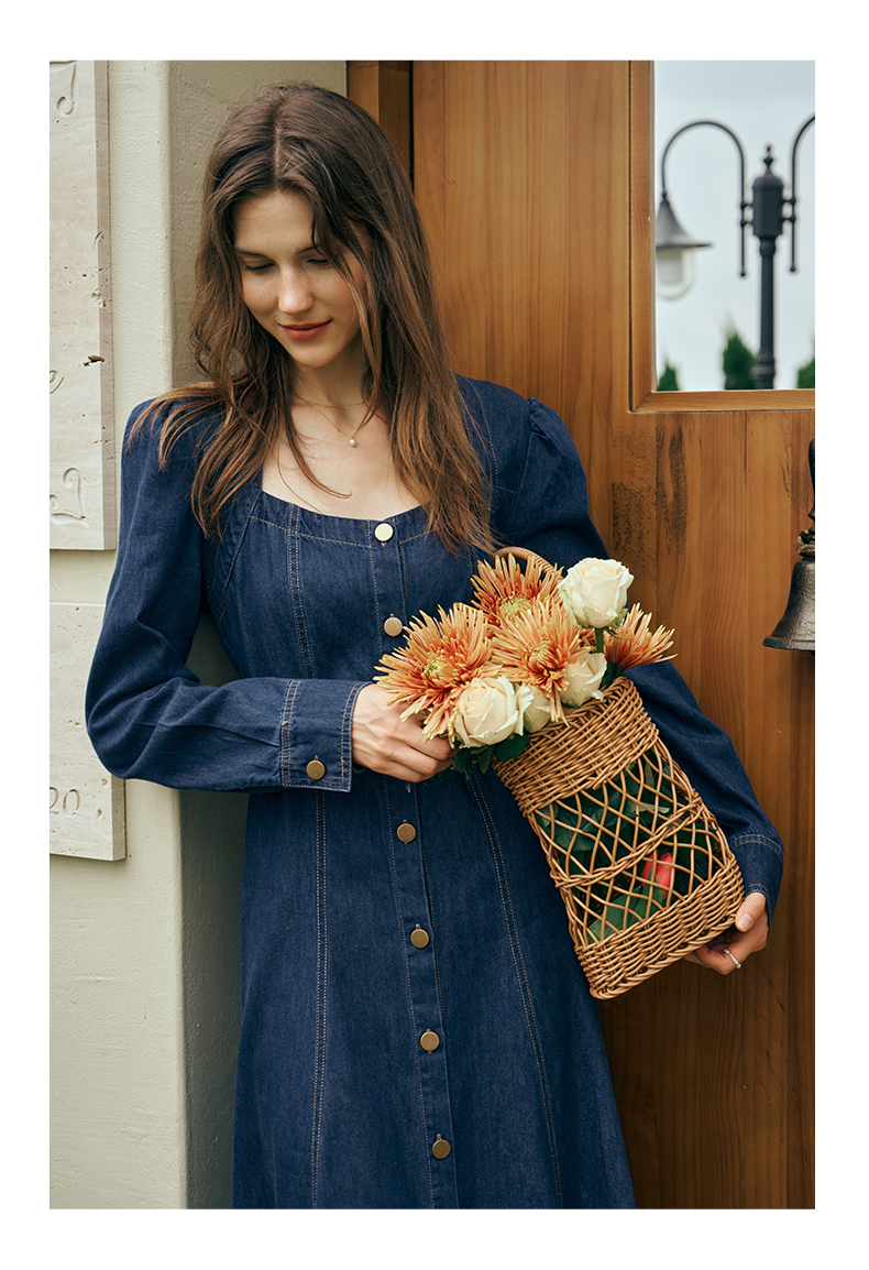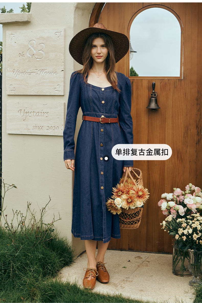 OLrain欧芮儿方领牛仔连衣裙女初秋2023年新款收腰复古一字肩裙子