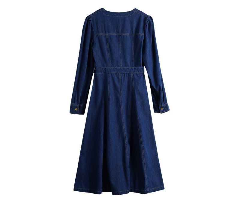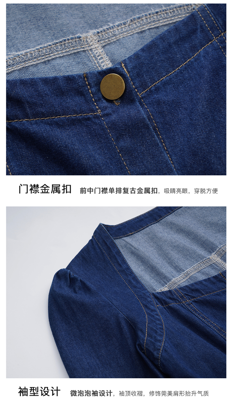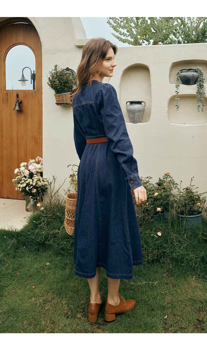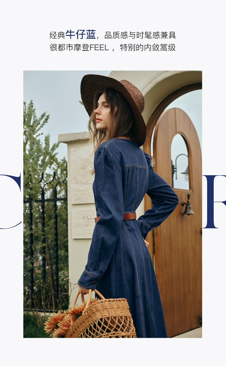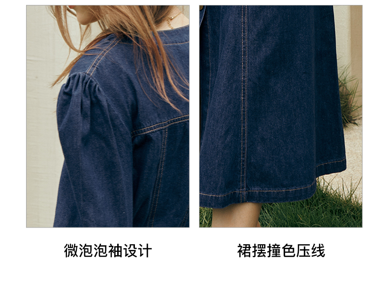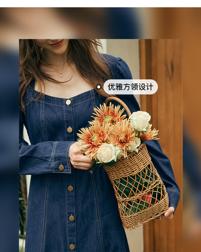 OLrain欧芮儿方领牛仔连衣裙女初秋2023年新款收腰复古一字肩裙子