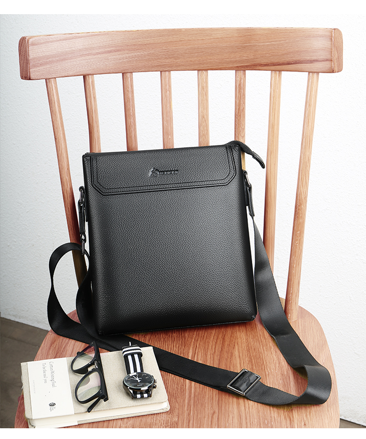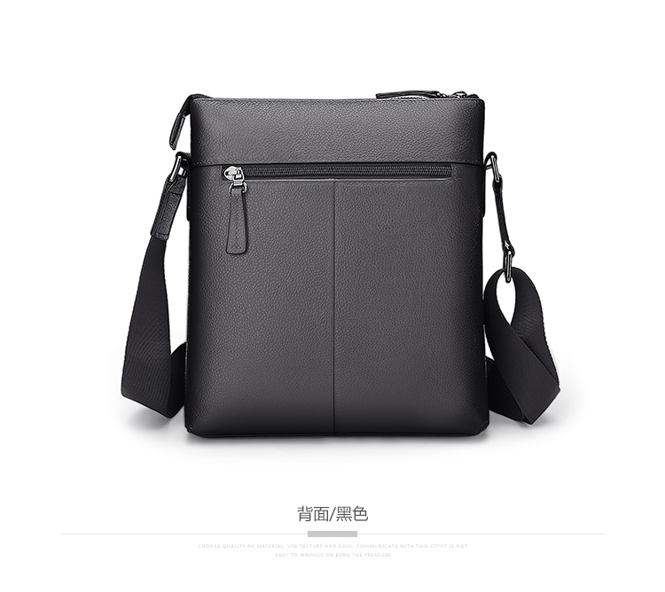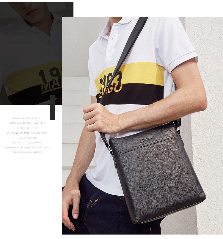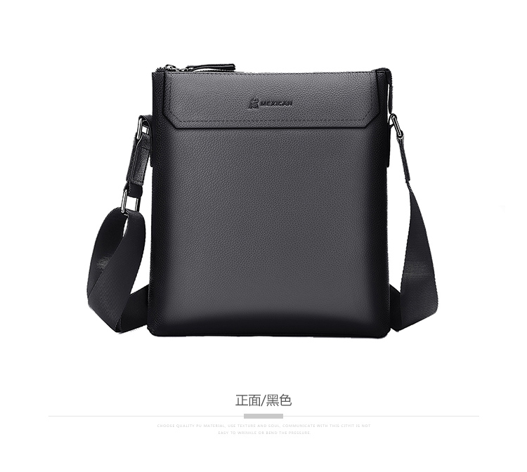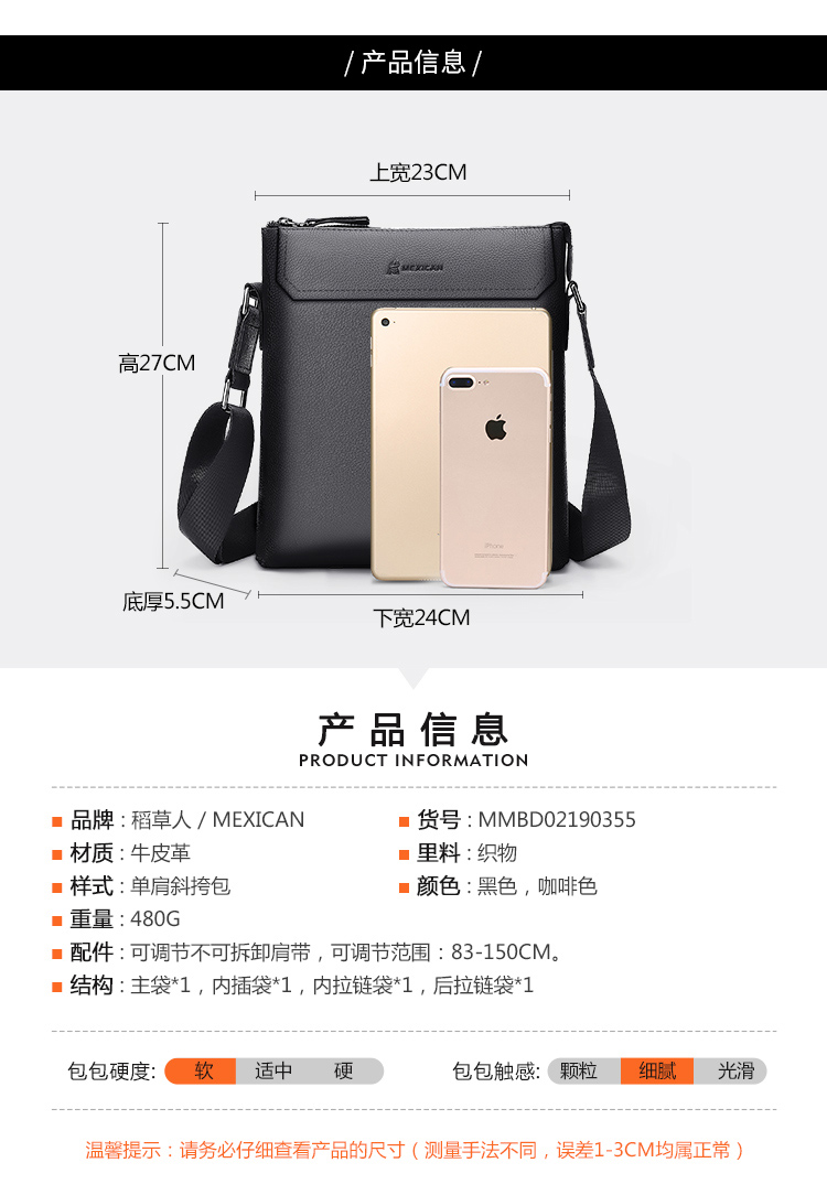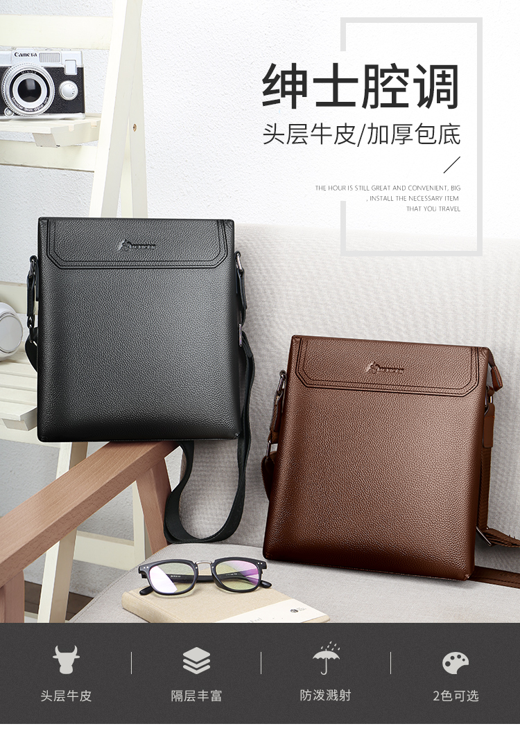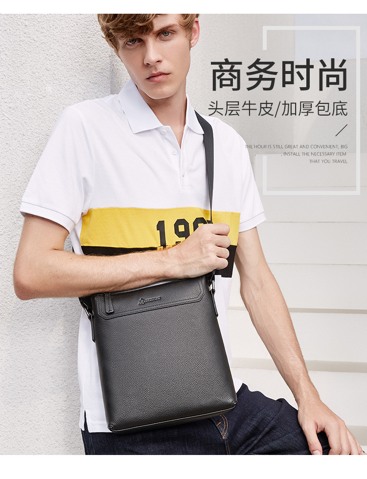 稻草人(MEXICAN)真皮男包男士单肩包头层牛皮竖款商务休闲单肩斜挎包小方包MMBD02190355黑色