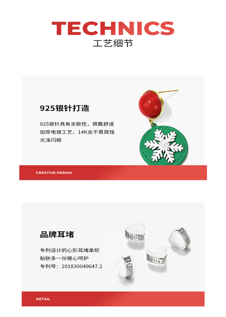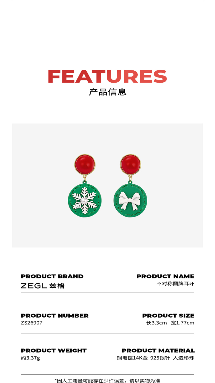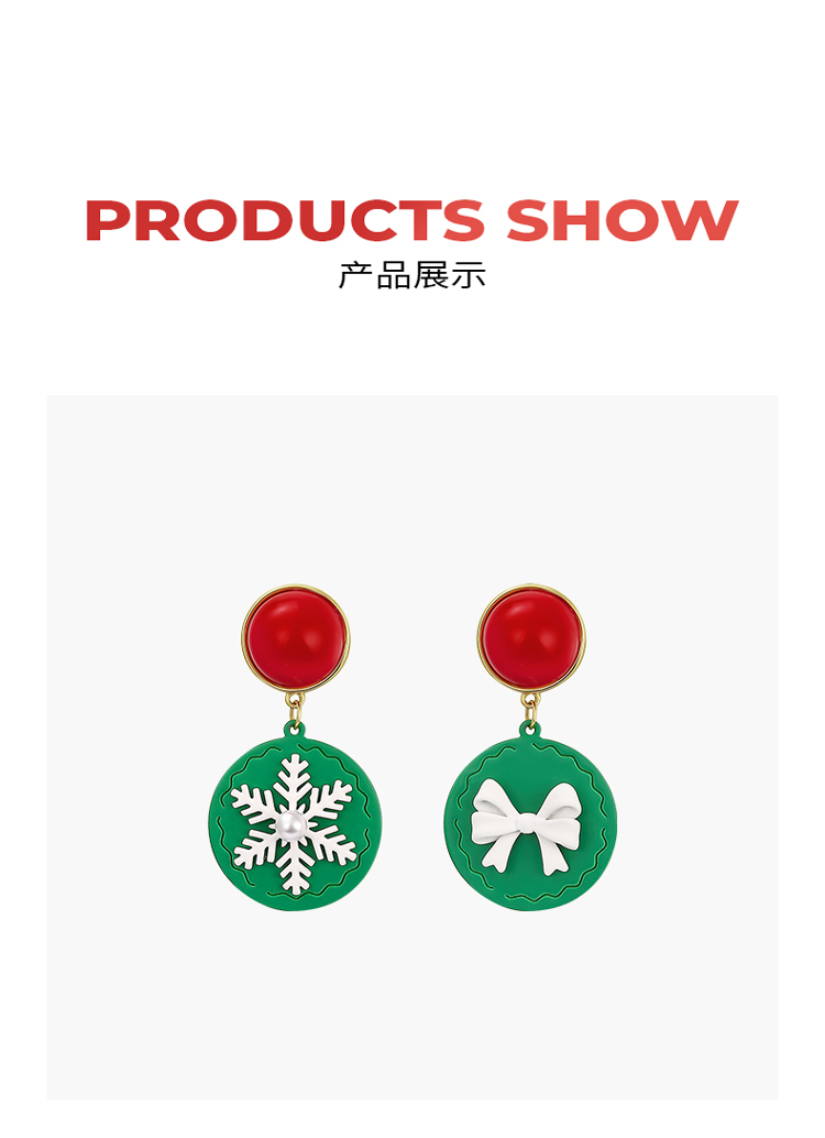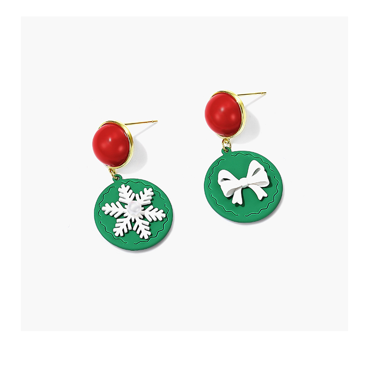 ZEGL圣诞雪花蝴蝶结耳环女绿色饼干耳钉气质925银针秋冬季耳饰品