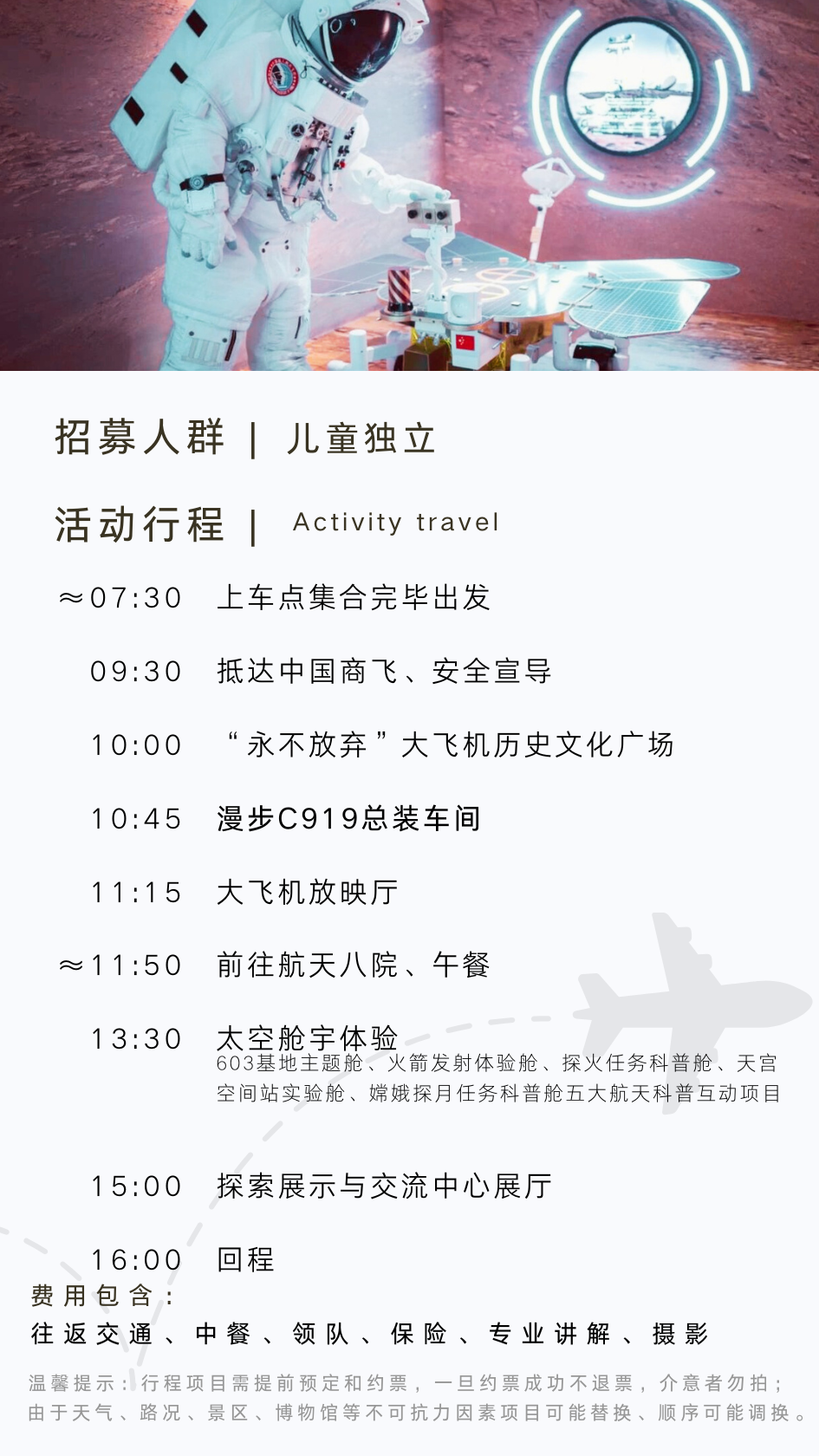 孩子志 | C919航天梦 航天探索营 1天 5/24(周六)、6/15(周日) 儿童独立/亲子陪同, 走进中国商飞、航天八院,探秘蓝天之旅..