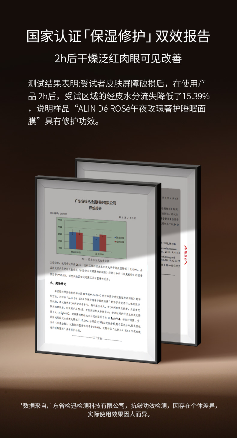 仅仅在使用午夜睡眠面膜2h过后,皮肤受试区域的经皮水分流失就降低了15.39%!皮肤屏障受损区域肉眼可见的泛红被修护。