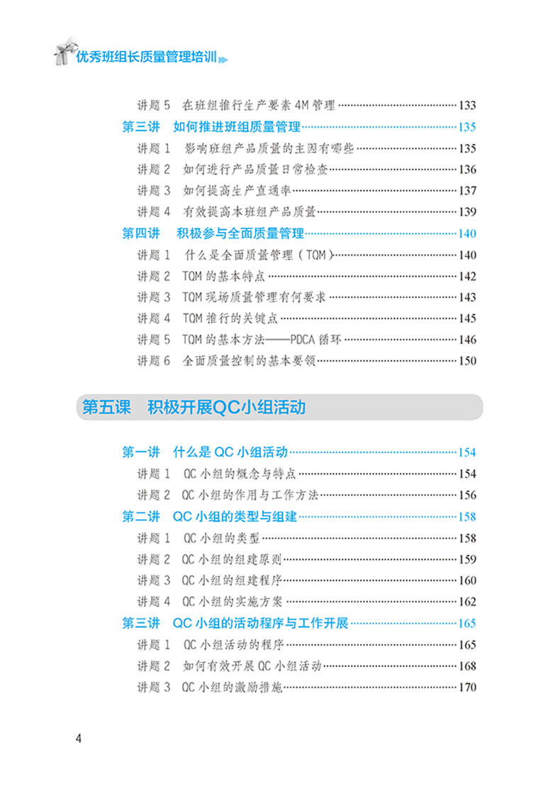 本次修订的“优秀班组长”系列图书,共包含5册,分别为《优秀班组长现场管理培训》《优秀班组长人员管理培训》《优秀班组长安全管理培训》《优秀班组长质量管理培训》和《优秀班组长基础管理培训》。