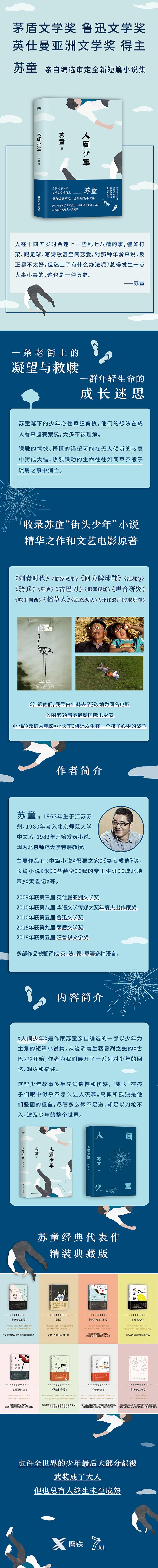《人间少年》是作家苏童亲自编选的一部以少年为主角的短篇小说集。从流淌着生猛暴烈之感的《古巴刀》开始,作者为我们展开了一系列对少年的回忆、想象和描述:他们叛逆,敢于向约束自身的环境反抗;他们孤独,龋龋独行在人群之外;他们的思维简单又极易错乱,仿佛一块暴露在阳光下的锐利玻璃碎片,光亮夺目,可一碰就划开了口子,沾上了鲜血。这些少年故事多半充满遗憾和伤感,“成长”在孩子们眼中似乎不怎么让人羡慕。高傲和孤独是他们坚固的堡垒,尽管多么微不足道,却足以刀枪不入,波及少年的整个世界。