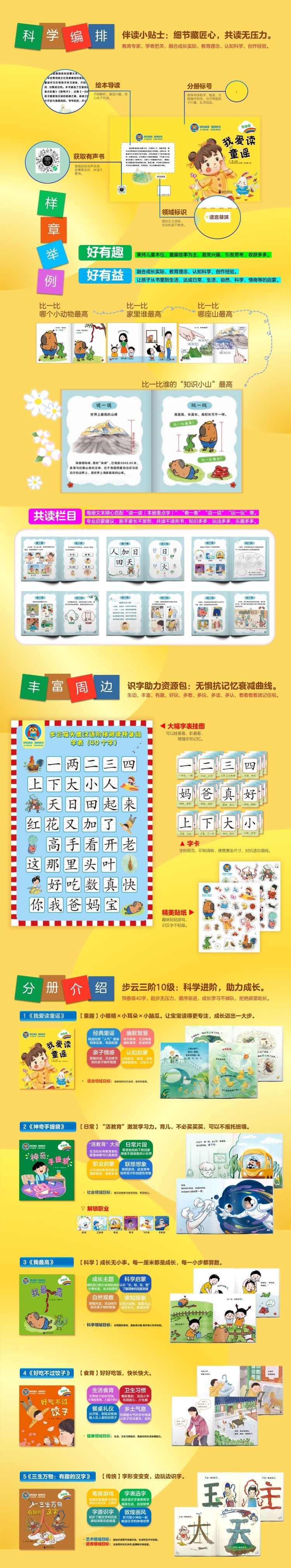 特别设计阅读指导,匹配幼儿园小学的教育目标,配有字卡、知识挂图等互动周边,小白家长、家里老人轻松上手,伴读不迷路,真正实现高效共读。