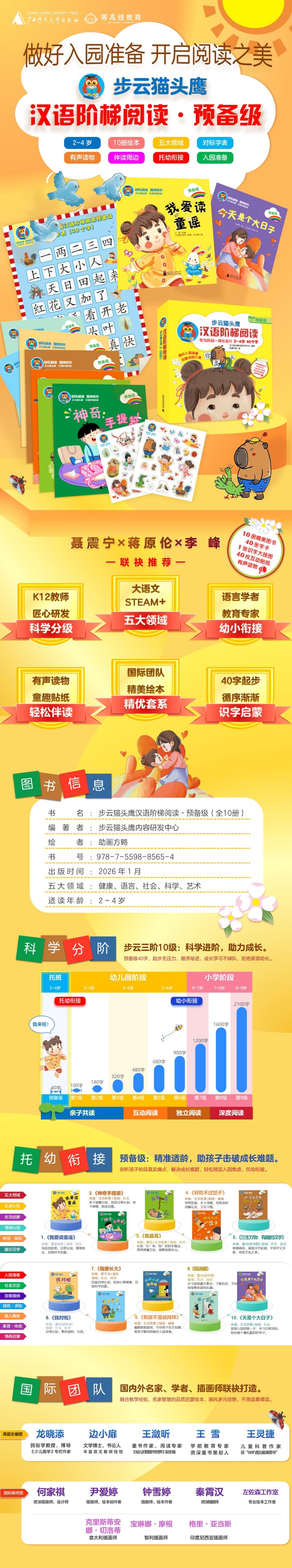 《步云猫头鹰汉语阶梯阅读·预备级》含10册趣味故事绘本,遵循2~4岁婴幼儿认知发展特点,从身心成长、习惯养成、社会认知、情感交流等方面入手,激发幼儿对汉字语音、字形的好奇心;题材以日常生活为主,涵盖多元主体,可以丰富幼儿的所见、所闻、所感、所思,培养他们的阅读兴趣和阅读习惯,科学引导他们做好入园准备。