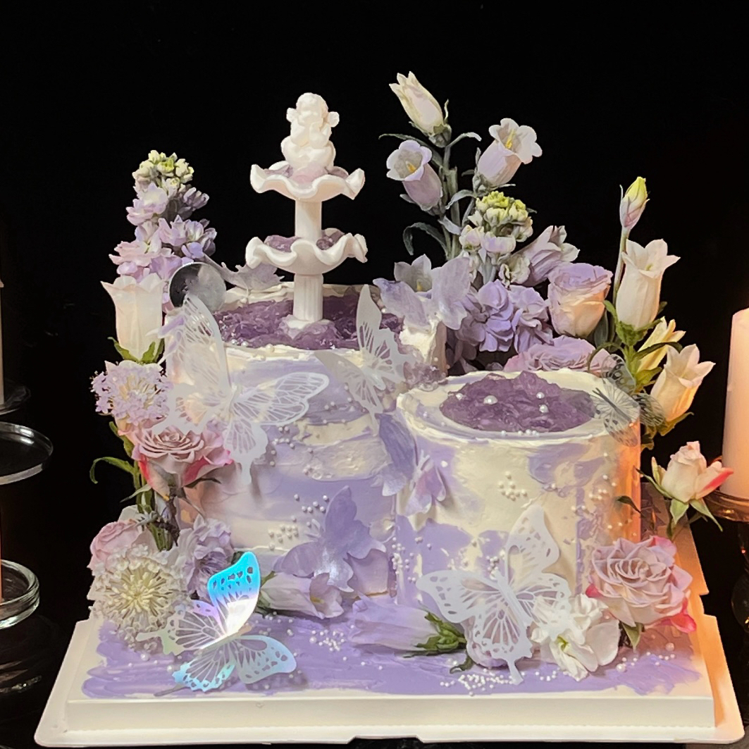 蛋糕四周簇拥着鲜花