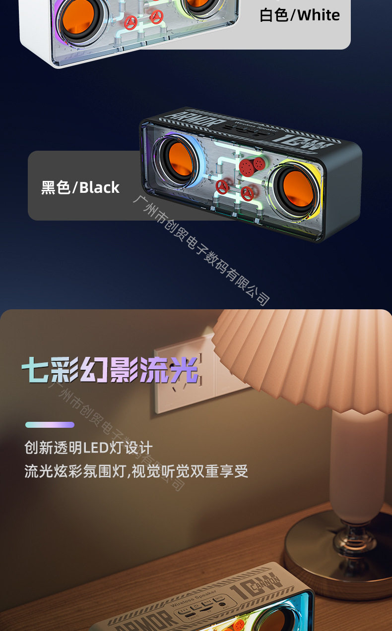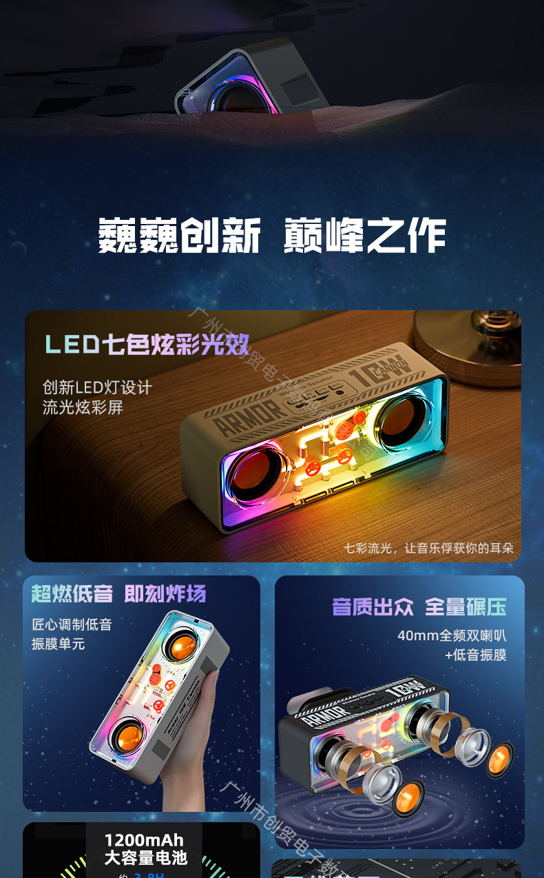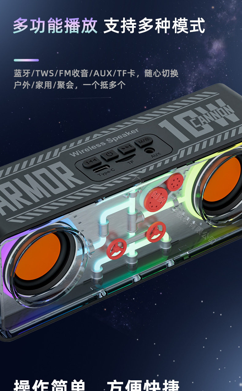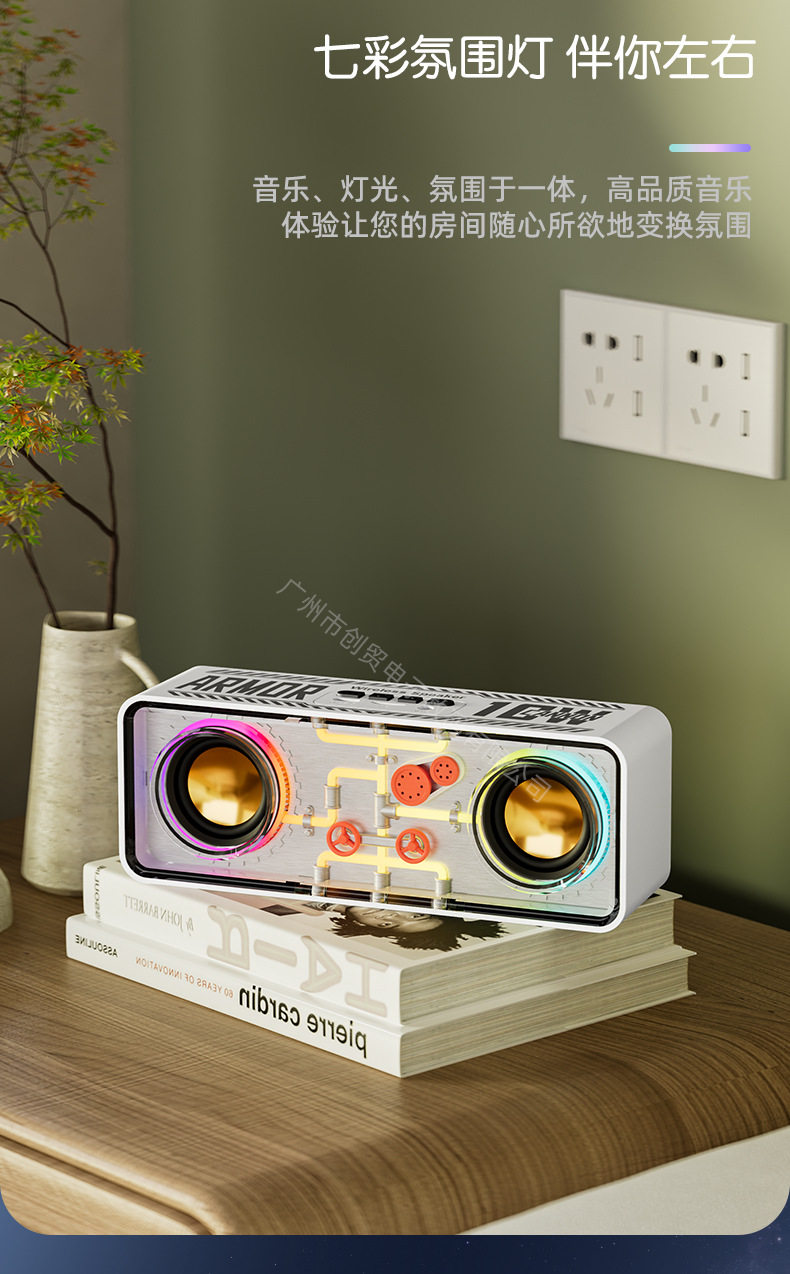 双喇叭透明机甲无线蓝牙音箱赛博朋克风炫彩灯小钢炮低音振膜音响