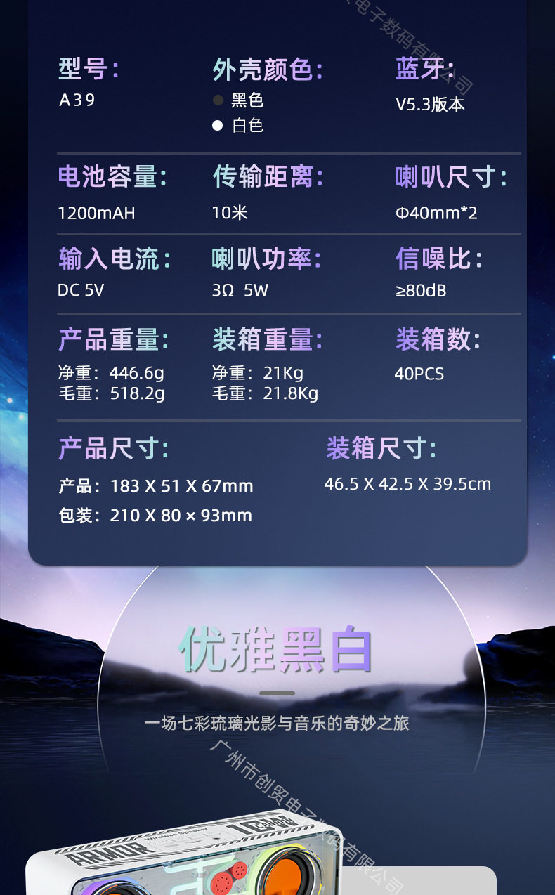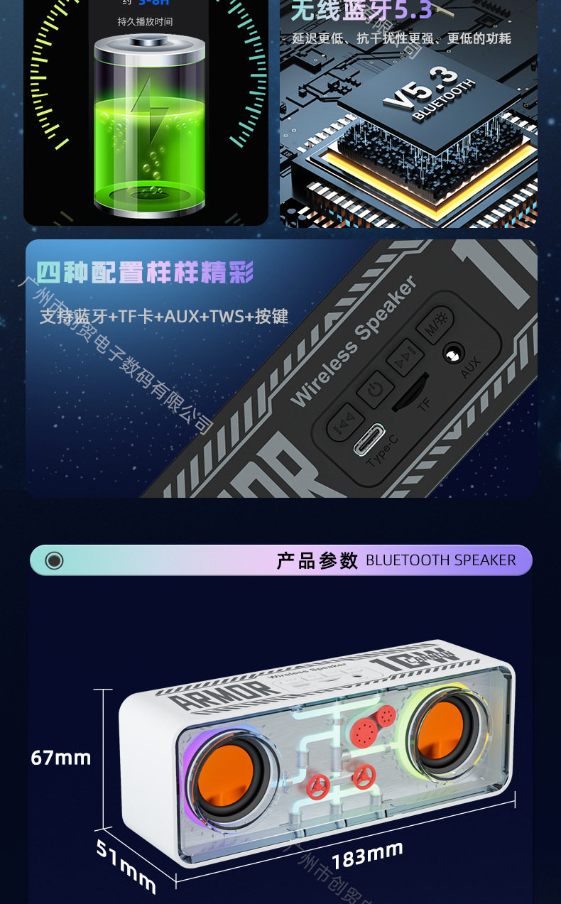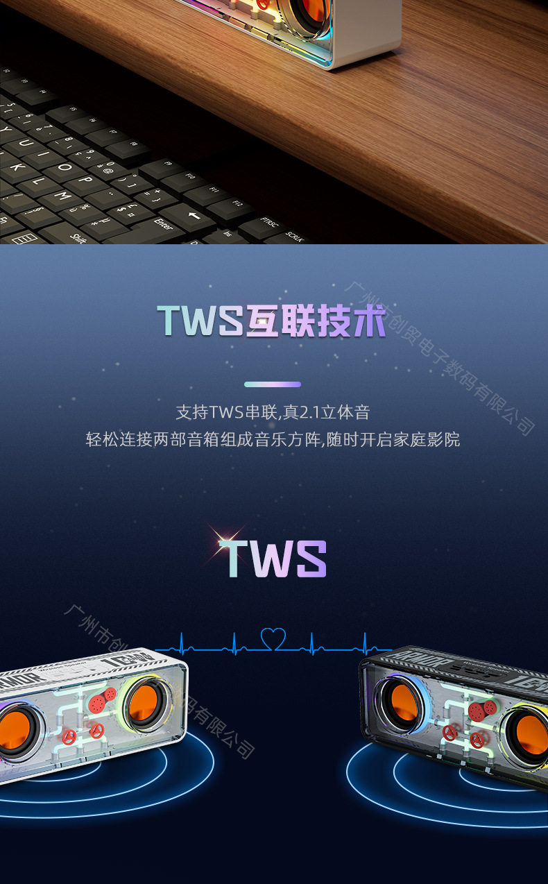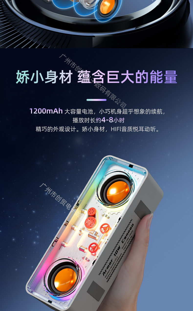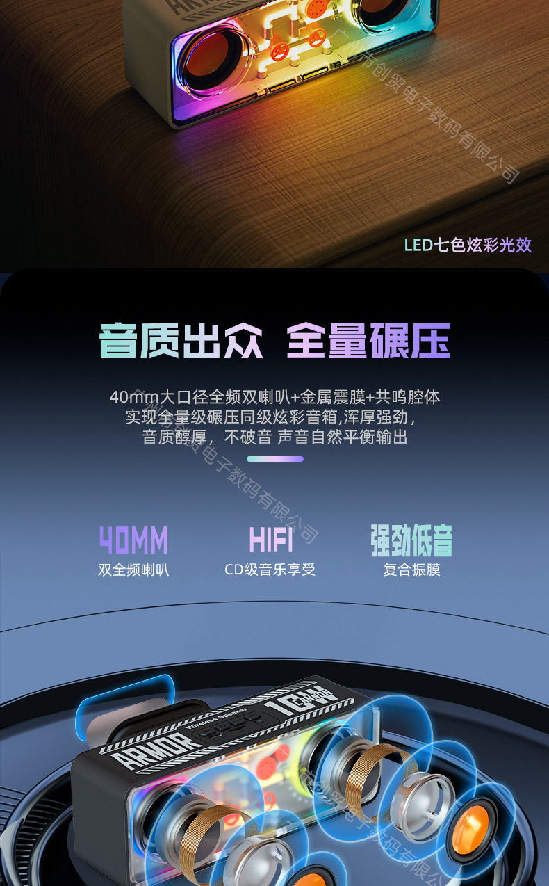 双喇叭透明机甲无线蓝牙音箱赛博朋克风炫彩灯小钢炮低音振膜音响